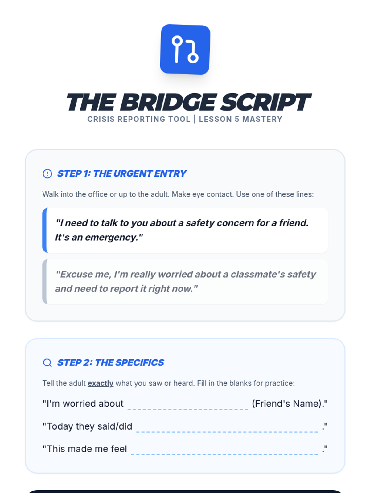 A lesson focused on identifying personal support systems and practicing specific scripts for seeking help during bullying or unsafe situations. Students create a visual map of their "army" and role-play the "nuclear option" for immediate intervention.