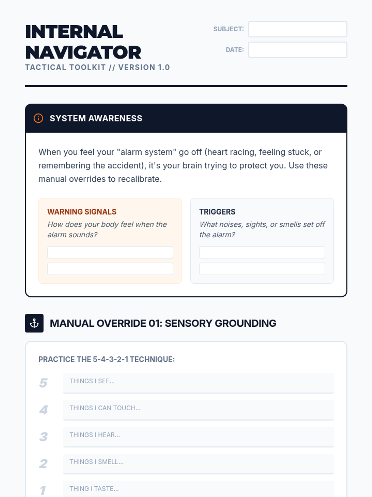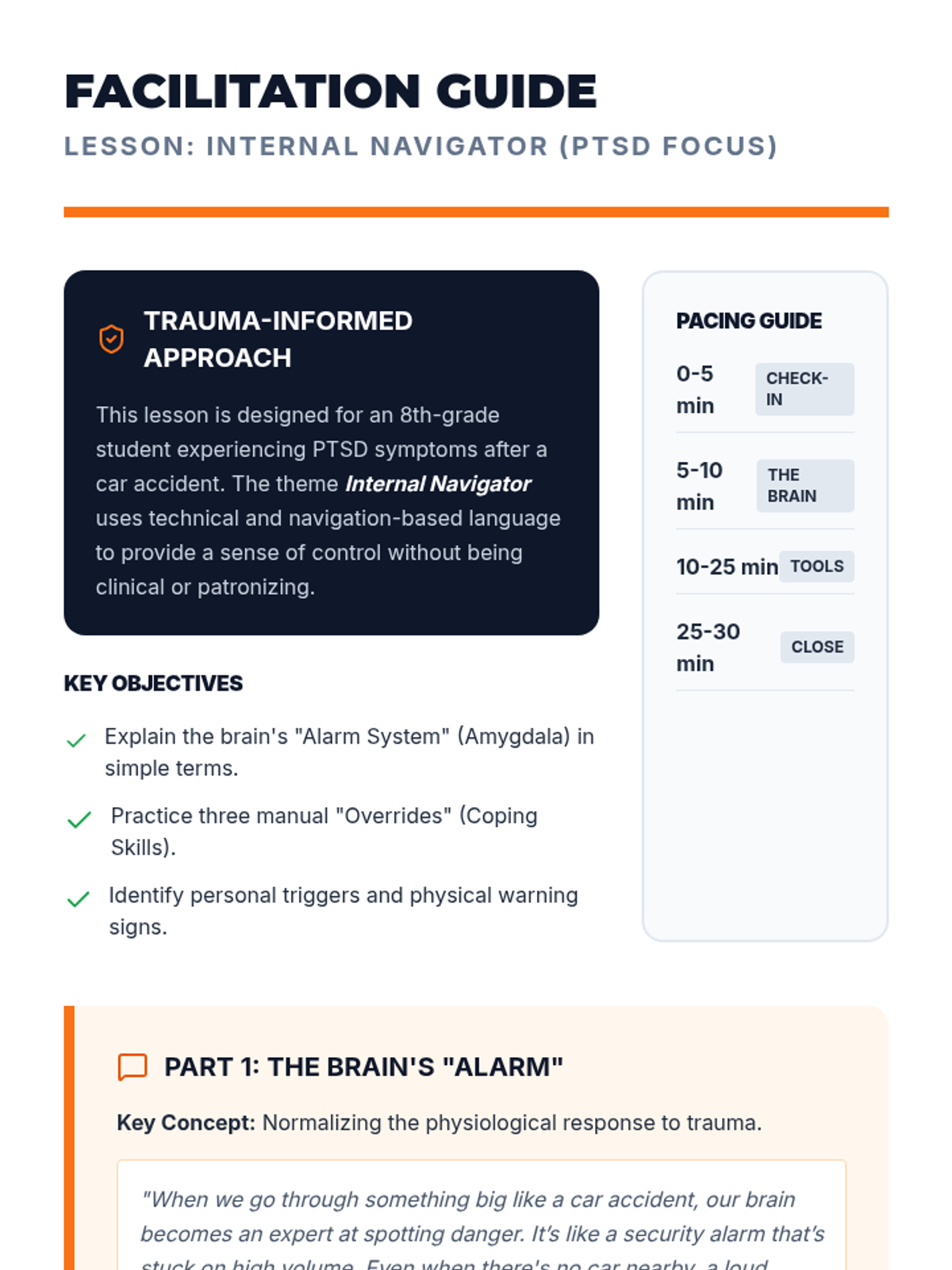 A 30-minute trauma-informed lesson for an 8th-grade student focusing on understanding PTSD symptoms following a car accident and building a personalized 'Internal Navigator' toolkit of coping strategies.
