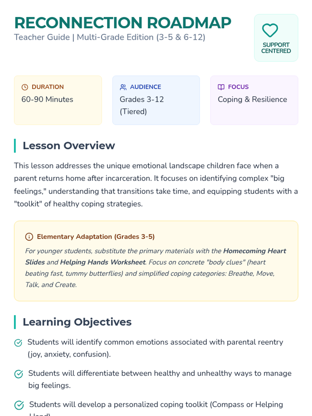 A comprehensive lesson designed to help children navigate the complex emotions and transitions associated with parental post-incarceration, focusing on building healthy coping strategies and support networks.