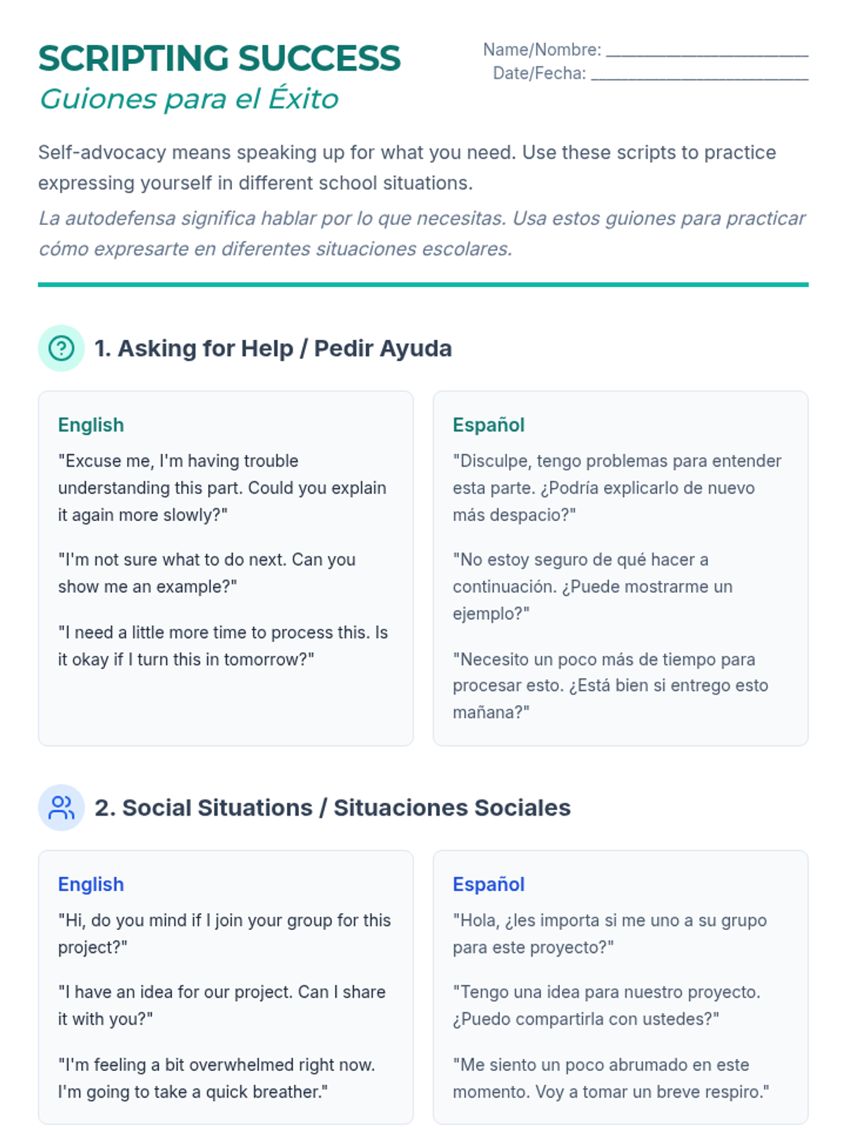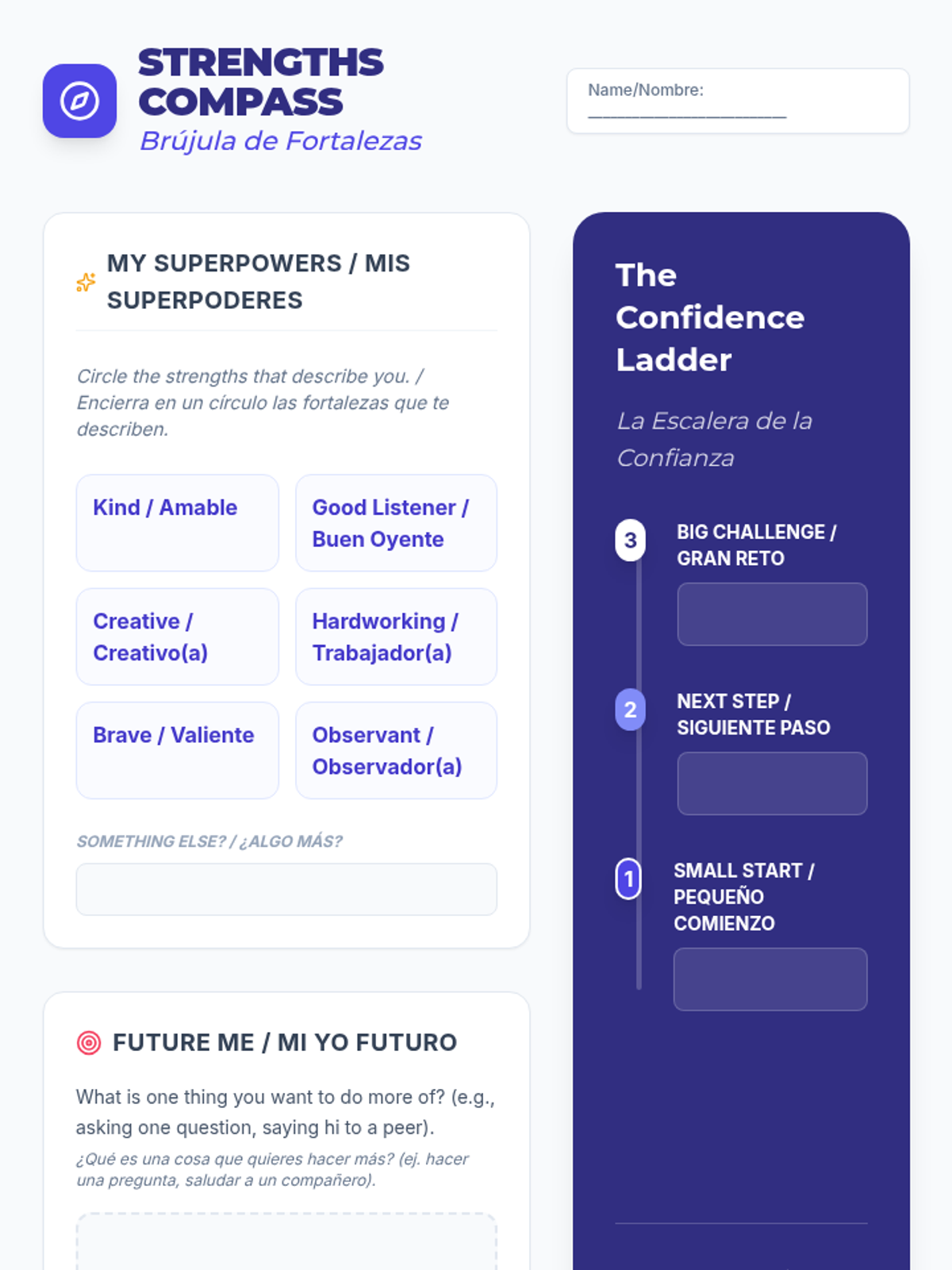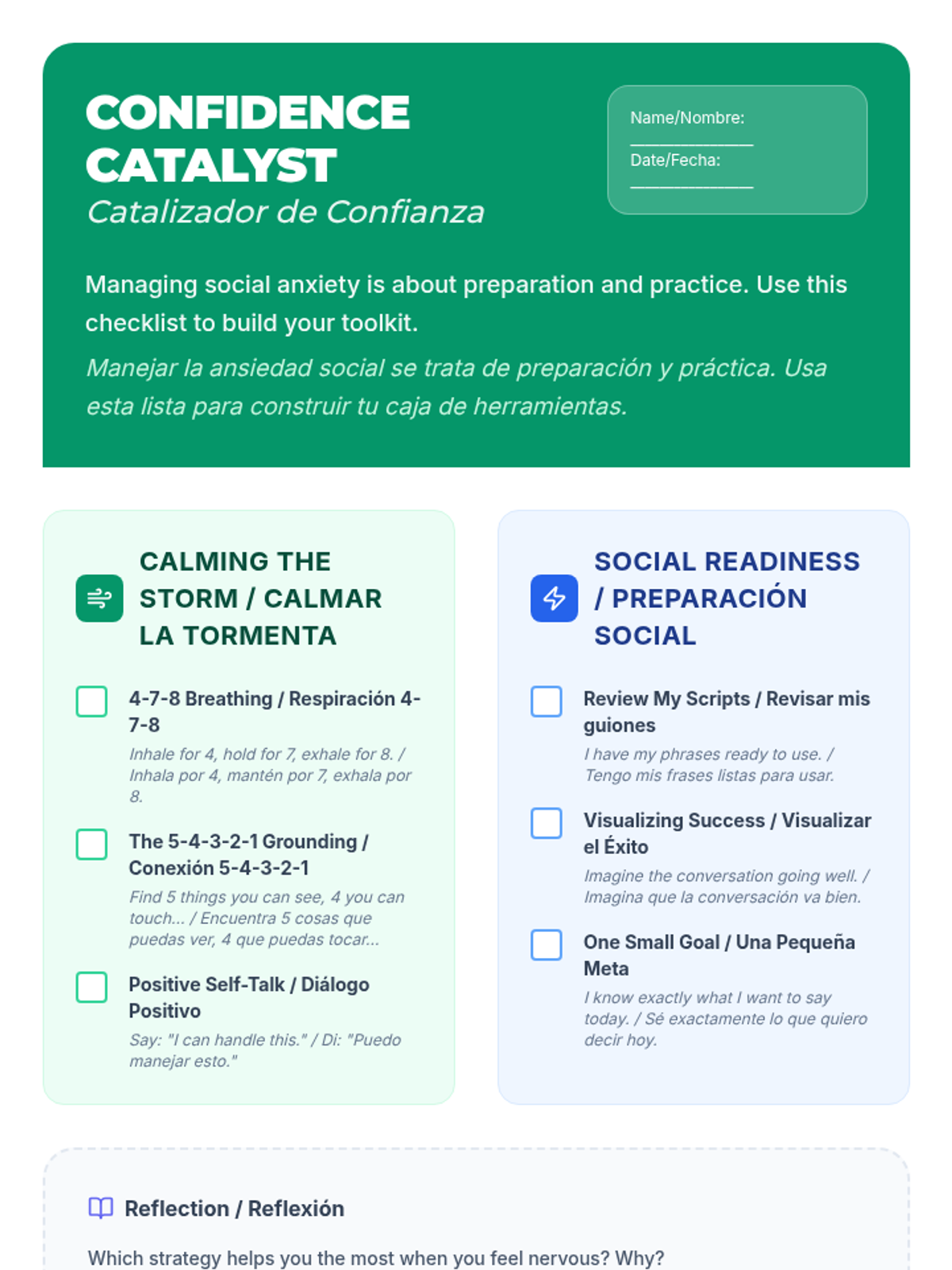 A collection of bilingual resources designed to help a shy Spanish-speaking student identify personal strengths, manage social anxiety, and practice self-advocacy through structured scripts and visual goals.