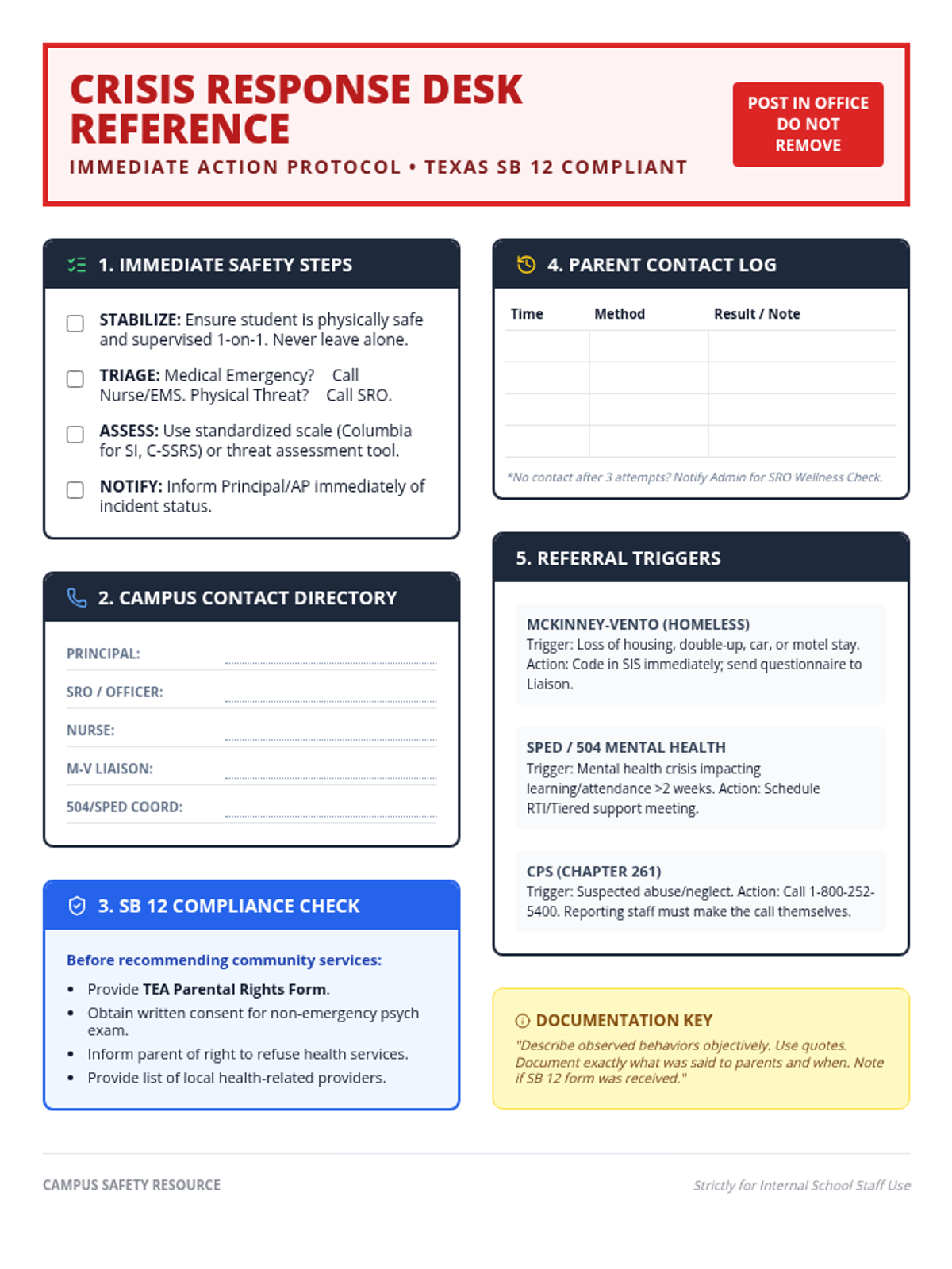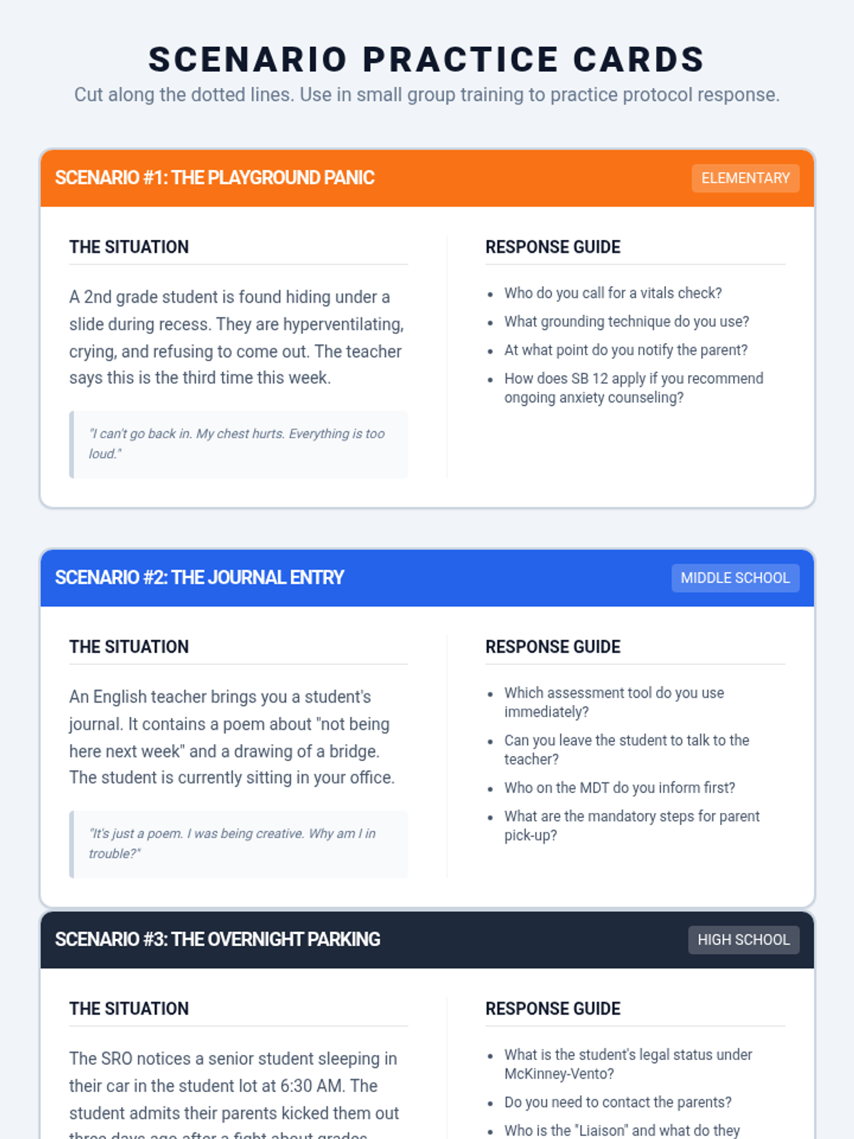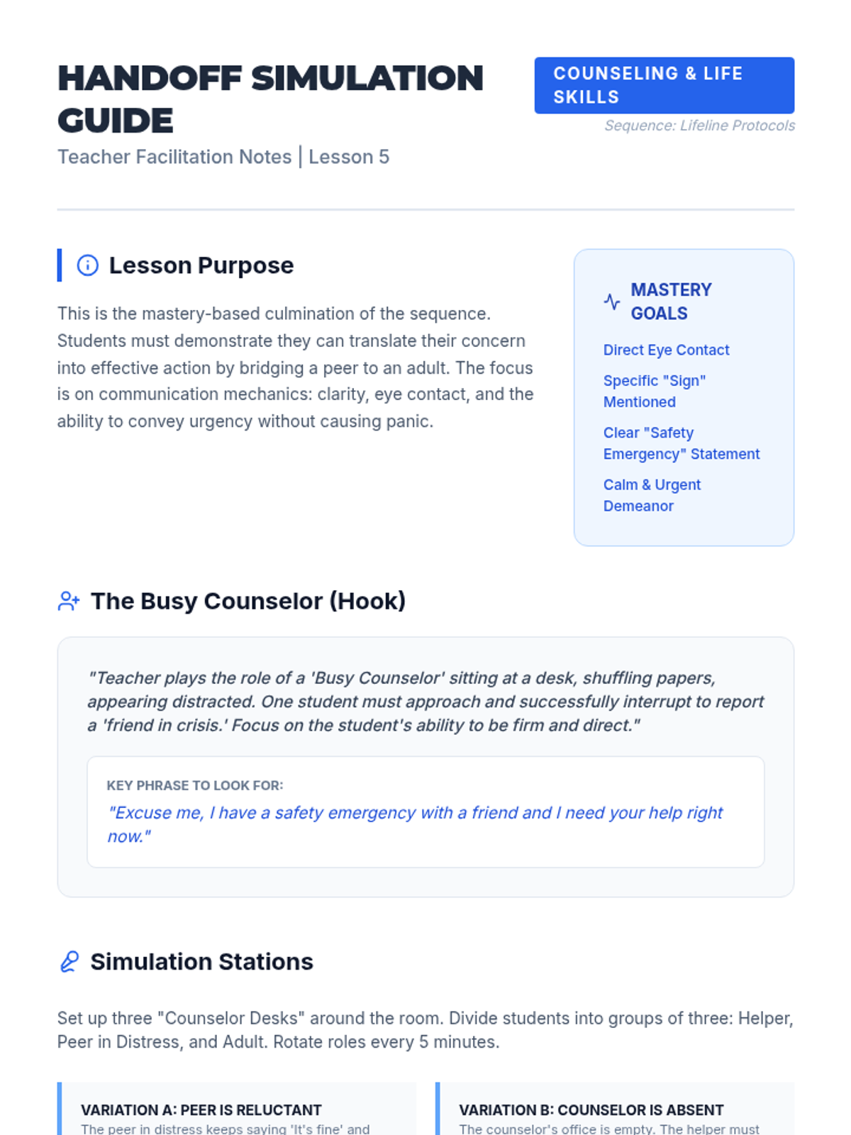 Students participate in simulations where they practice the 'handoff'—bridging a peer in distress to a professional. The focus is on clear, urgent communication with school counselors and administrators.