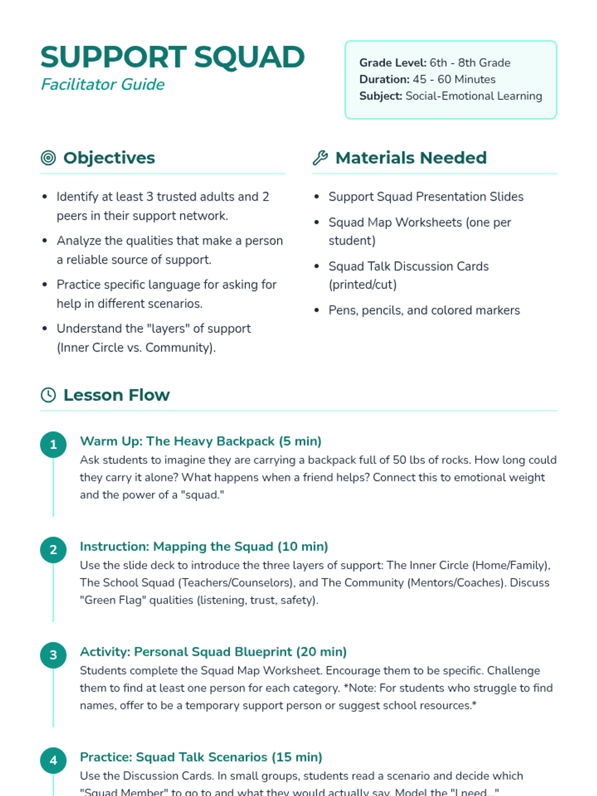 A comprehensive lesson for middle schoolers to identify their personal support network, evaluate the qualities of trusted individuals, and practice seeking help effectively.