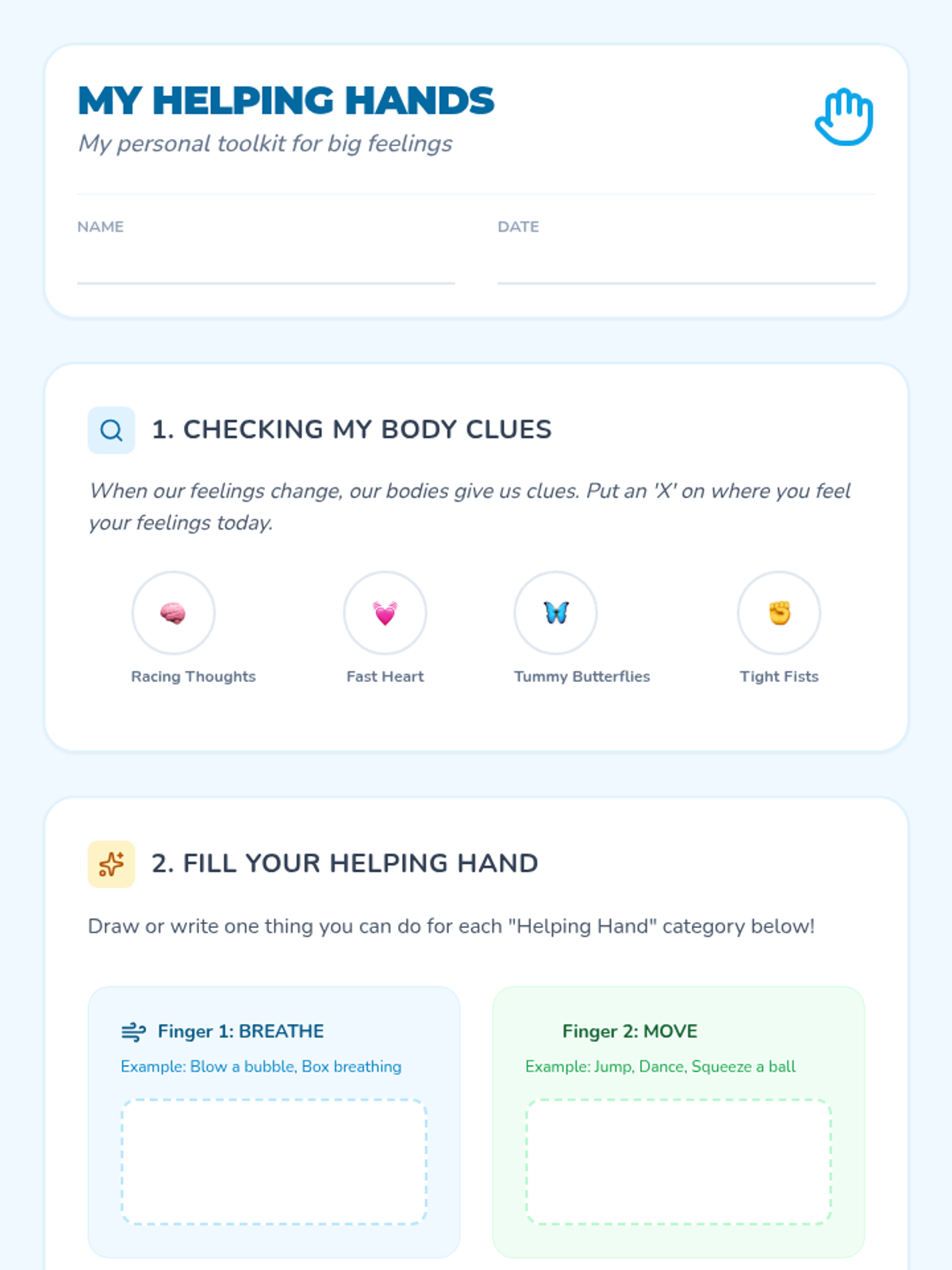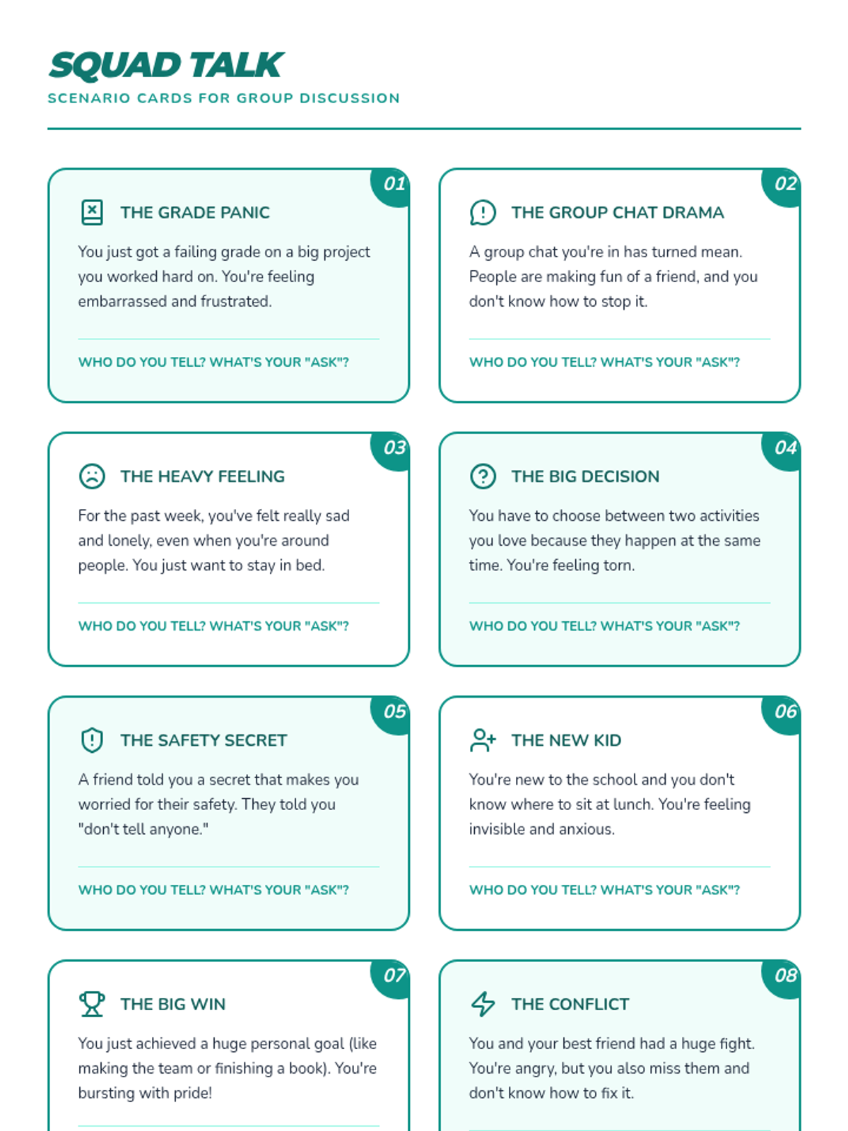 Students learn to set healthy boundaries when supporting others and create a personal safety plan that identifies their own trusted adults and self-regulation strategies.