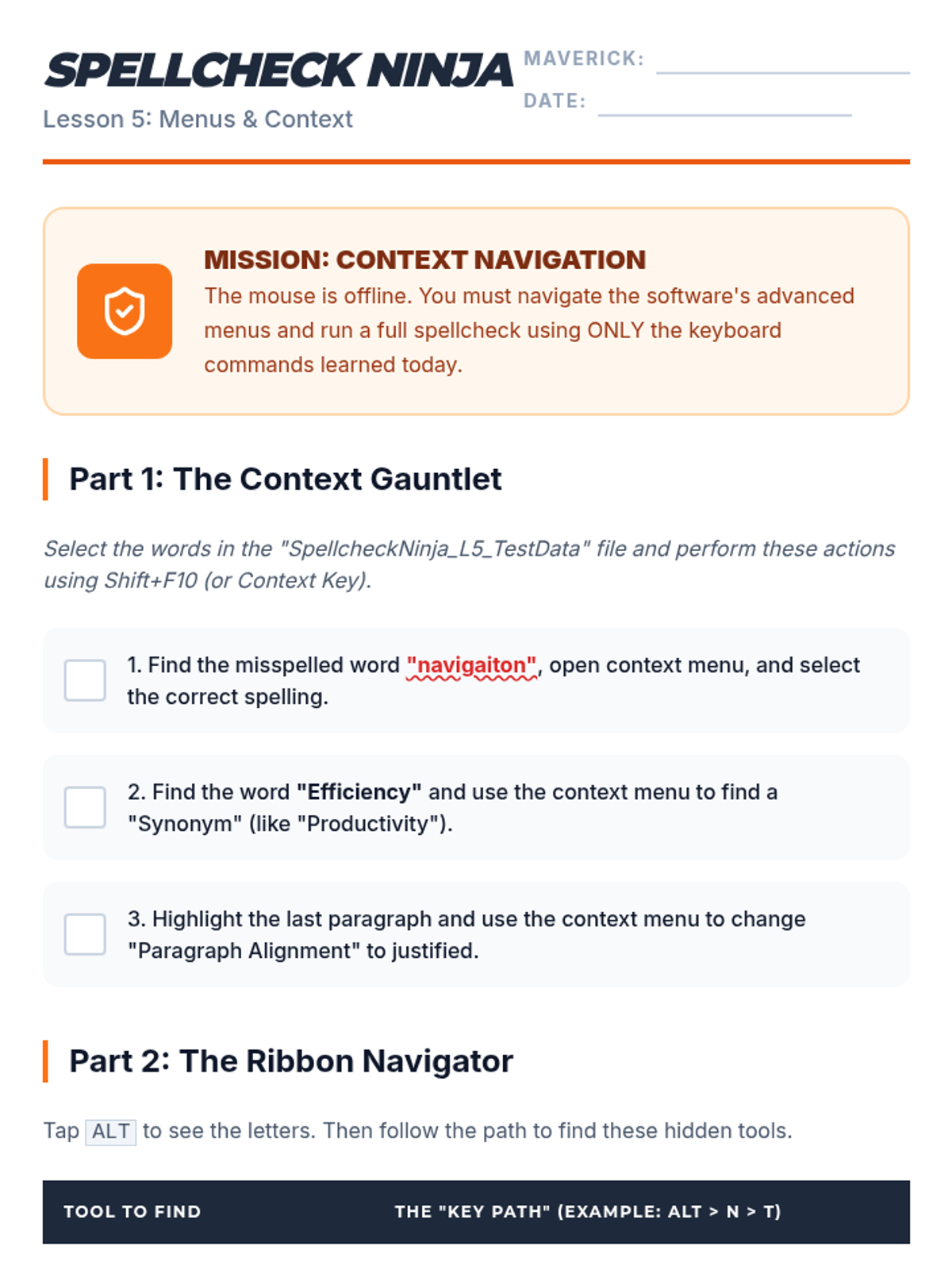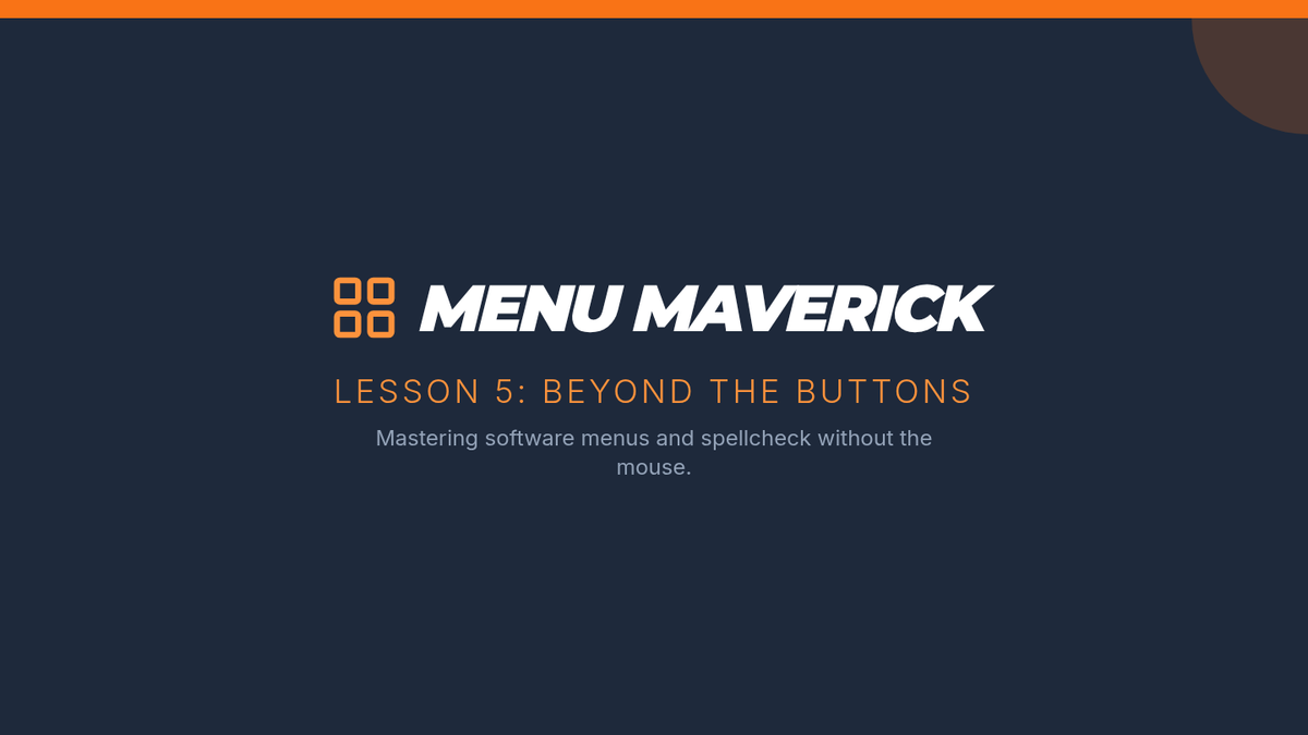 Teaching students to navigate software menus and context tools using the keyboard alone, specifically for spellcheck and tool access.