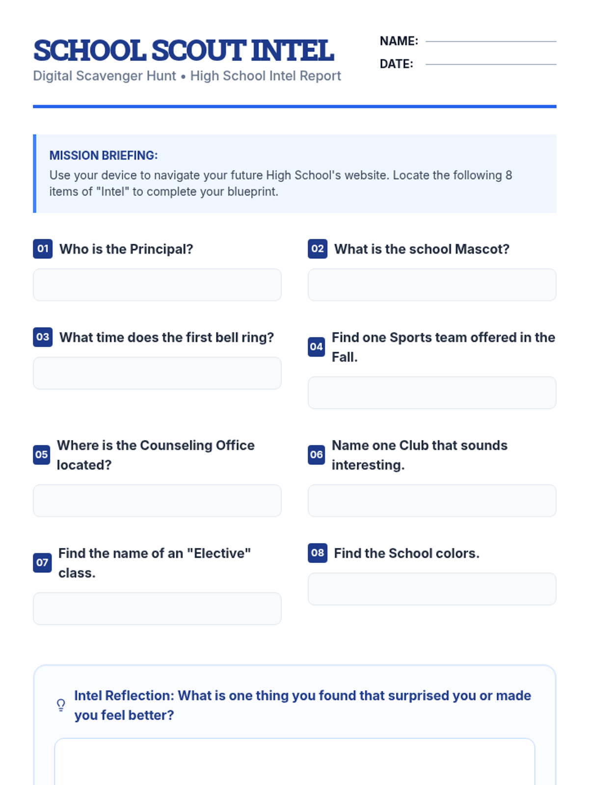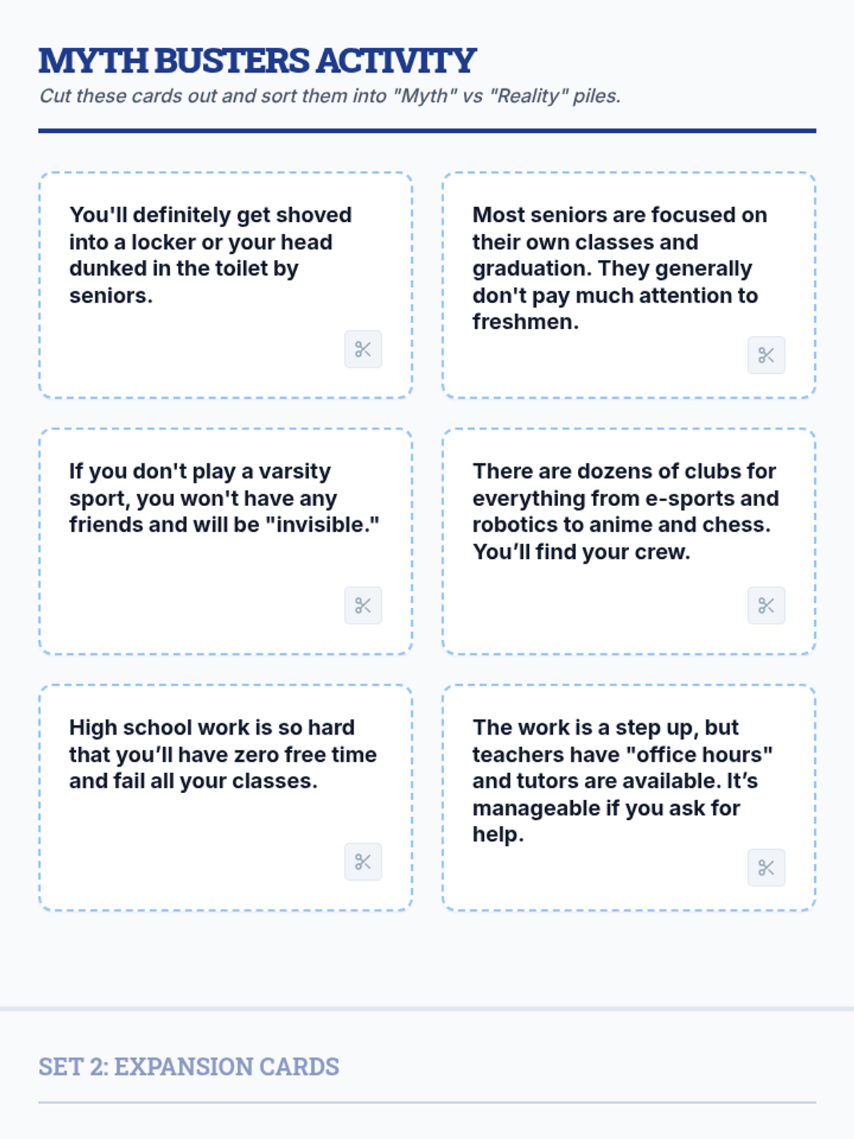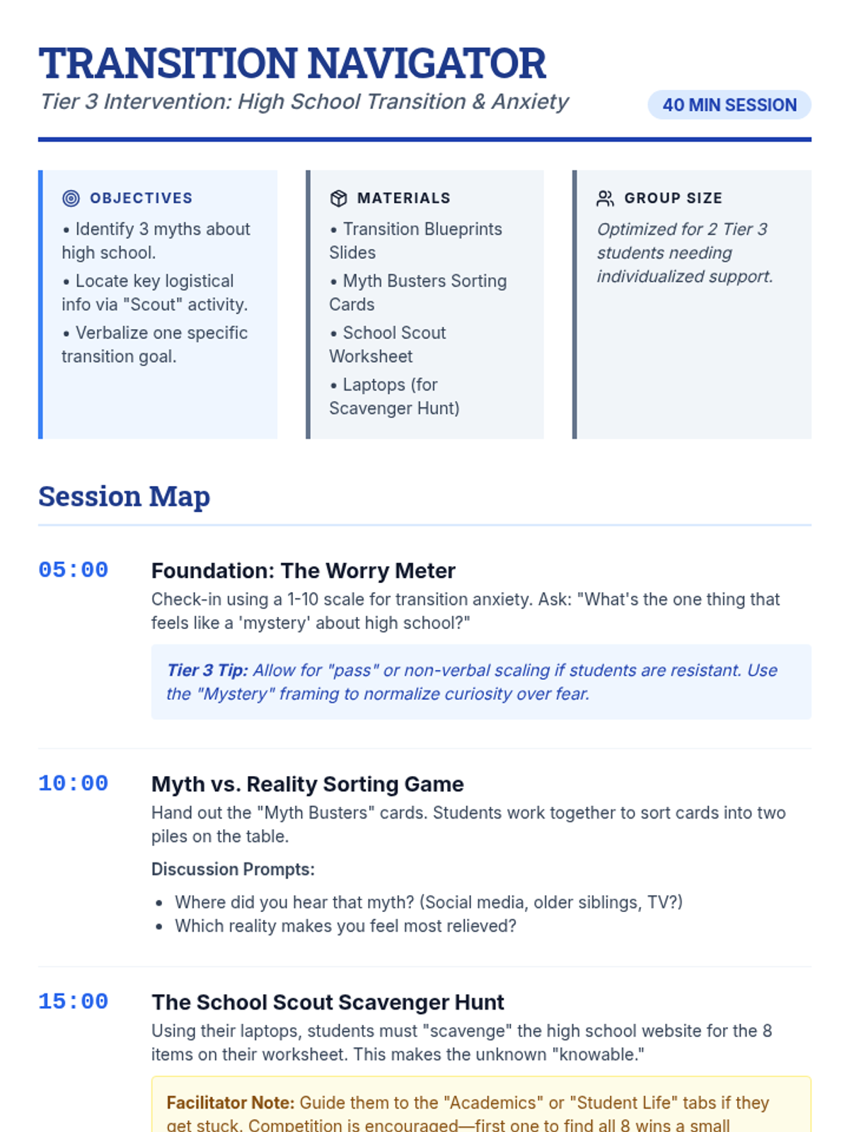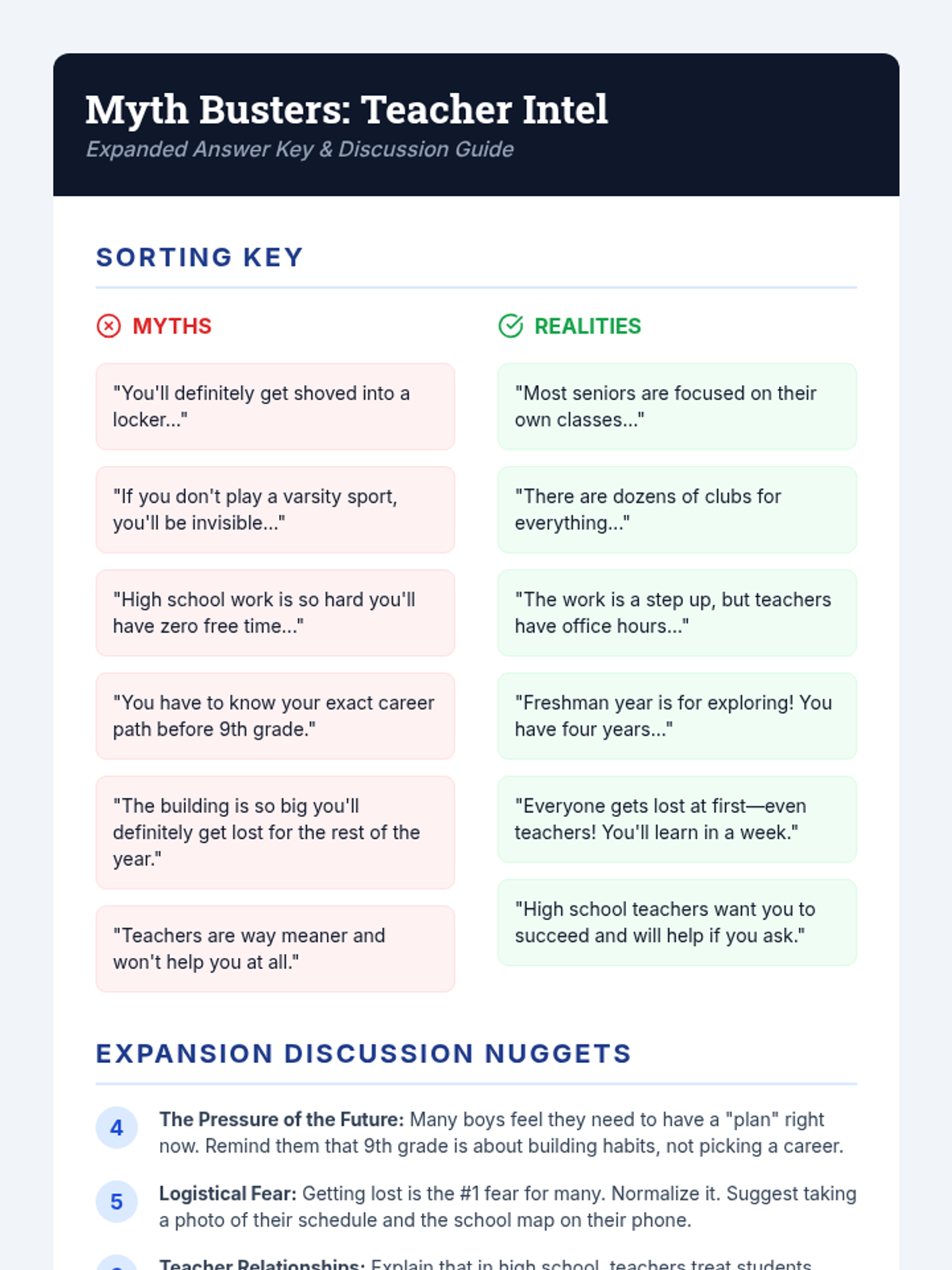 A 40-minute counseling lesson designed for middle school boys to address anxiety about the high school transition through interactive myth-busting and information gathering.