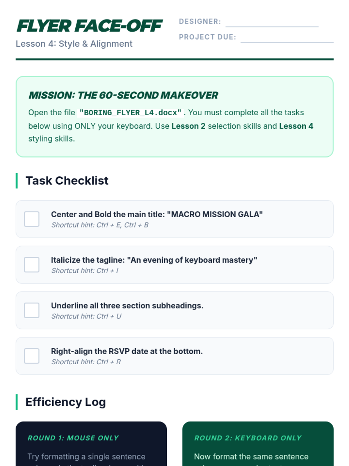 A capstone project where students apply all editing and formatting shortcuts to revise a rough draft into a polished final paper under a timed challenge.