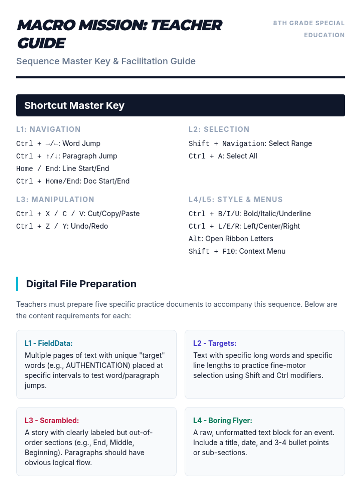 Students engage in rapid-fire drills to build motor memory and recall for common commands like Save, Print, and Select All.