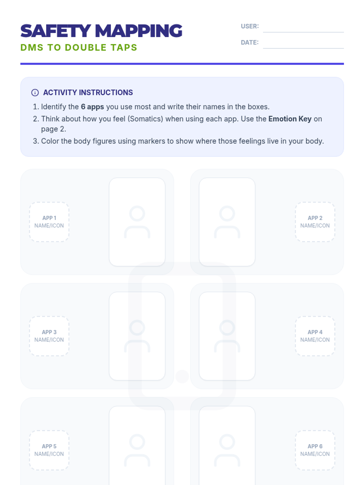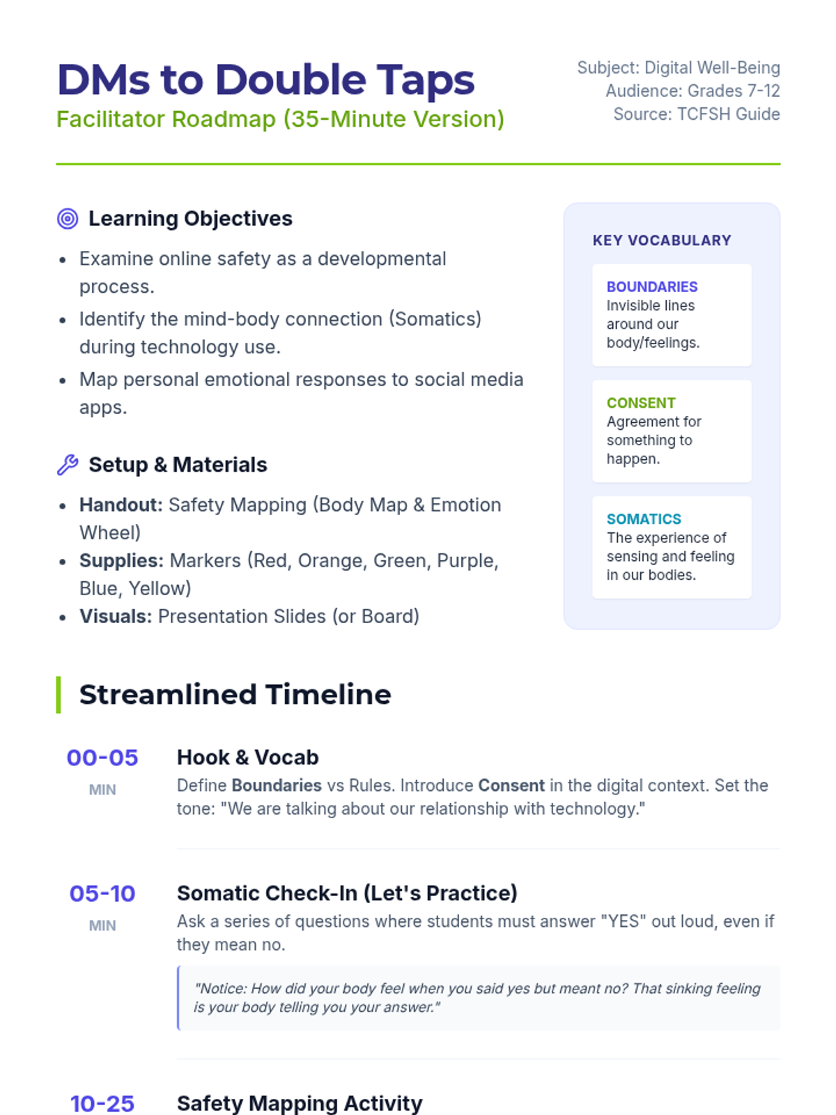 A 35-minute interactive session exploring the mind-body connection with social media. Students use somatic mapping to identify emotional triggers in their most-used apps and learn strategies for digital safety based on the TCFSH 'DMs to Double Taps' guide.