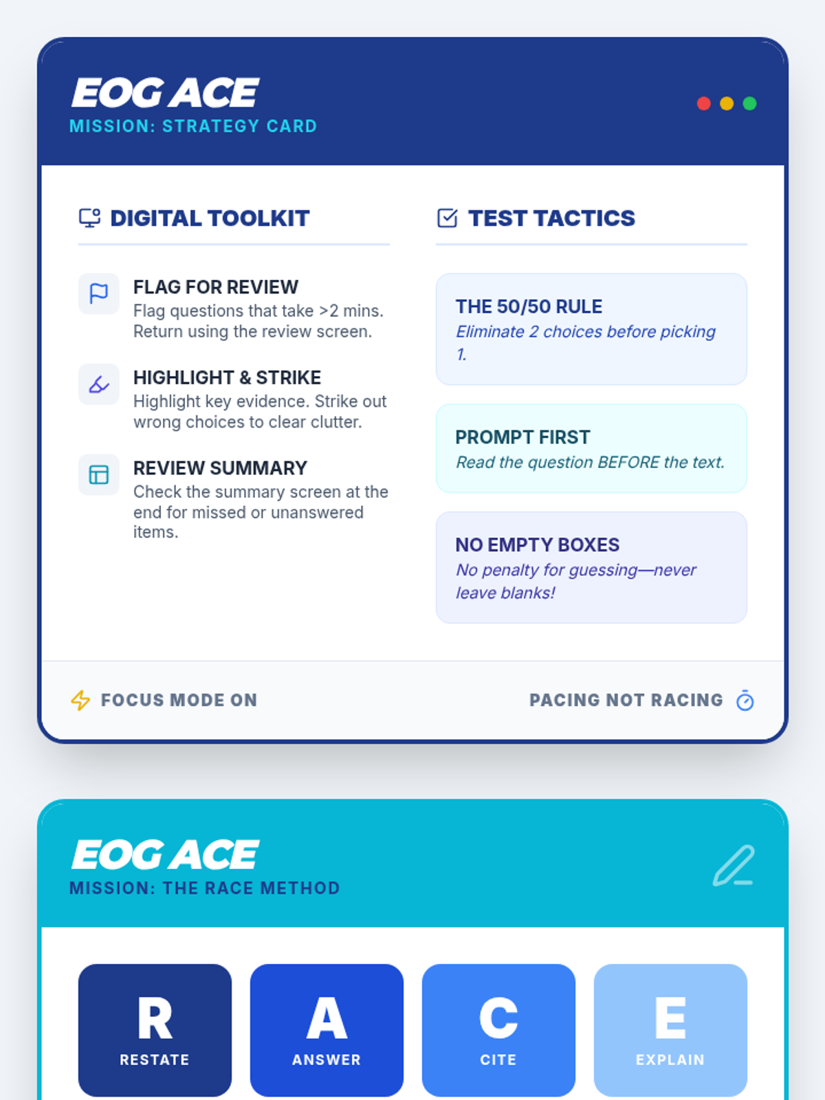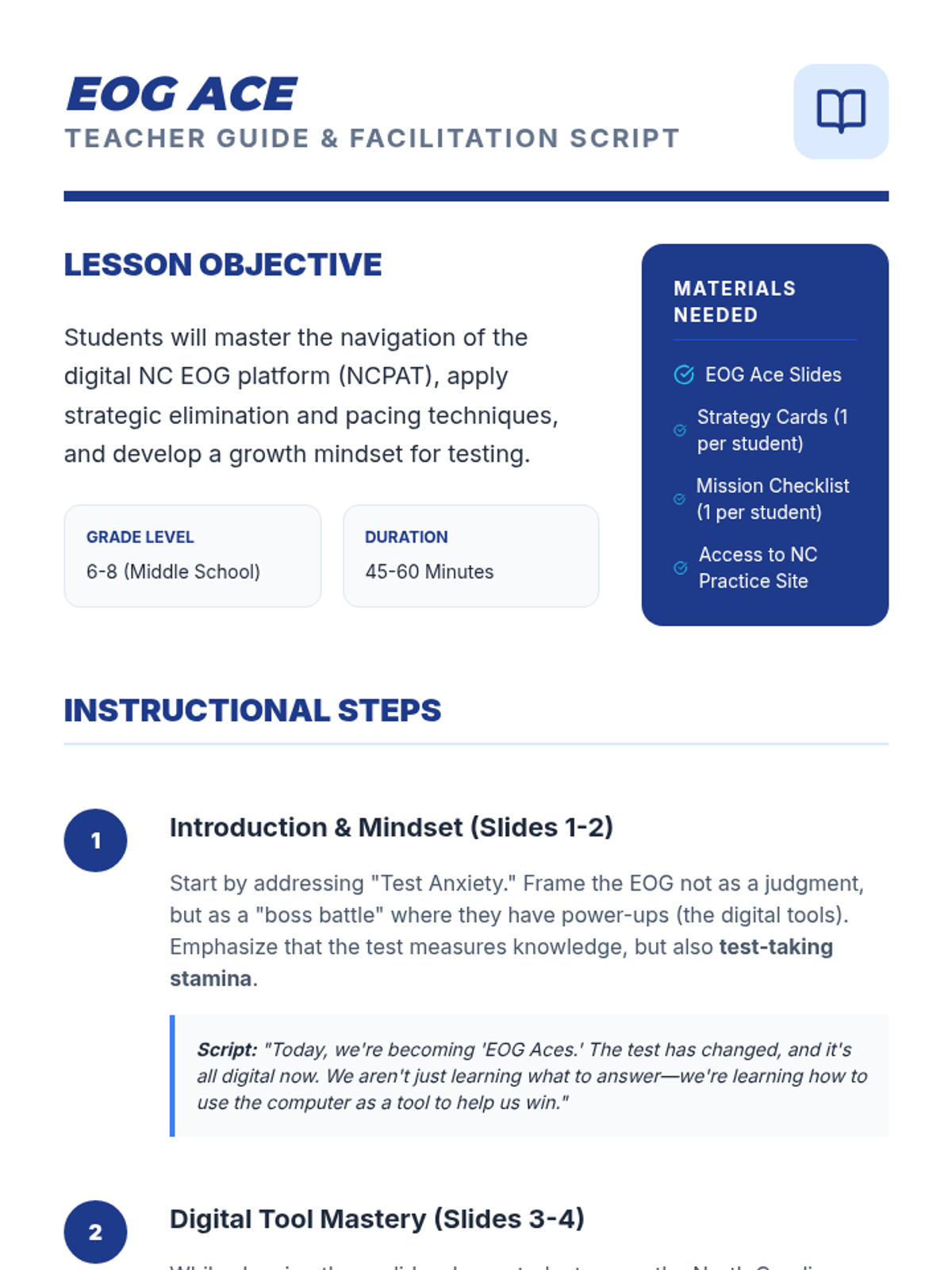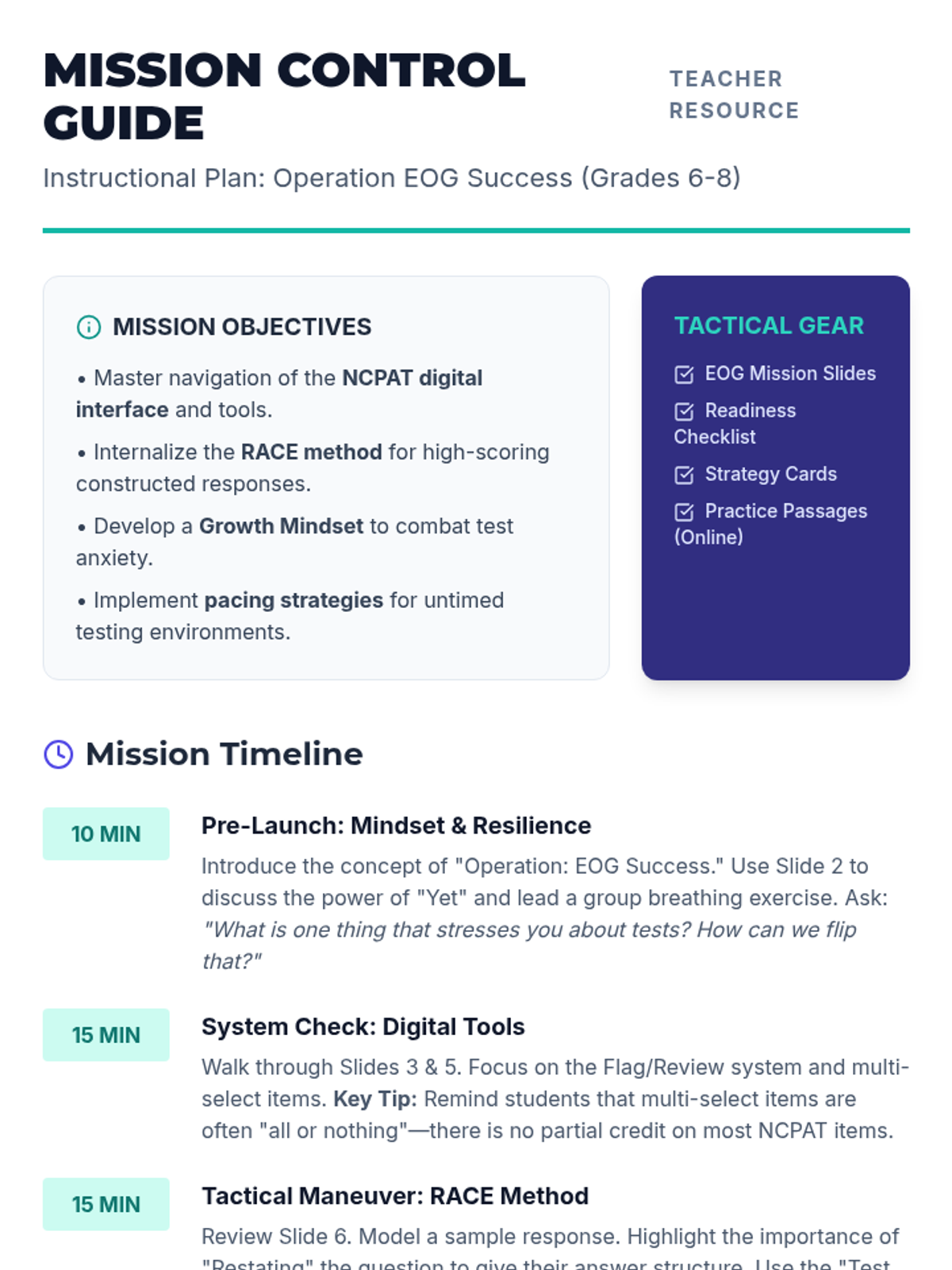A comprehensive guide for 6th-8th grade students to master the NC EOG digital format, covering NCPAT-specific tools, the RACE method for constructed responses, and growth mindset strategies.