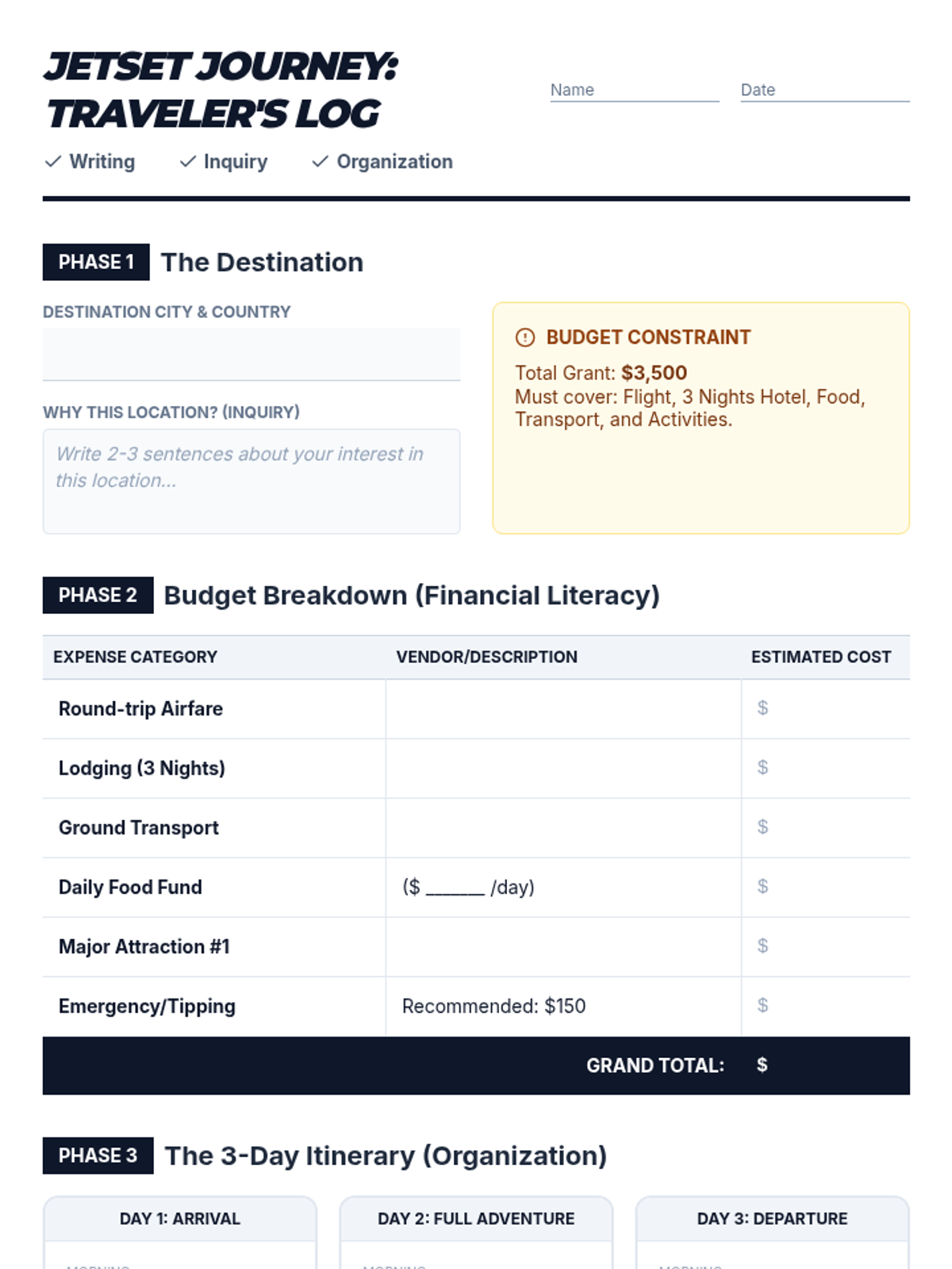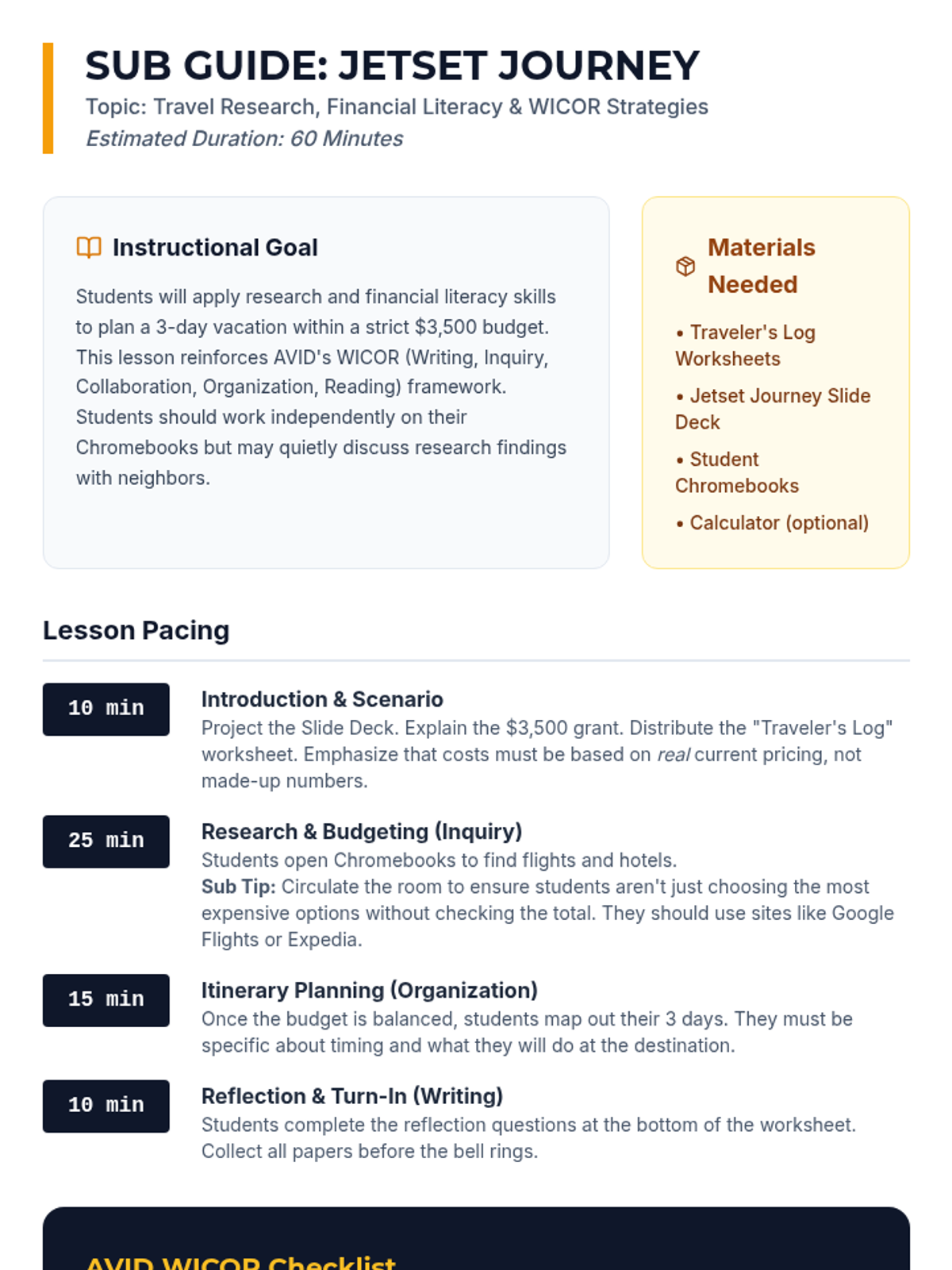 A high-engagement, sub-friendly lesson where AVID students research, budget, and plan a 3-day dream vacation while applying WICOR strategies and financial literacy skills.
