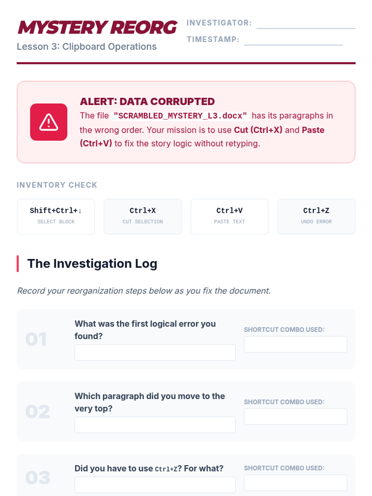 Teaches students the Cut, Copy, and Paste commands to reorganize a scrambled story, focusing on the distinction between moving and duplicating text.