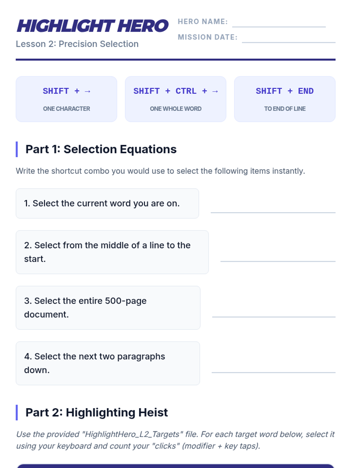 Introduces the Shift key as a modifier for text selection, allowing students to highlight text without using a mouse.