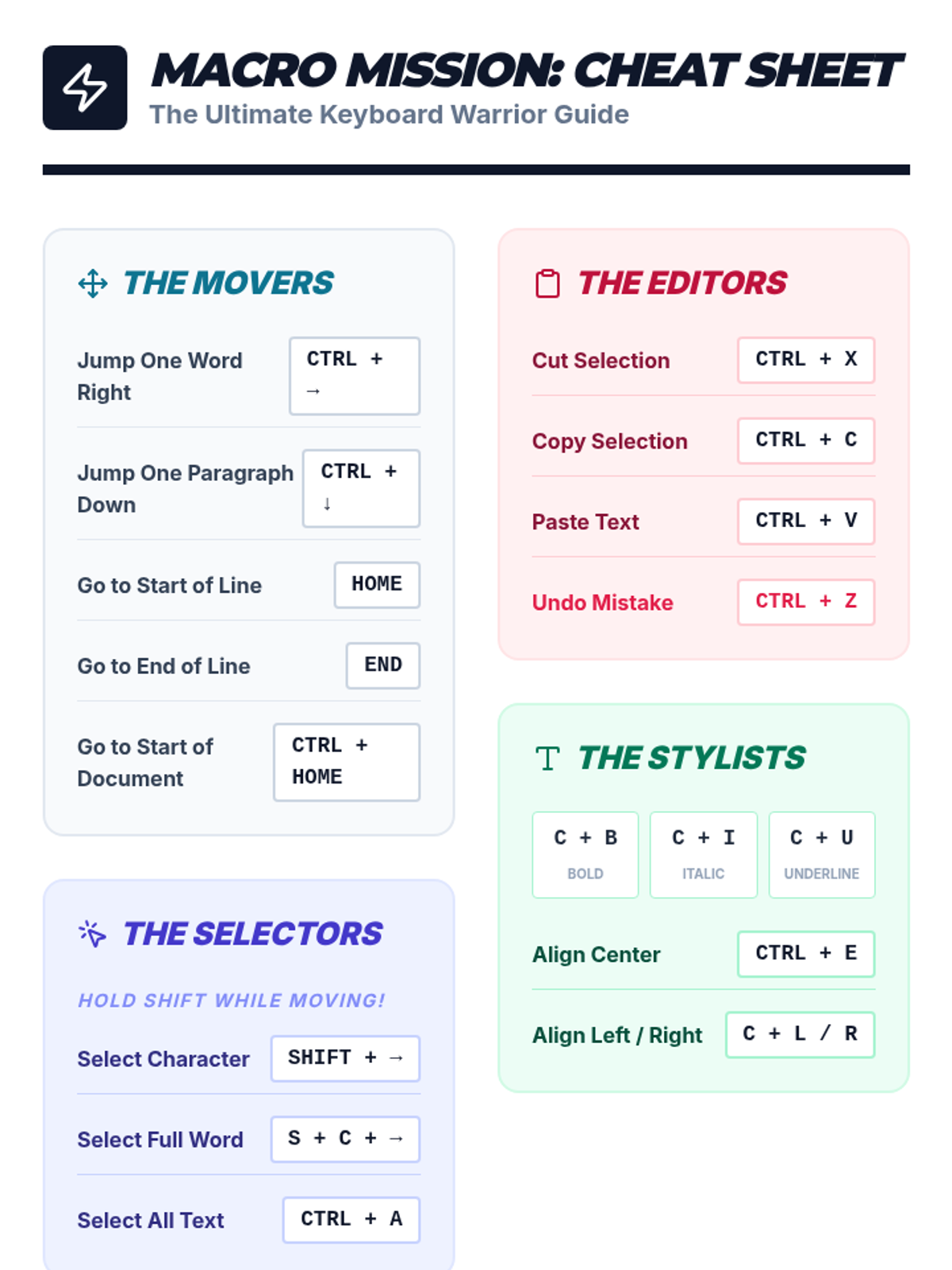 Focuses on formatting shortcuts for bold, italics, underline, and paragraph alignment to enhance document presentation.
