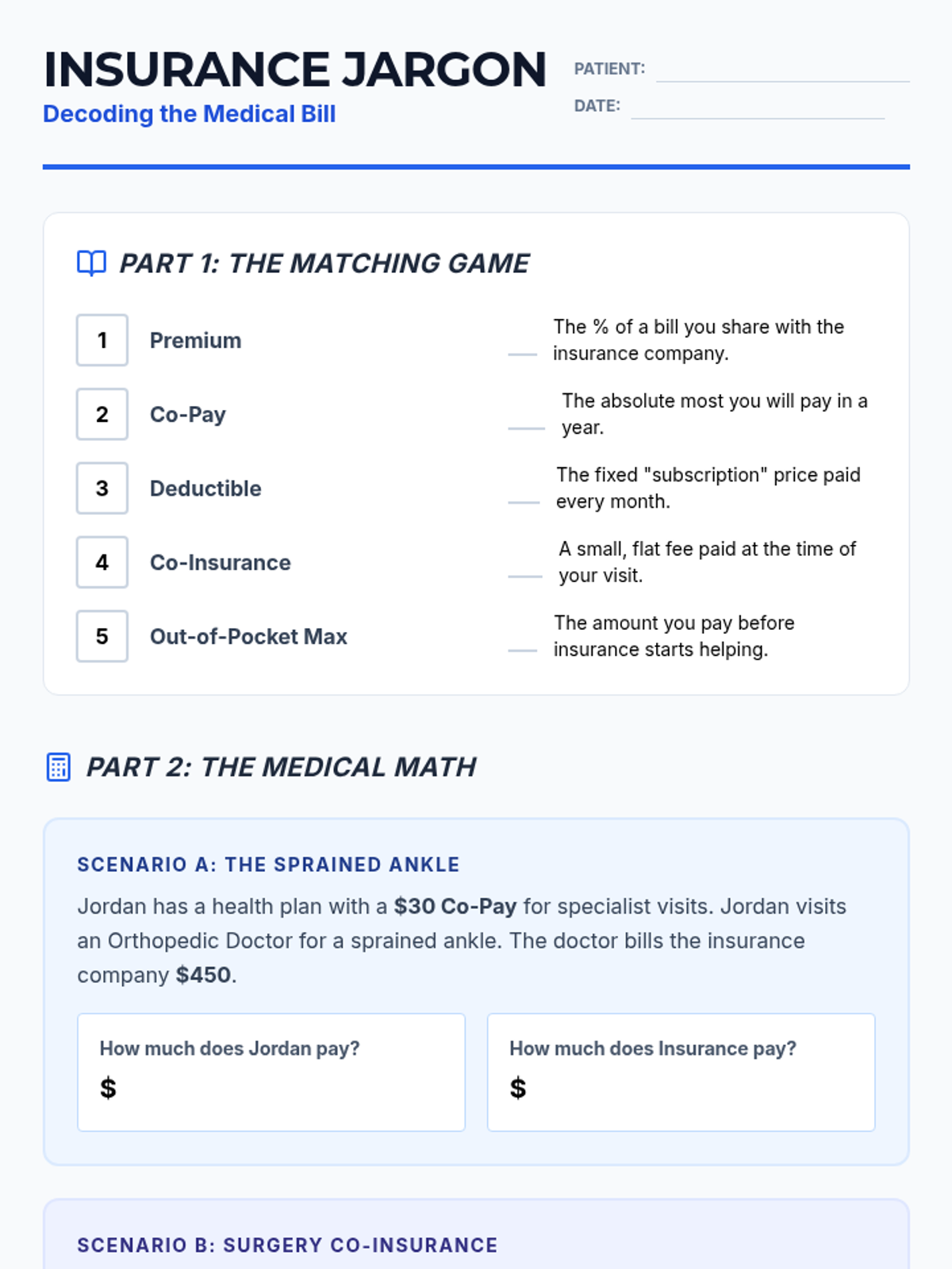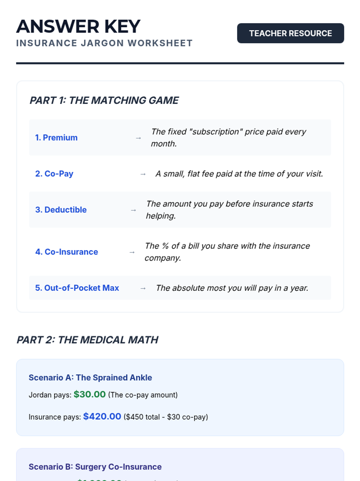 Students define critical health insurance terms: co-pay, co-insurance, and out-of-pocket maximum. They solve word problems related to visiting a doctor for a flu test or a sprained ankle.