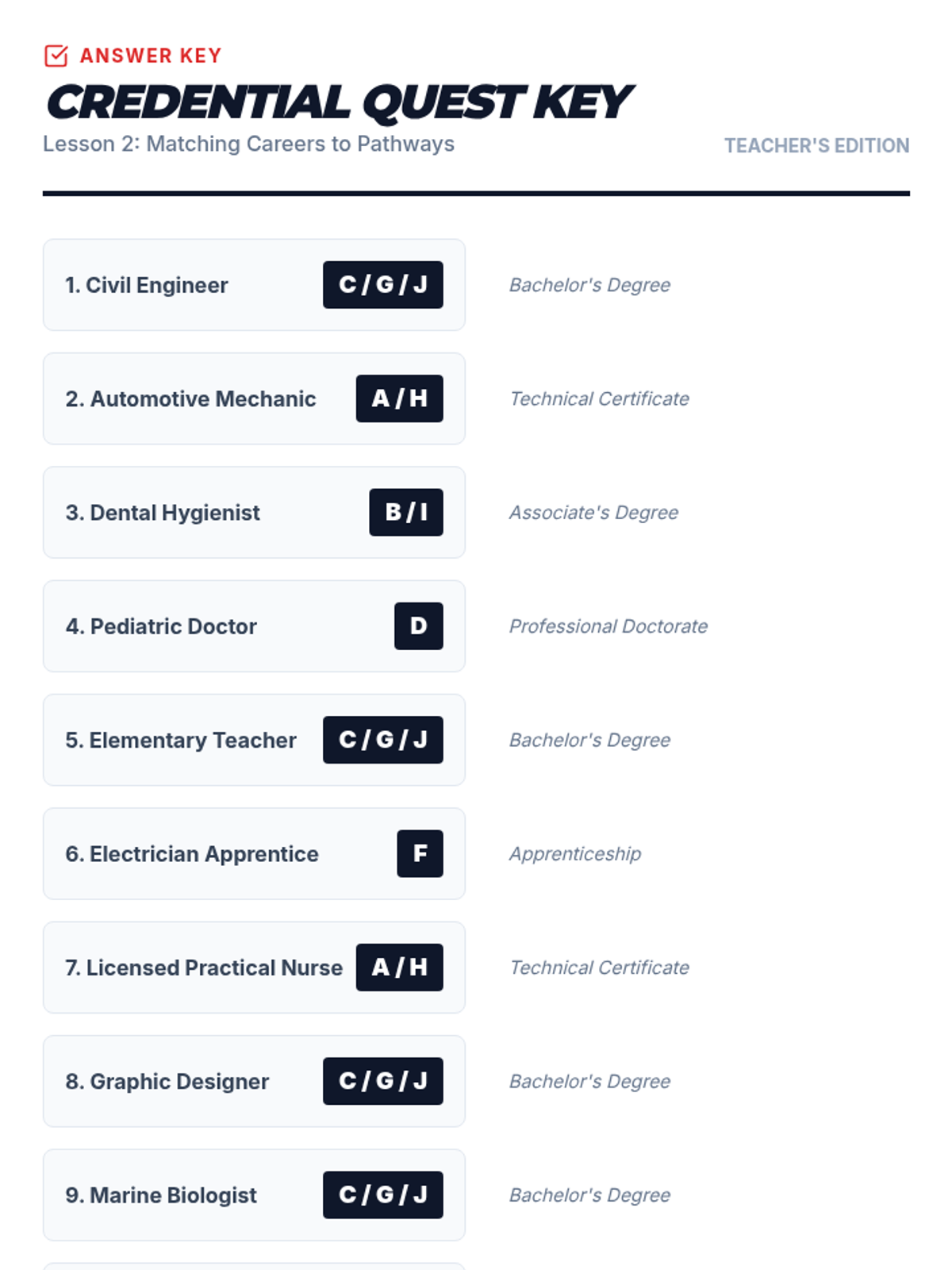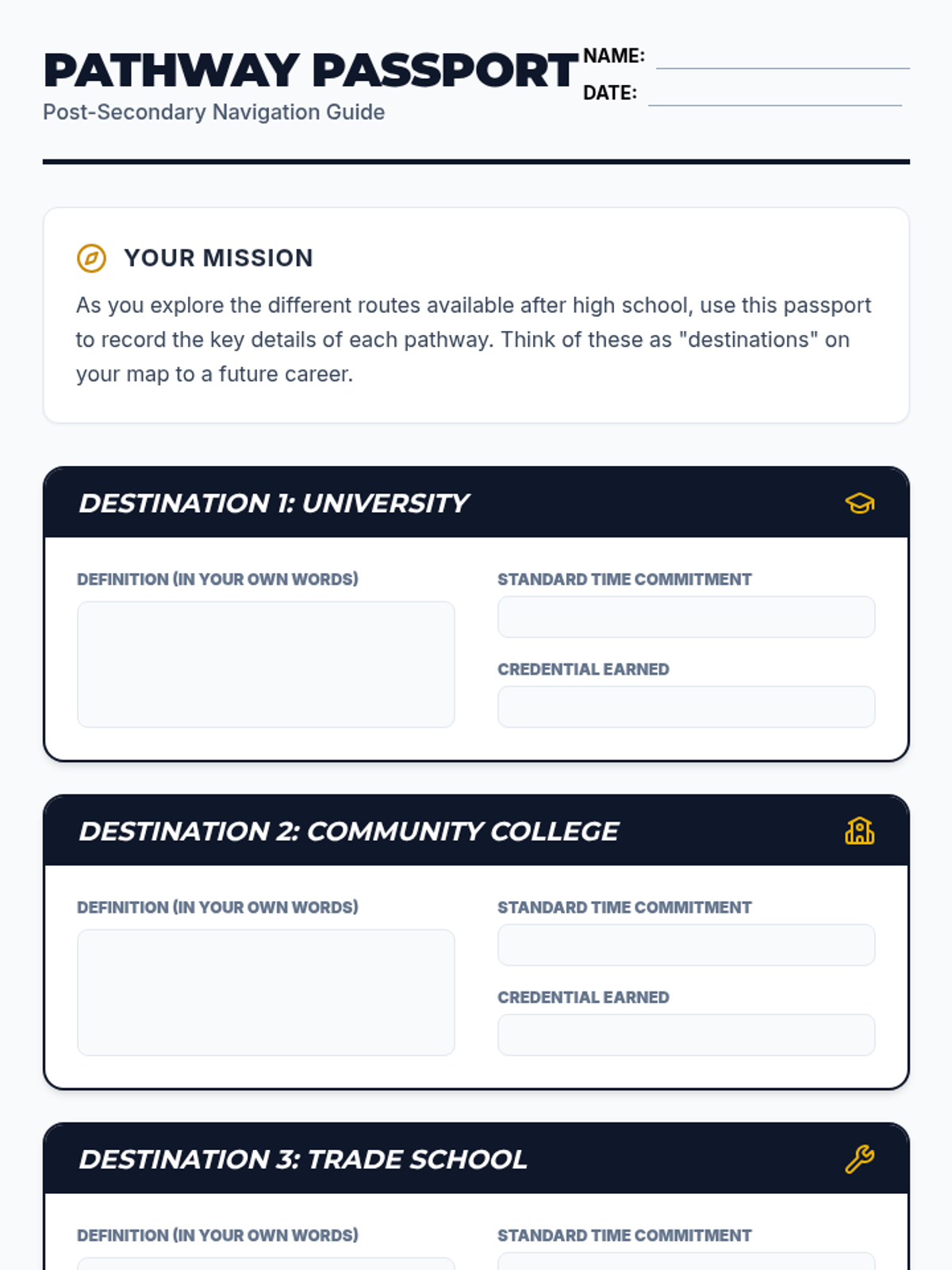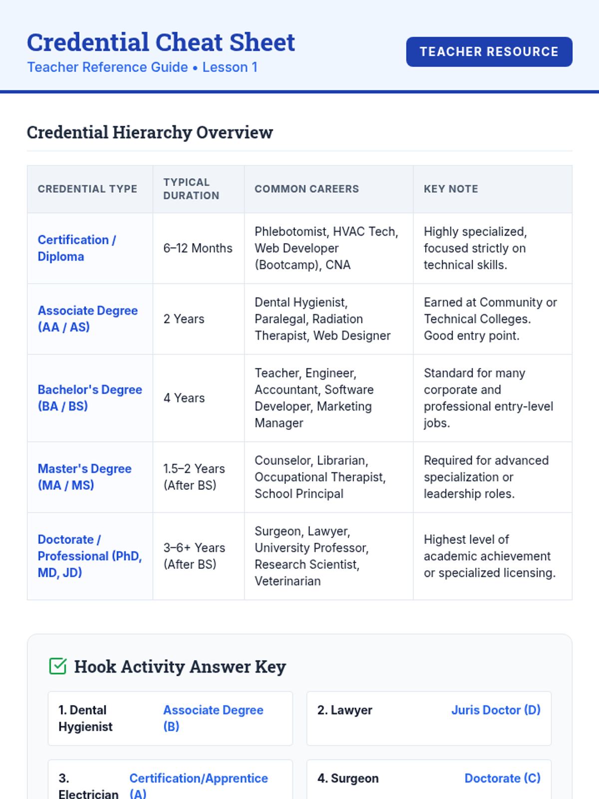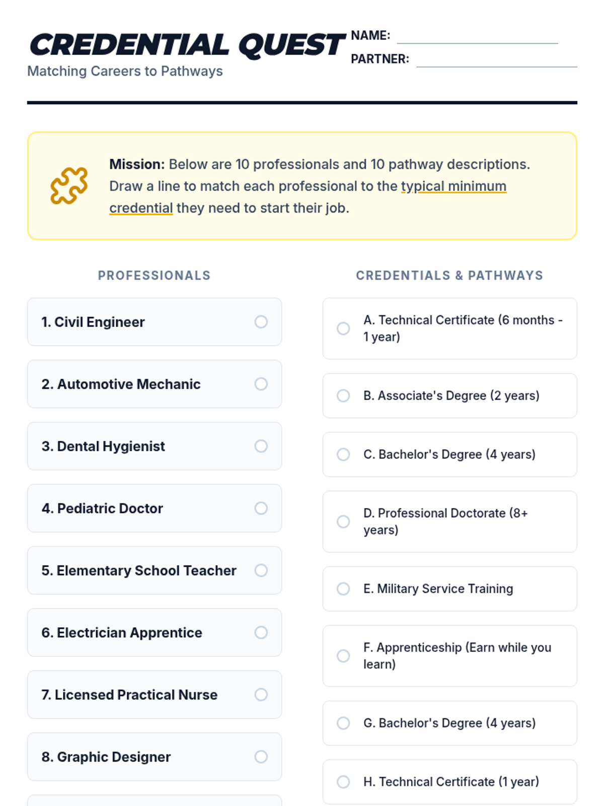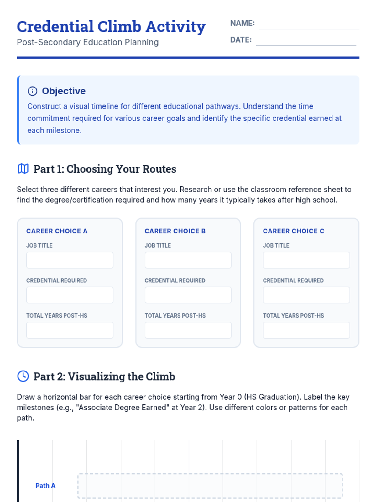 Students learn the hierarchy and time requirements of post-secondary credentials, from certificates and Associate degrees to PhDs. They create a visual timeline showing how long different paths take to complete.
