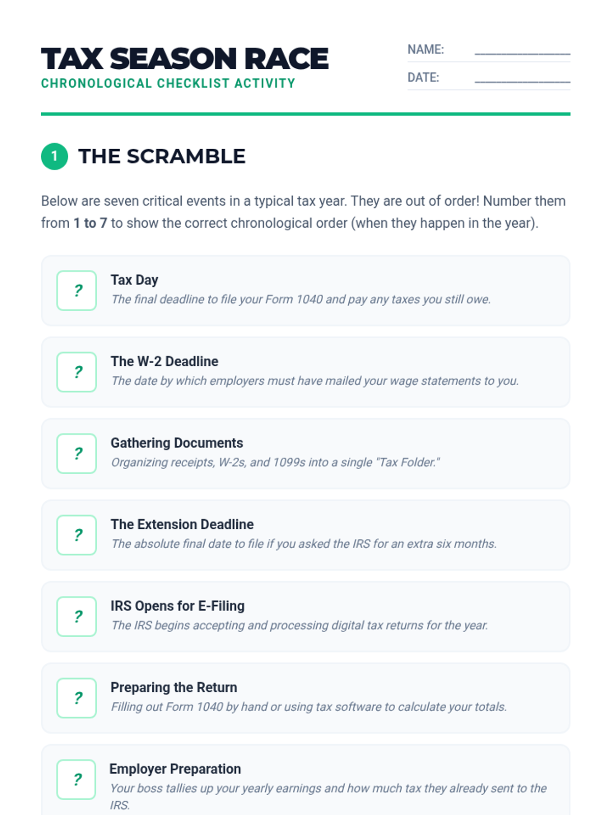 Students explore the critical dates of the U.S. tax system and create a chronological checklist for a successful filing season.