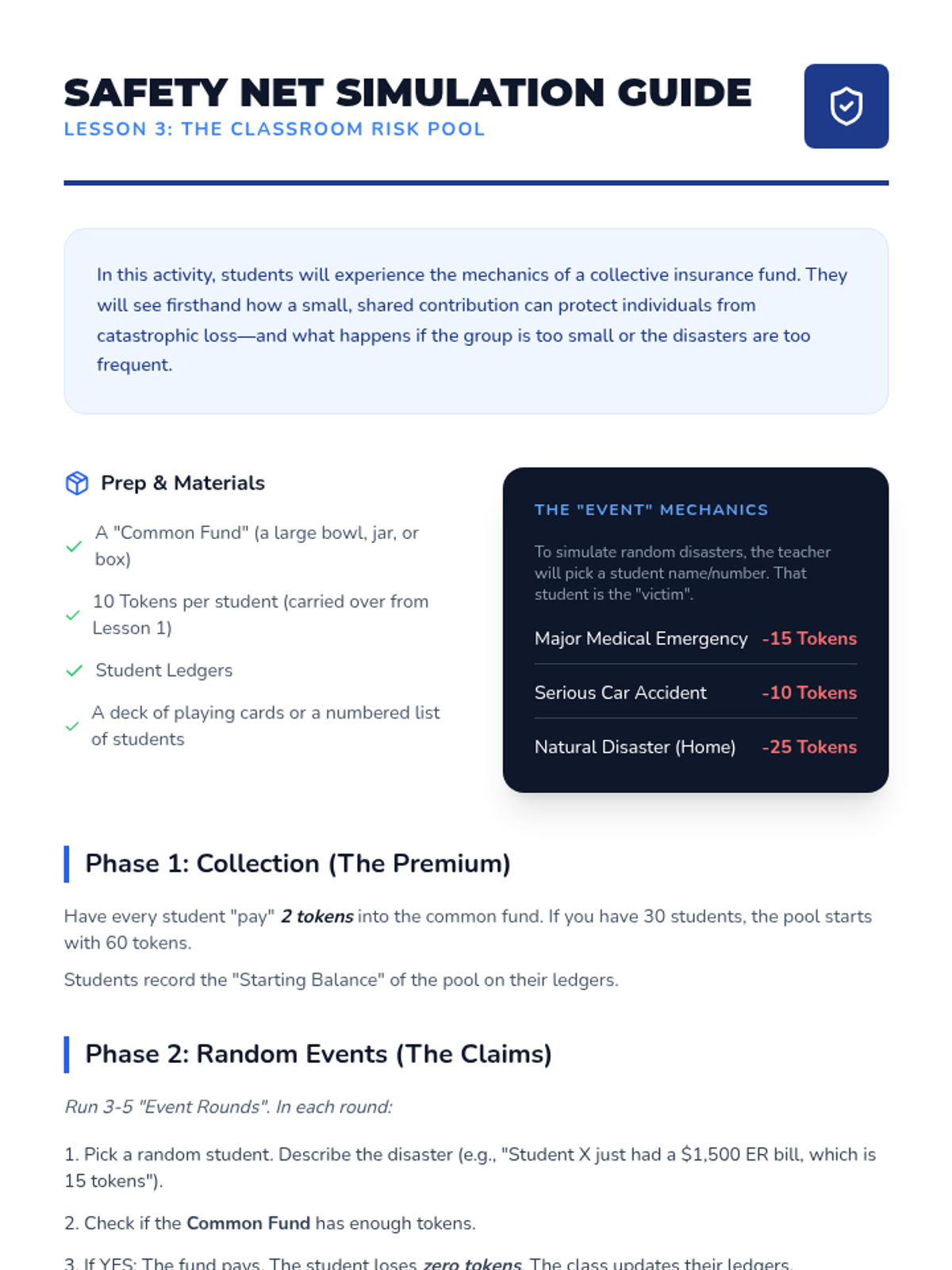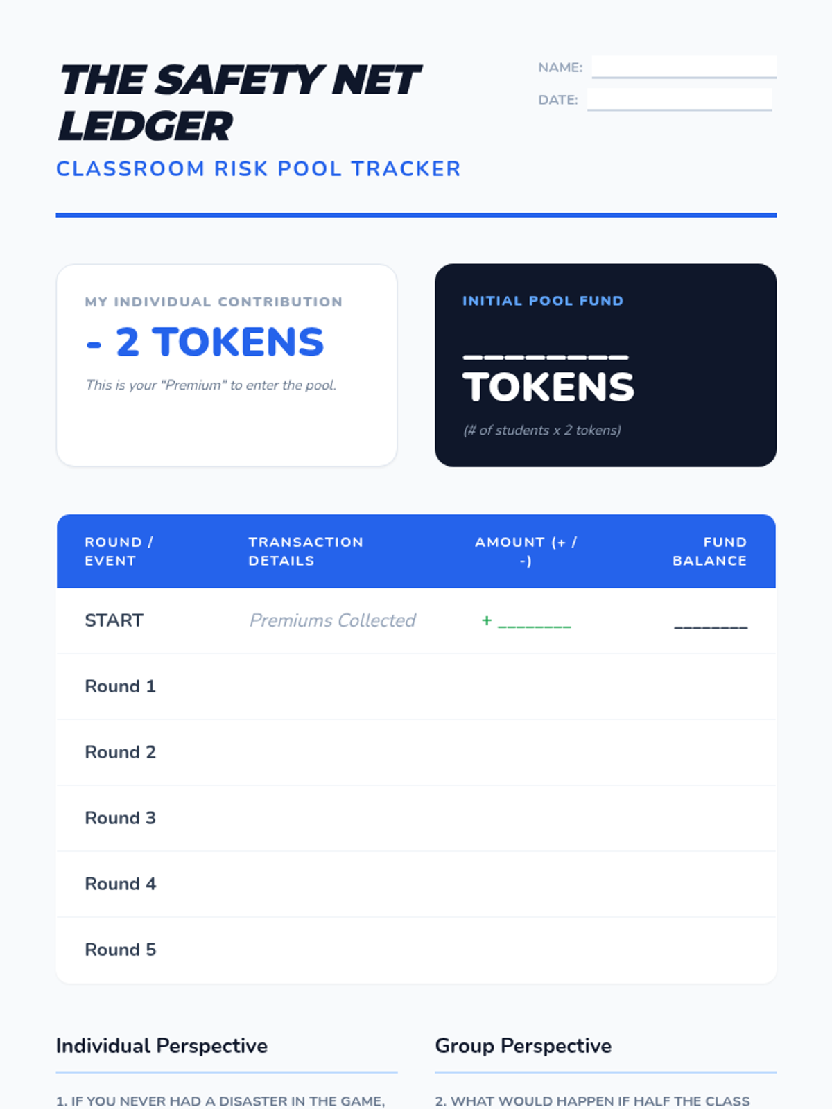 Students simulate a risk pool to understand how insurance companies use collective funds to cover individual losses.