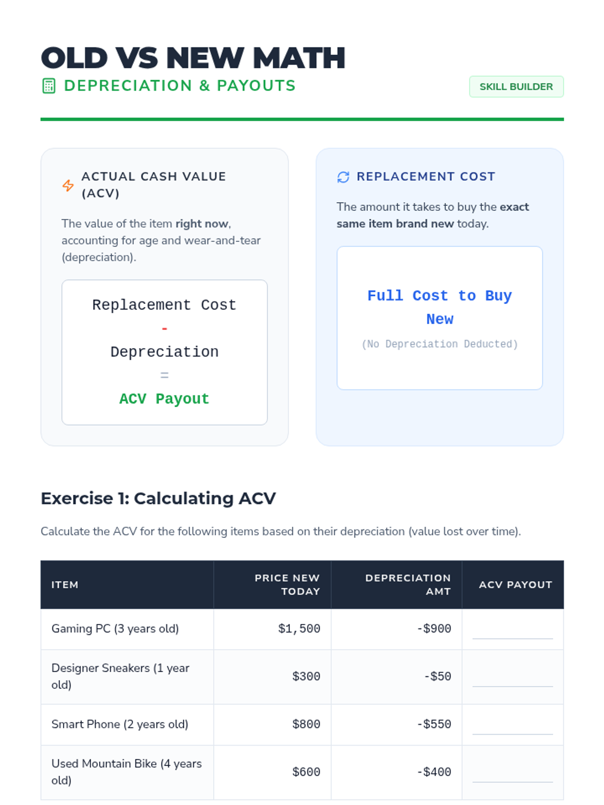 Students calculate the difference between replacement cost and actual cash value, exploring how depreciation affects insurance payouts.