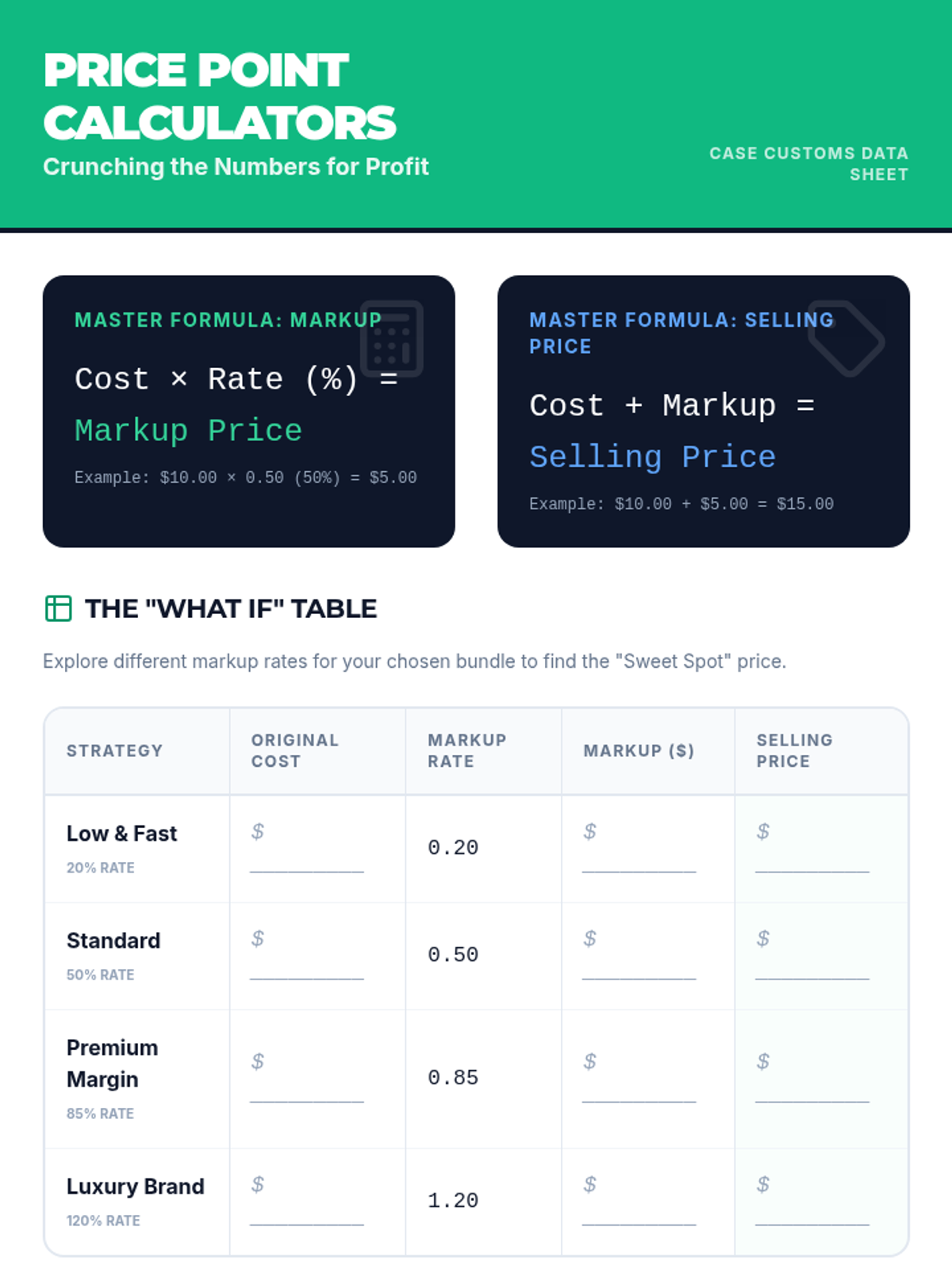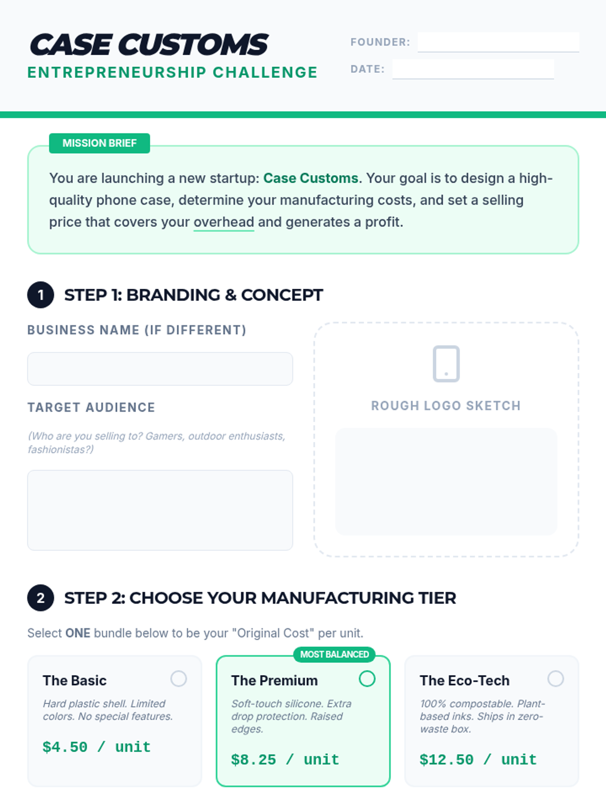 Students learn the mechanics of retail pricing by exploring the relationship between cost, markup, and selling price through an entrepreneurship challenge where they design and price custom phone cases.