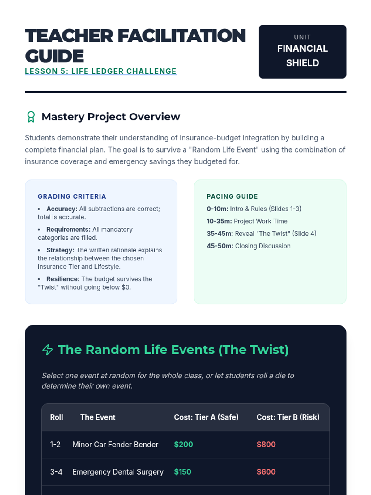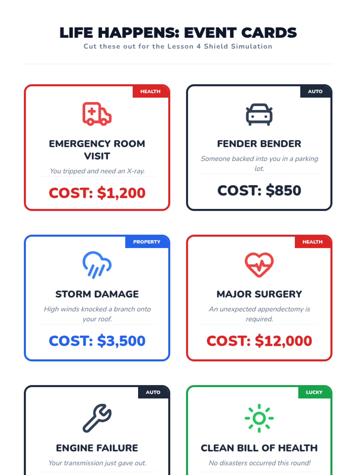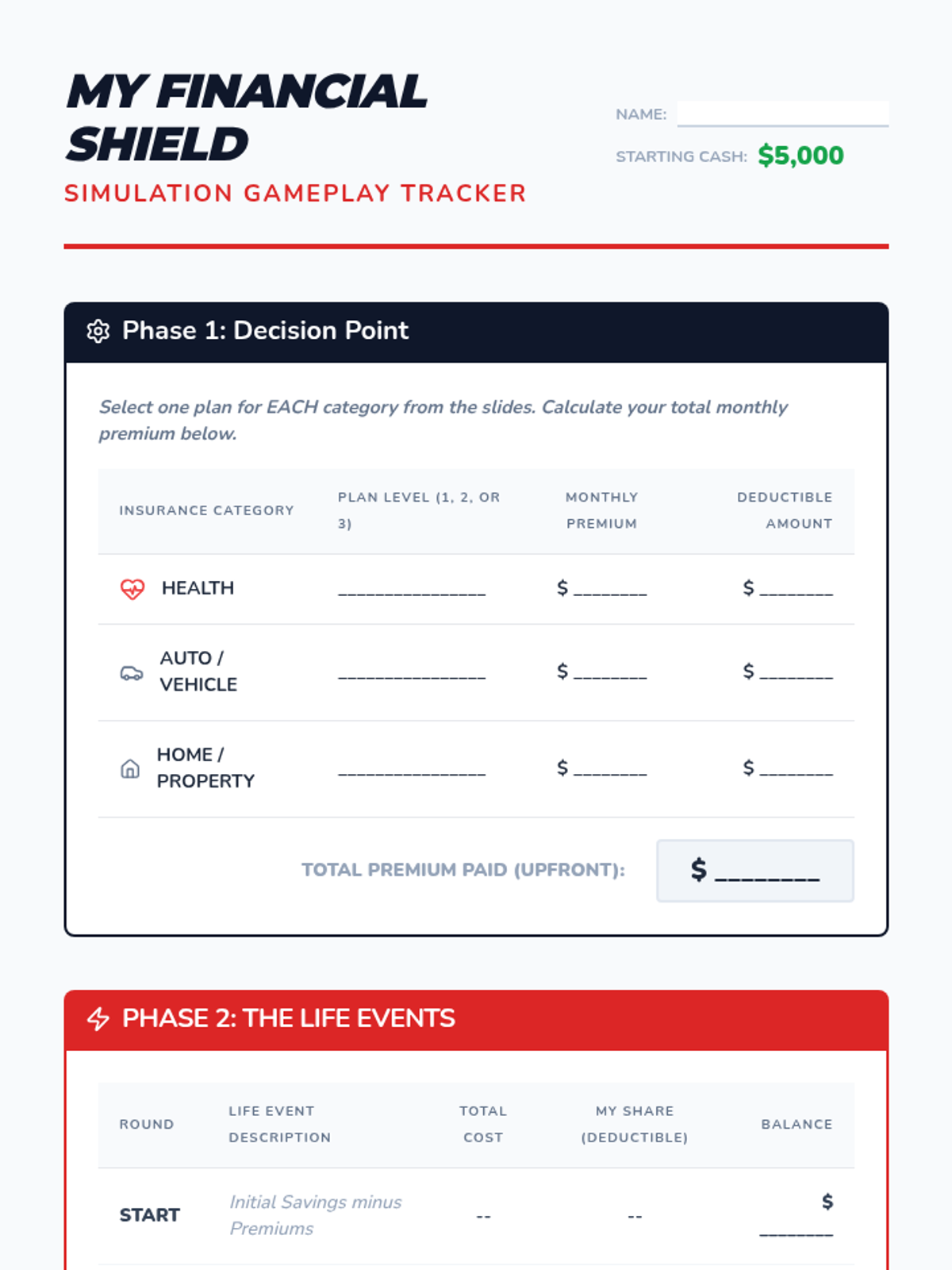 A high-stakes simulation where students must choose insurance plans and manage their budget against random 'Life Event' cards.