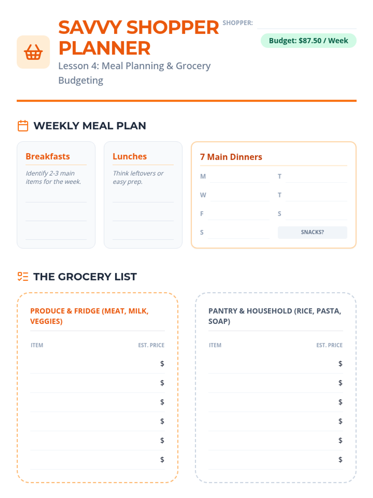 Students practice meal planning and grocery shopping within a budget, focusing on cost-effective and healthy choices.