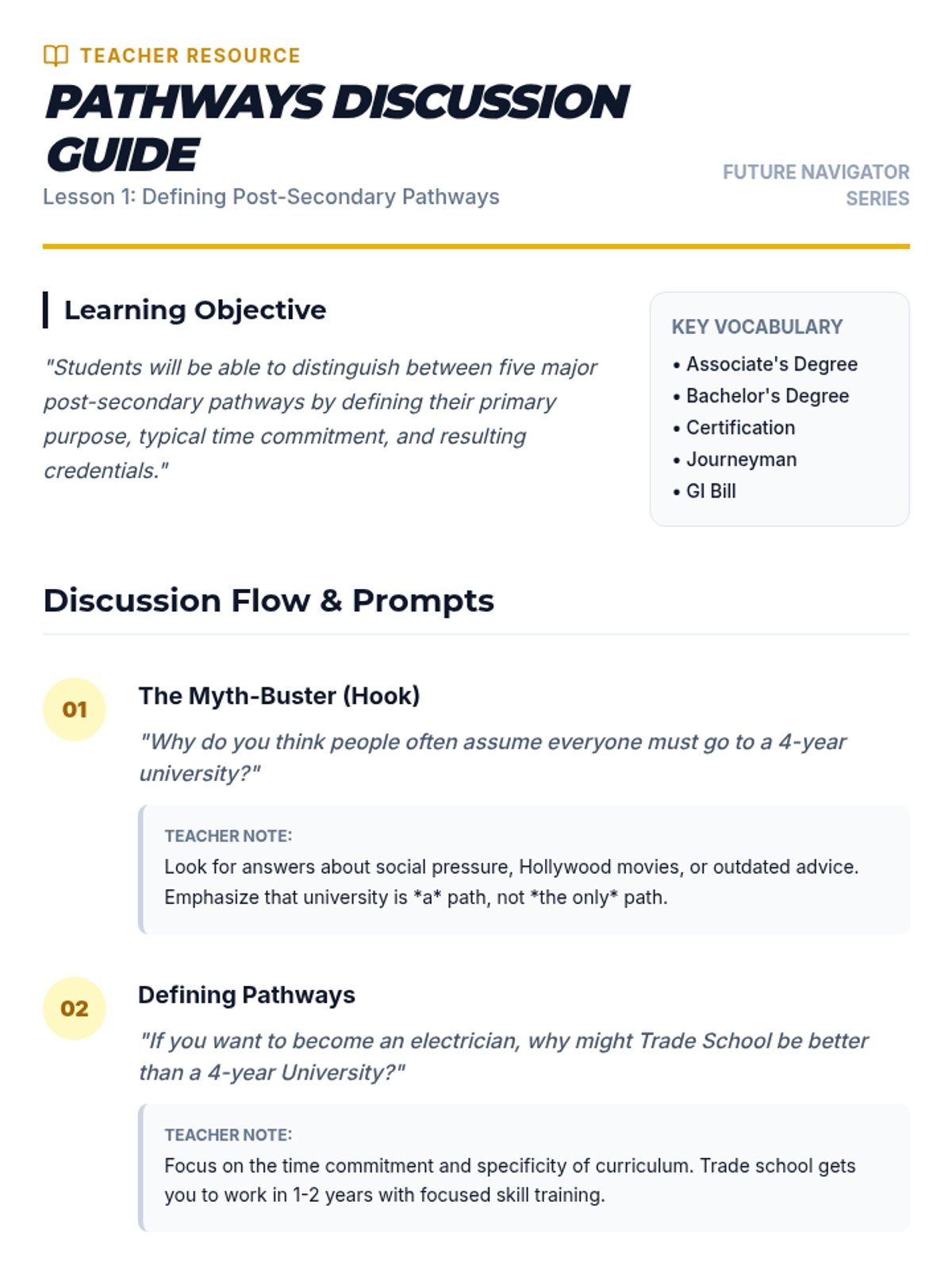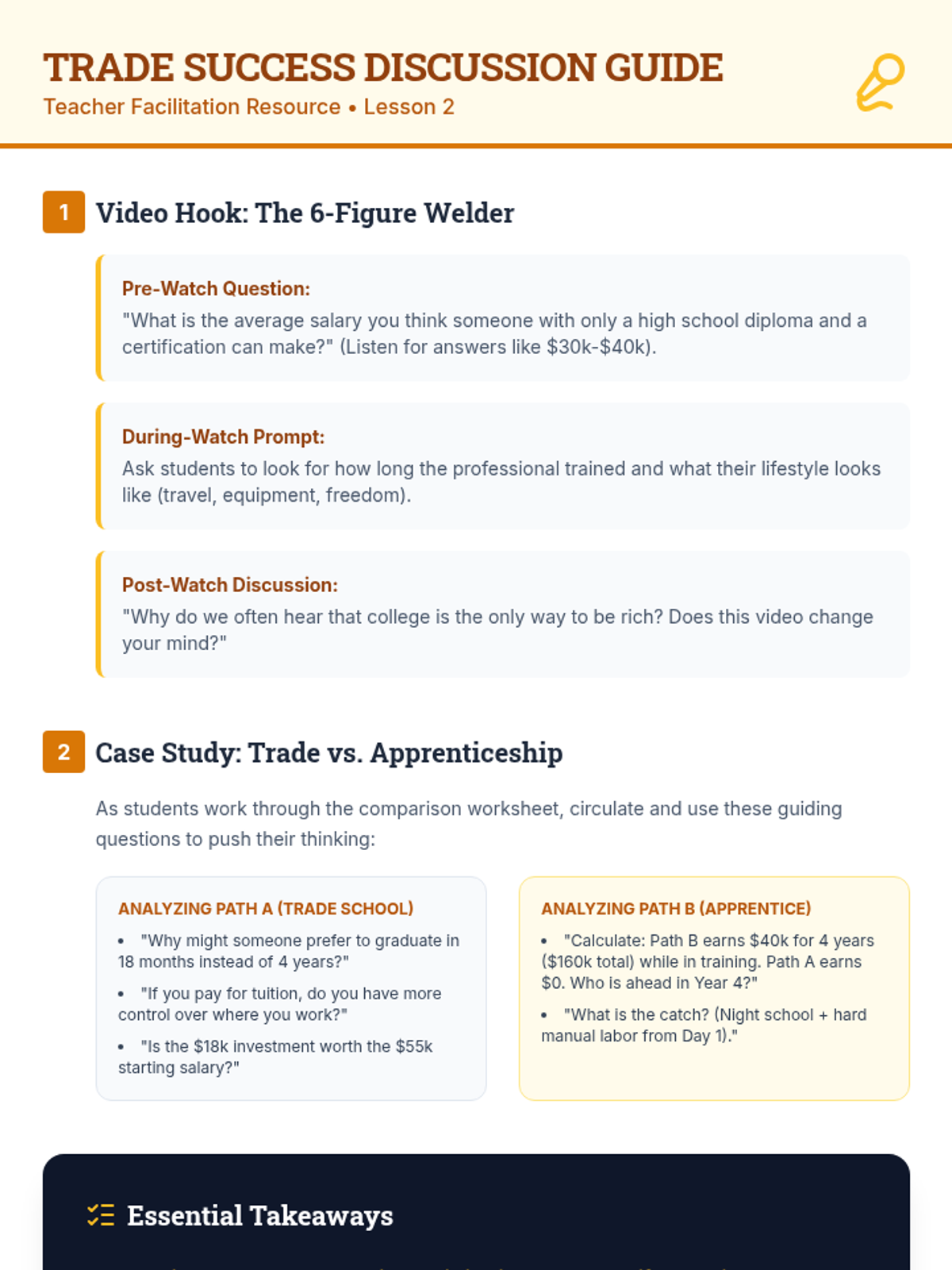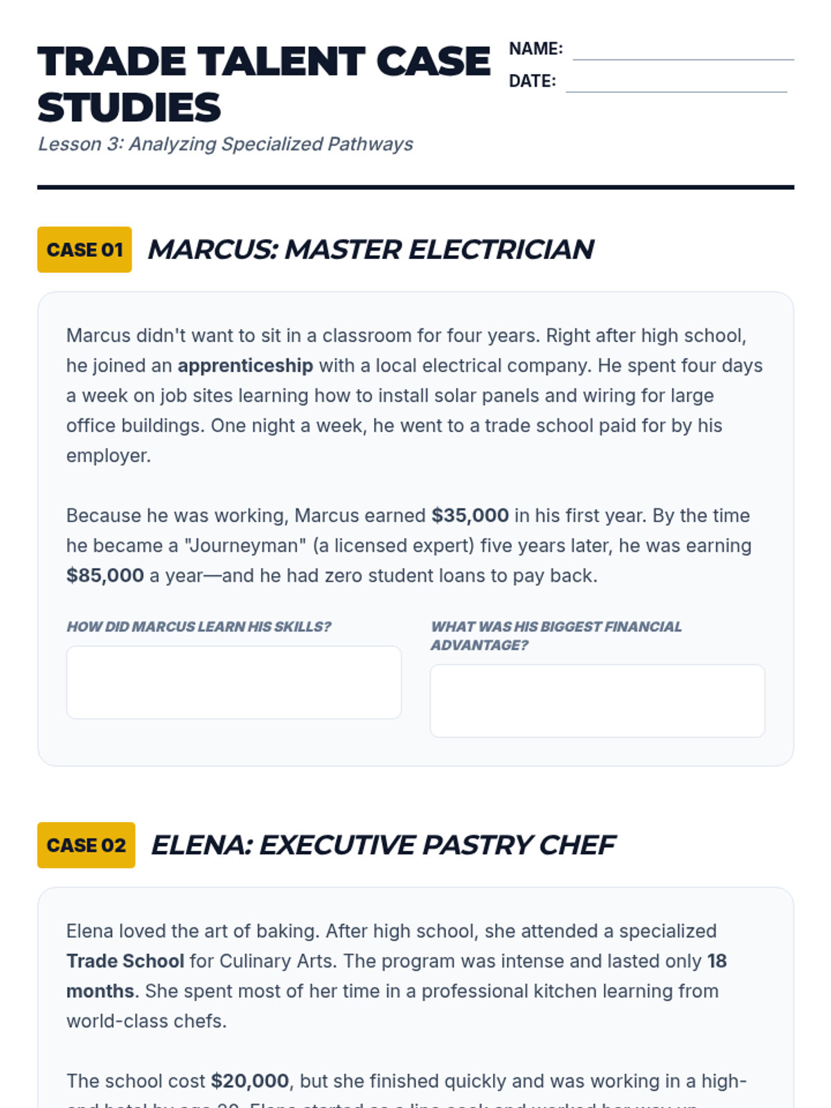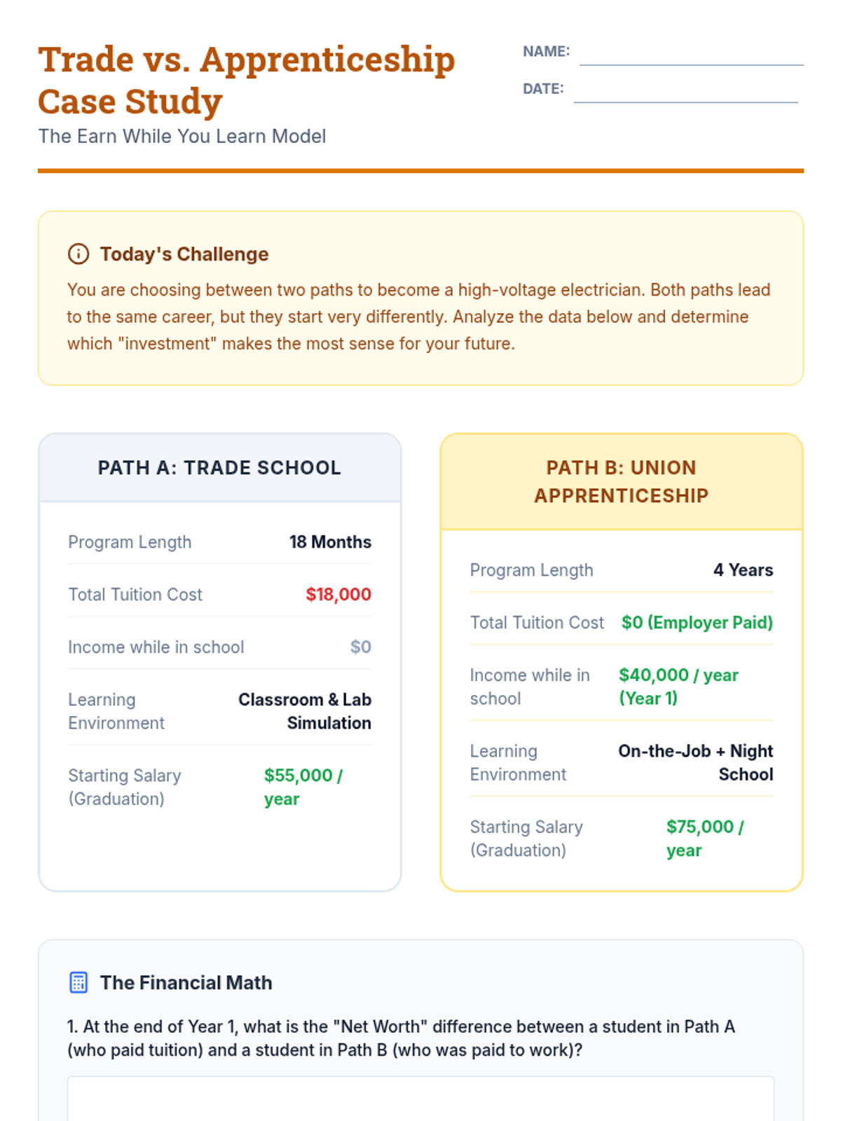 This lesson focuses on Career and Technical Education (CTE). Students investigate skilled trades, analyzing the cost of trade school versus the 'earn while you learn' model of apprenticeships.