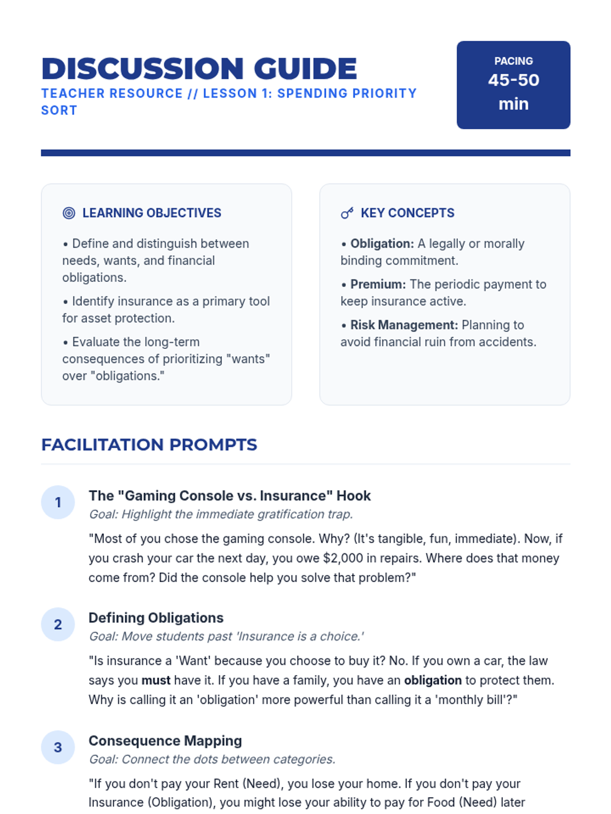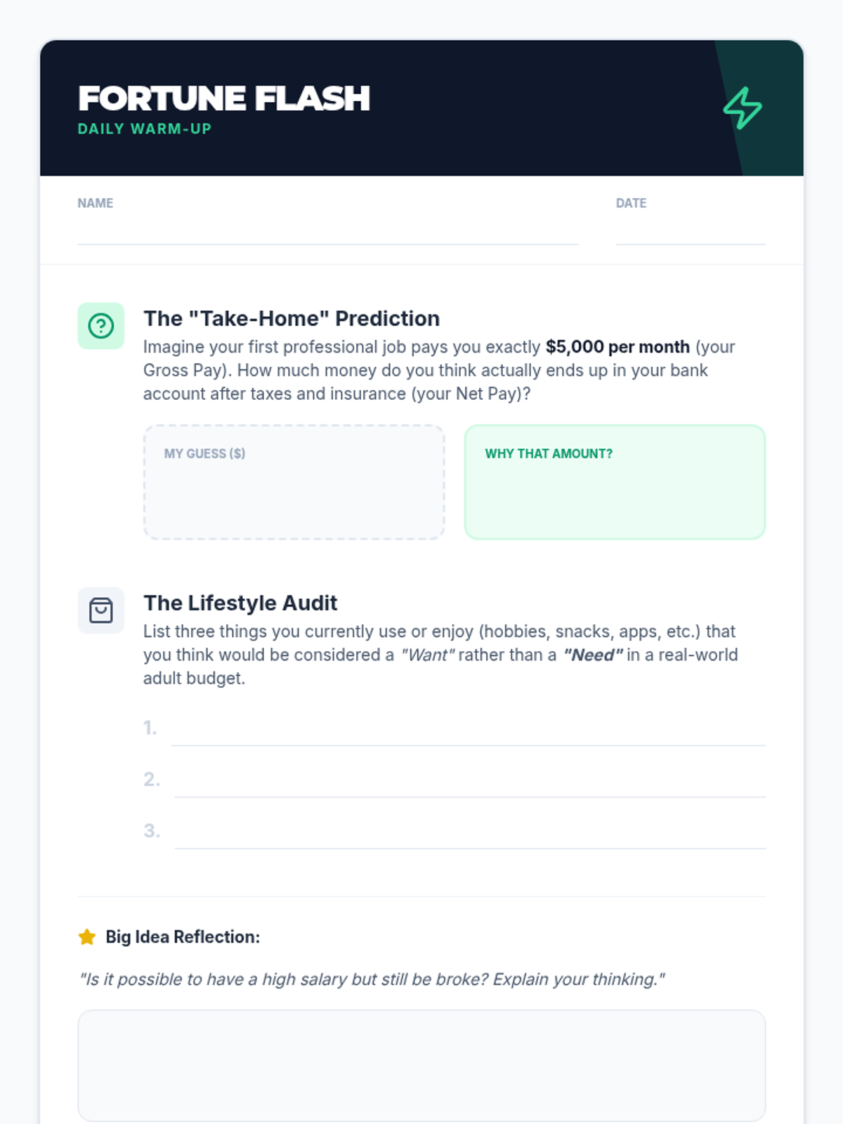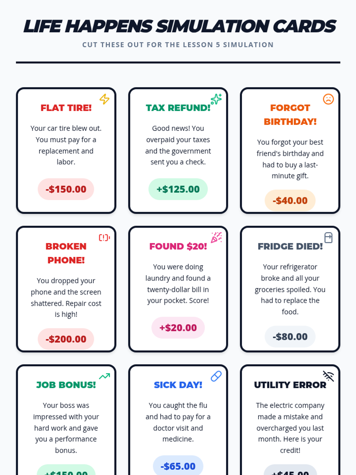 A comprehensive personal finance lesson where students learn to manage income, expenses, and savings through a realistic budget simulation and decision-making activities.
