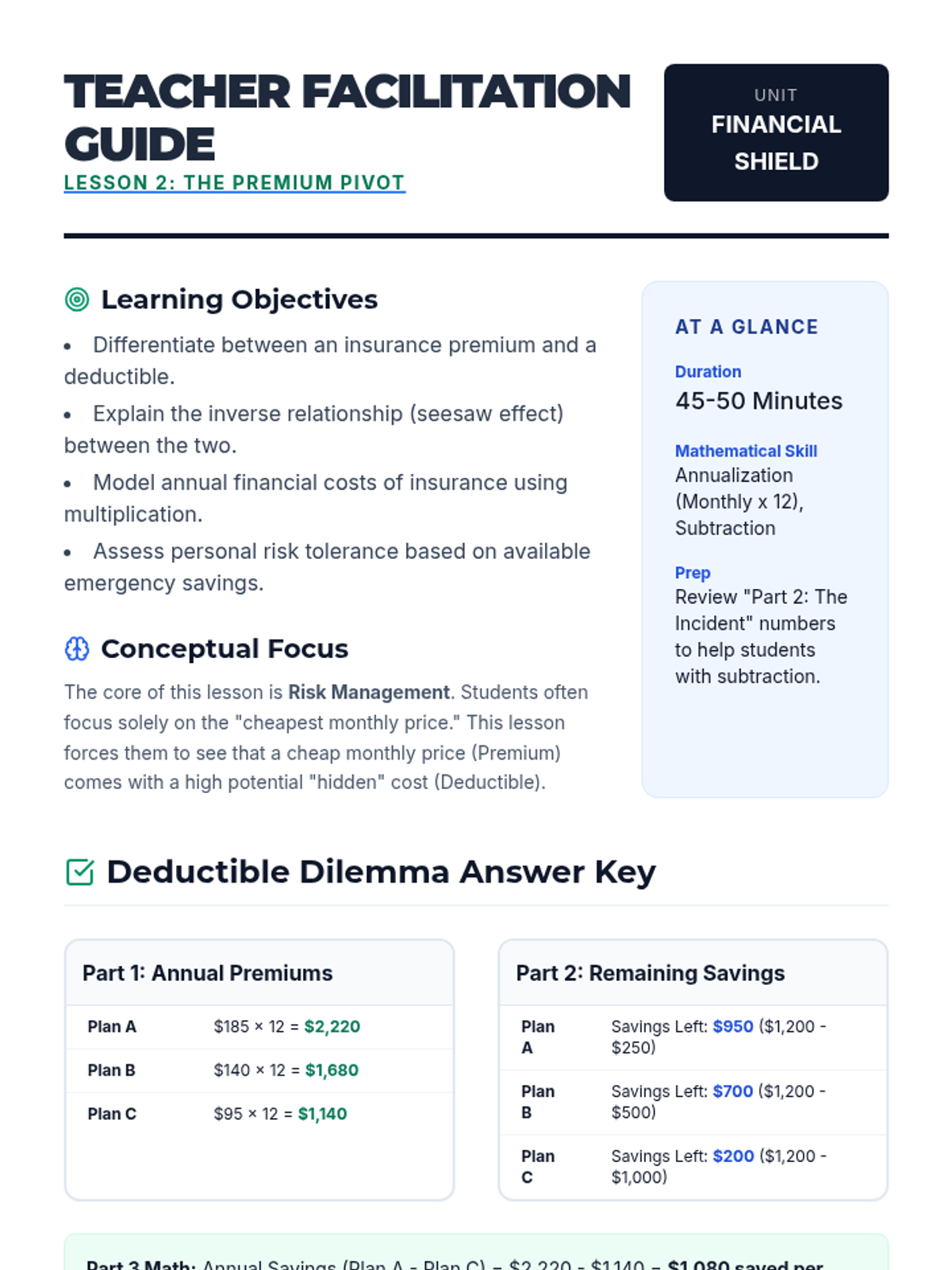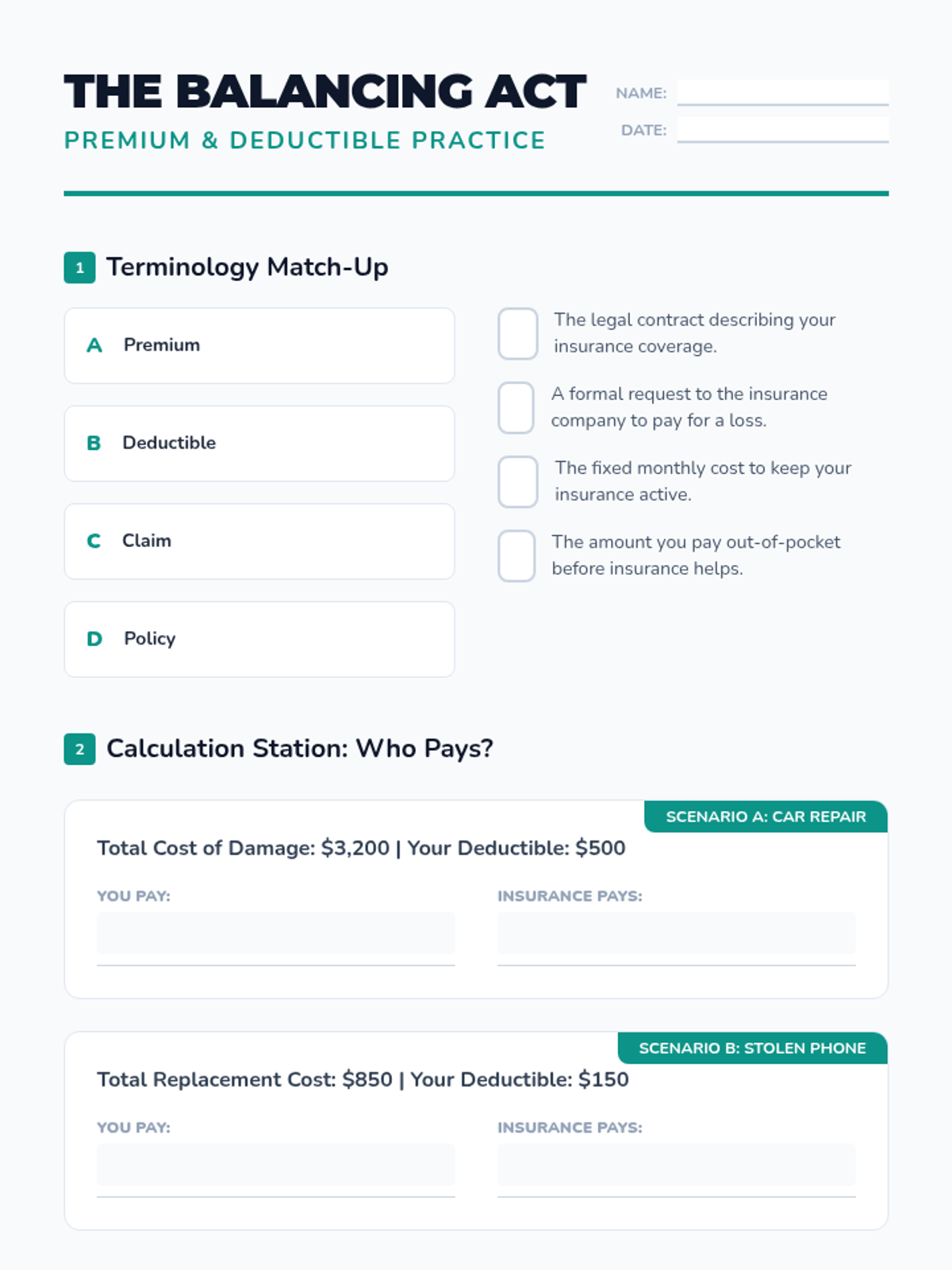 Students define and calculate premiums and deductibles, discovering the inverse relationship between the two through real-world scenarios.