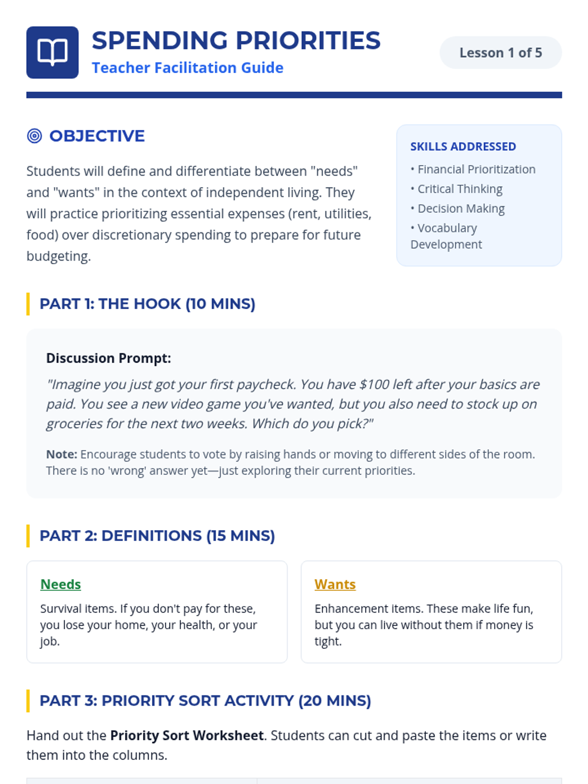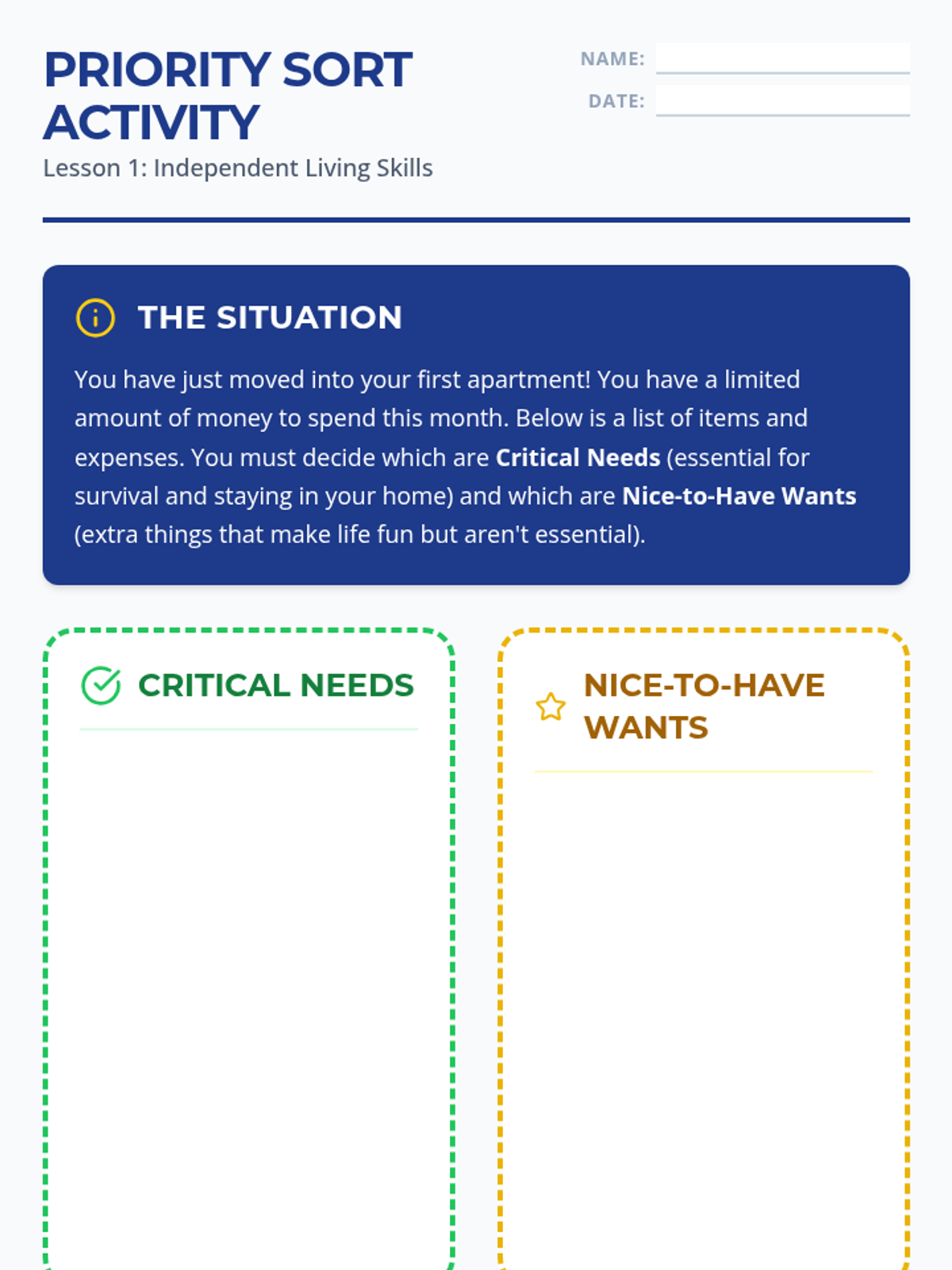 Students learn to distinguish between essential needs and discretionary wants to prioritize spending in an independent living context.