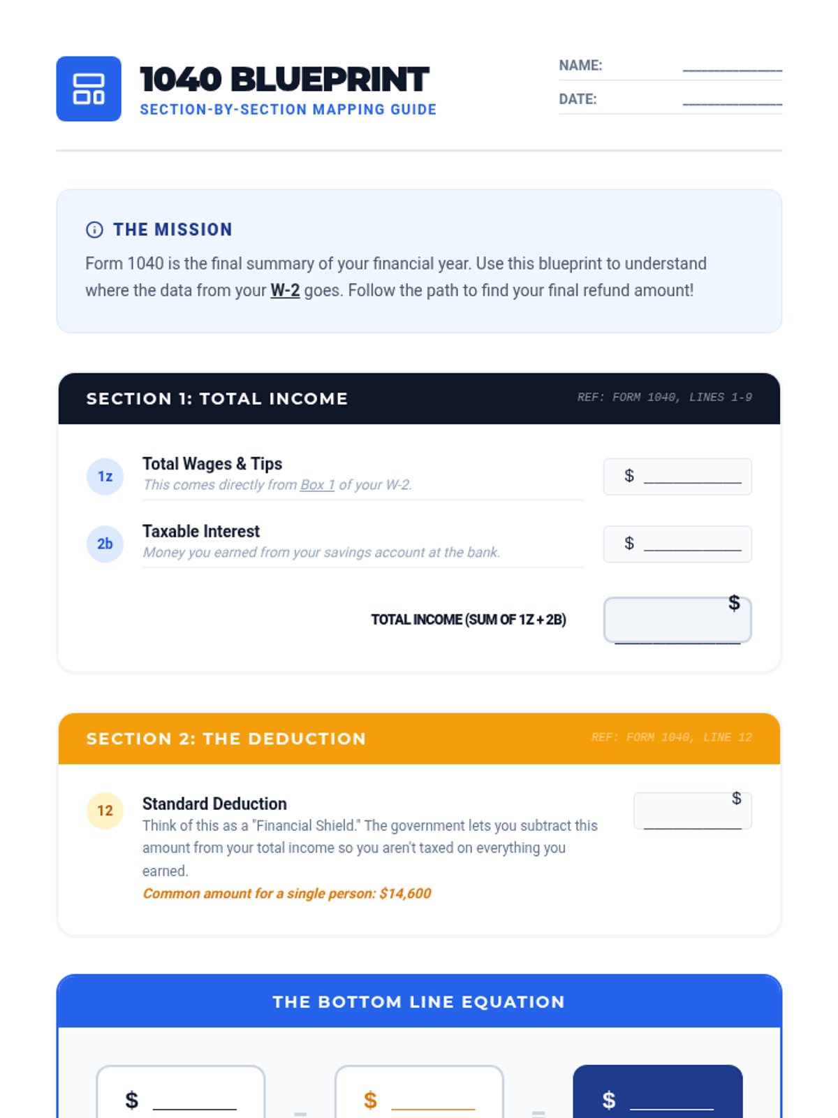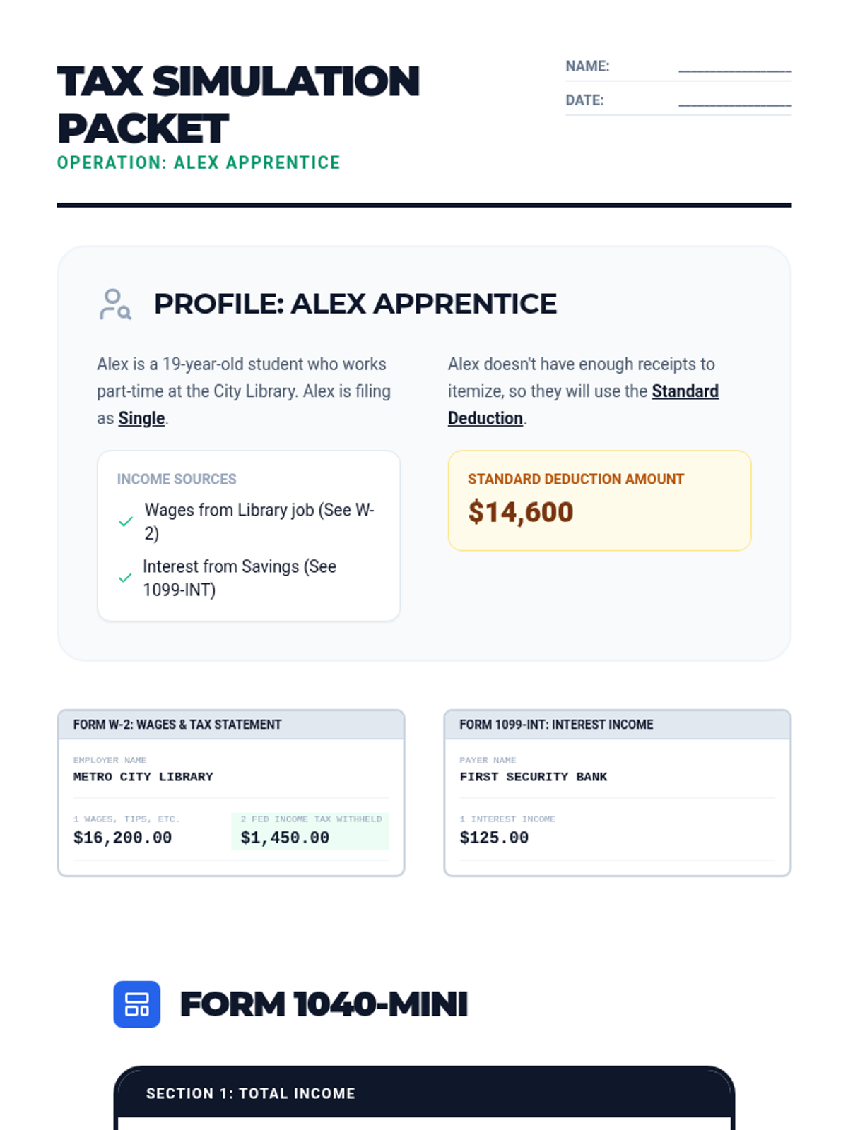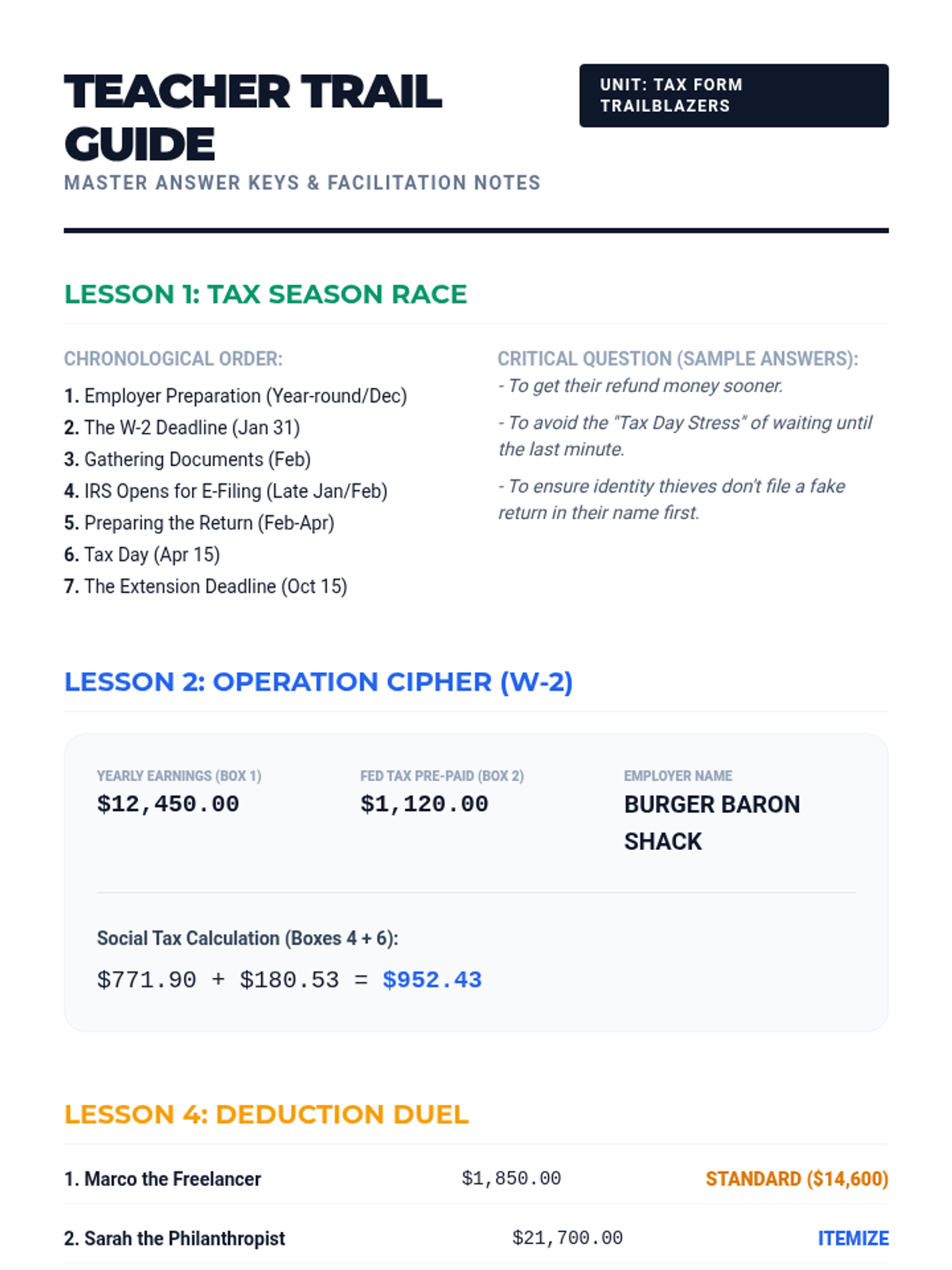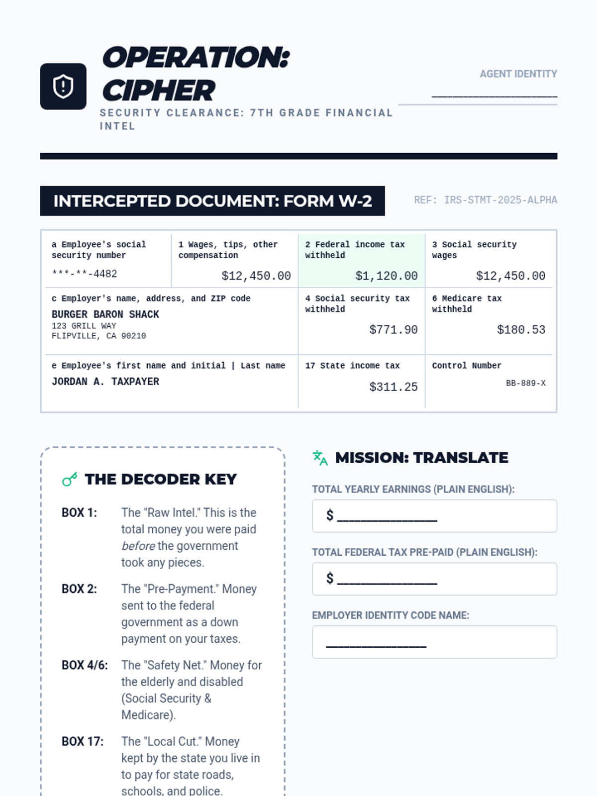 A deep dive into the W-2 form, where students learn to identify income, withholdings, and tax information box by box.