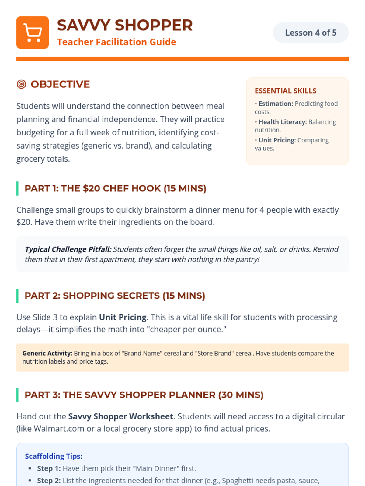 Focuses on the financial and social aspects of grocery shopping. Students calculate costs, manage a budget, and learn the social expectations of visiting a store.