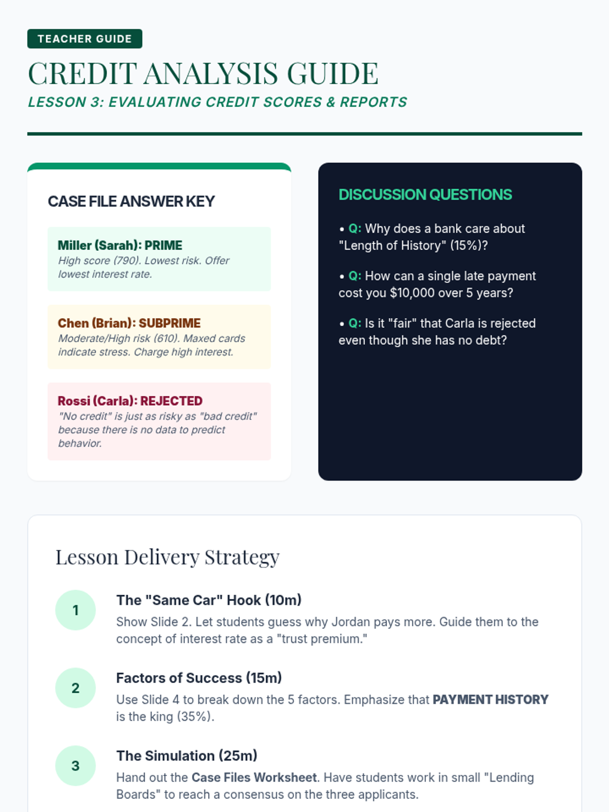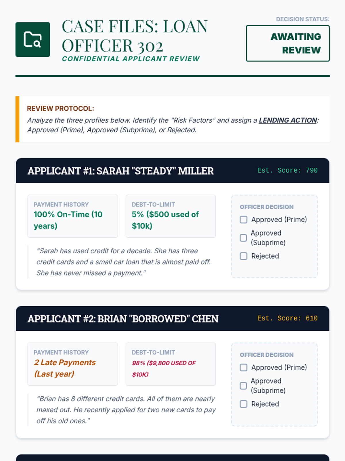 Students act as loan officers to evaluate fictional credit reports and understand the factors that influence credit scores.