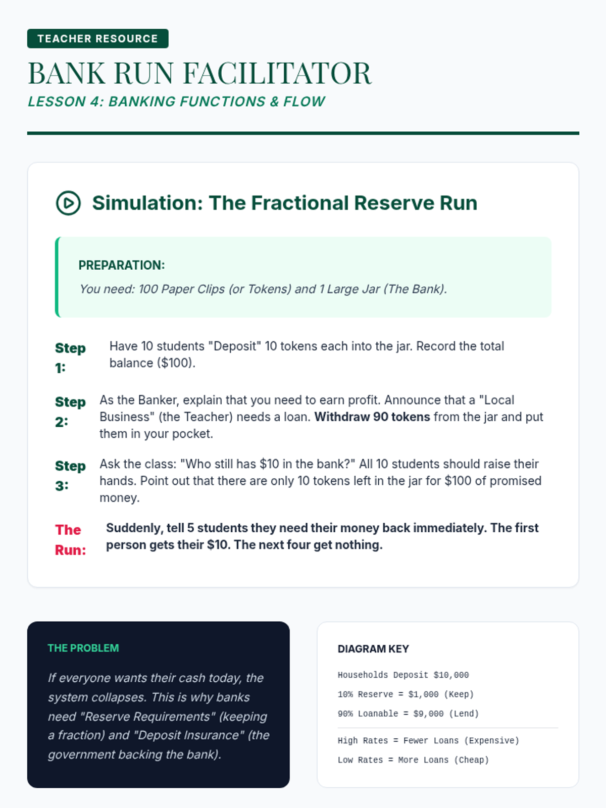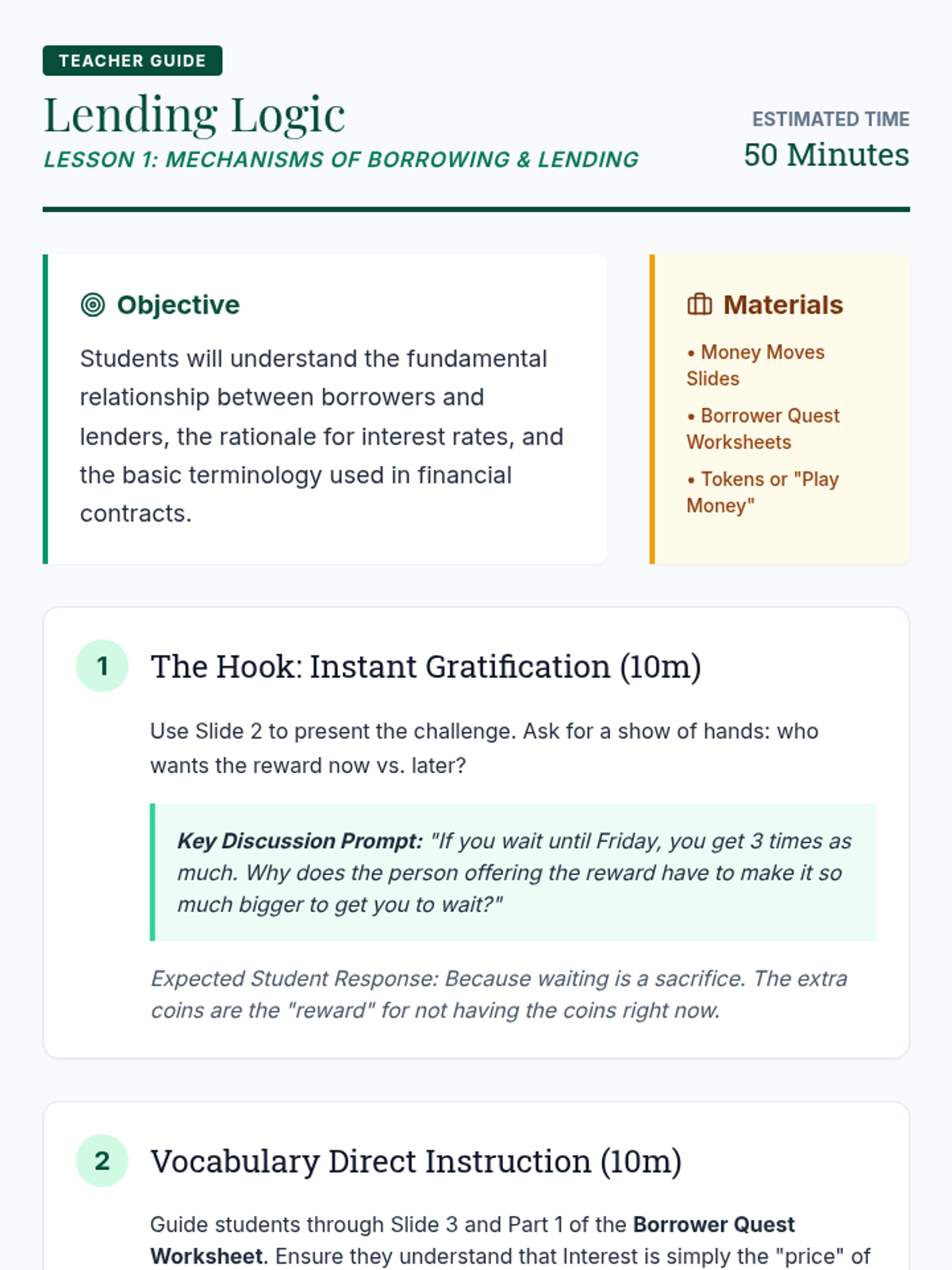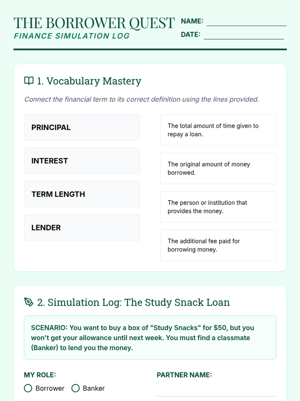 Students explore the foundational relationship between lenders and borrowers through a classroom simulation, defining key terms like principal and interest.