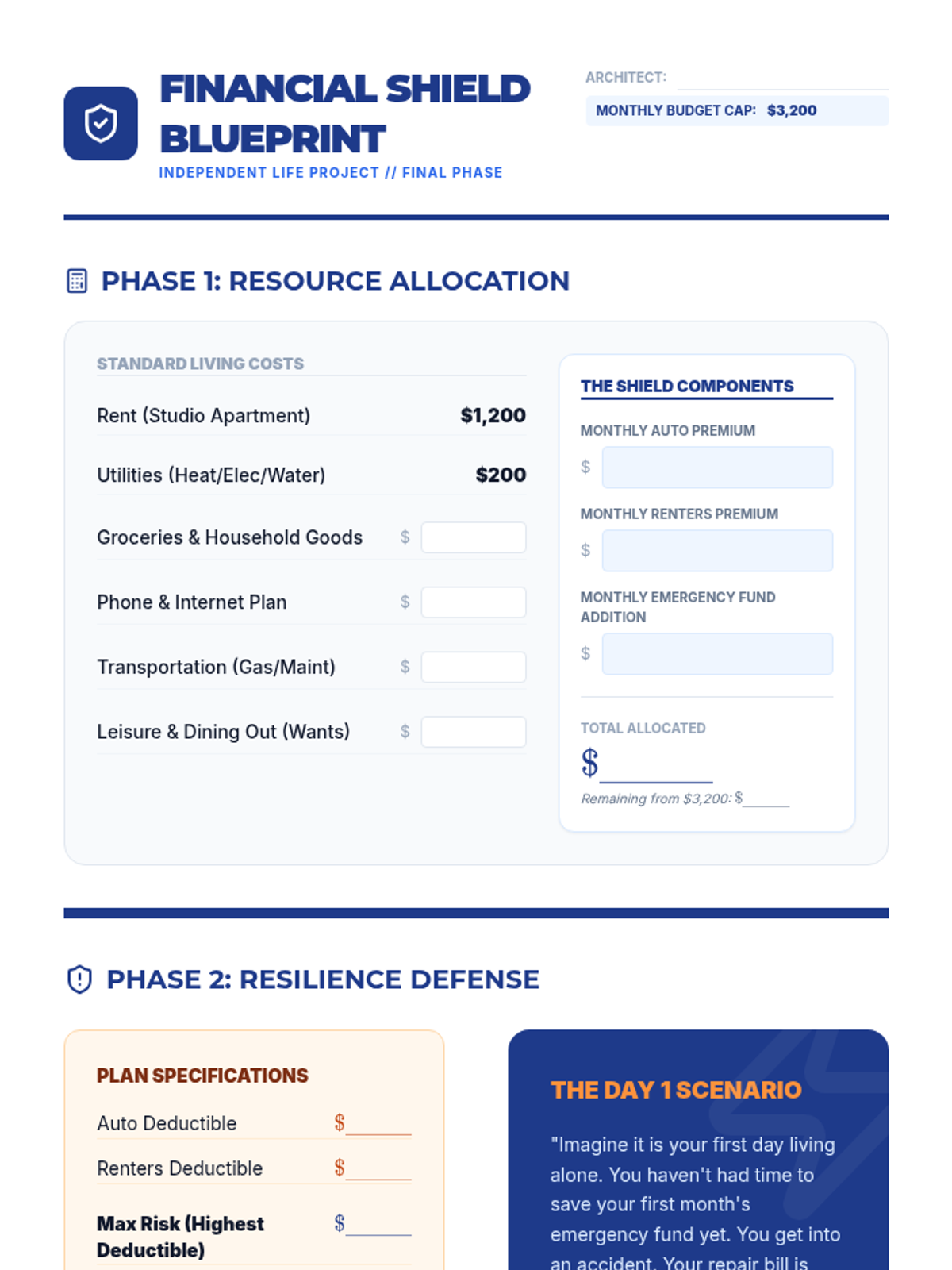Students create a fictional monthly budget for independent life, allocating funds for insurance premiums and emergency savings.