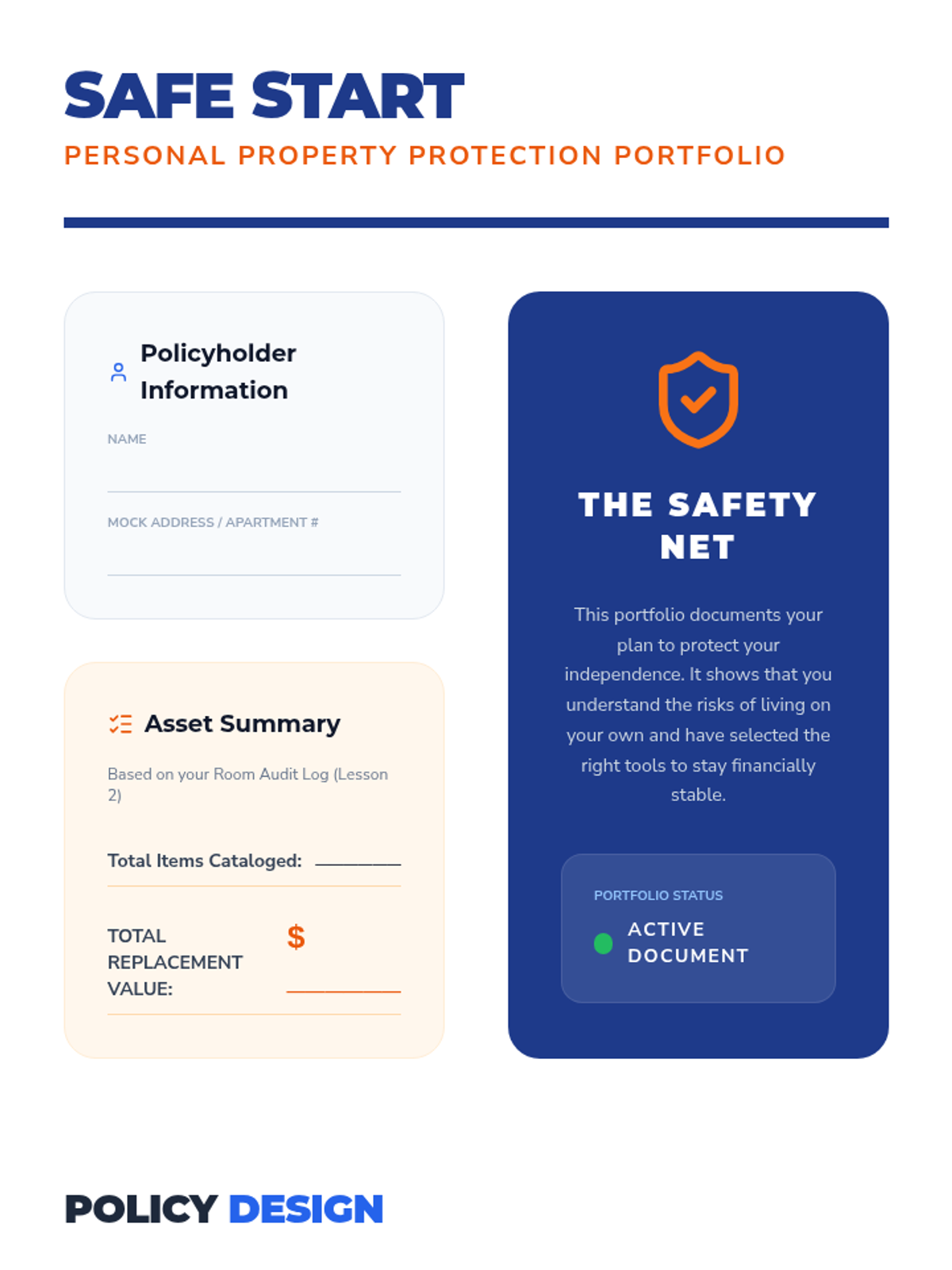 Students synthesize their learning by creating a 'Protection Portfolio' for their first hypothetical apartment, selecting coverage limits and deductibles.