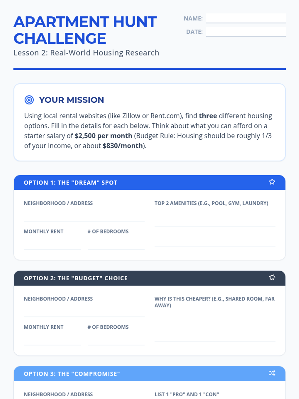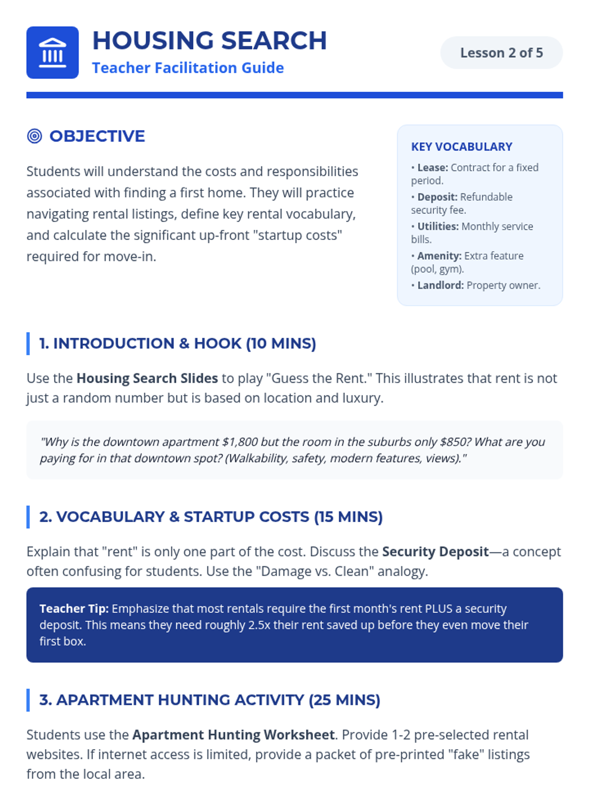 A practical financial literacy lesson designed to empower students with unstable housing to manage small amounts of money and plan for a more secure future.