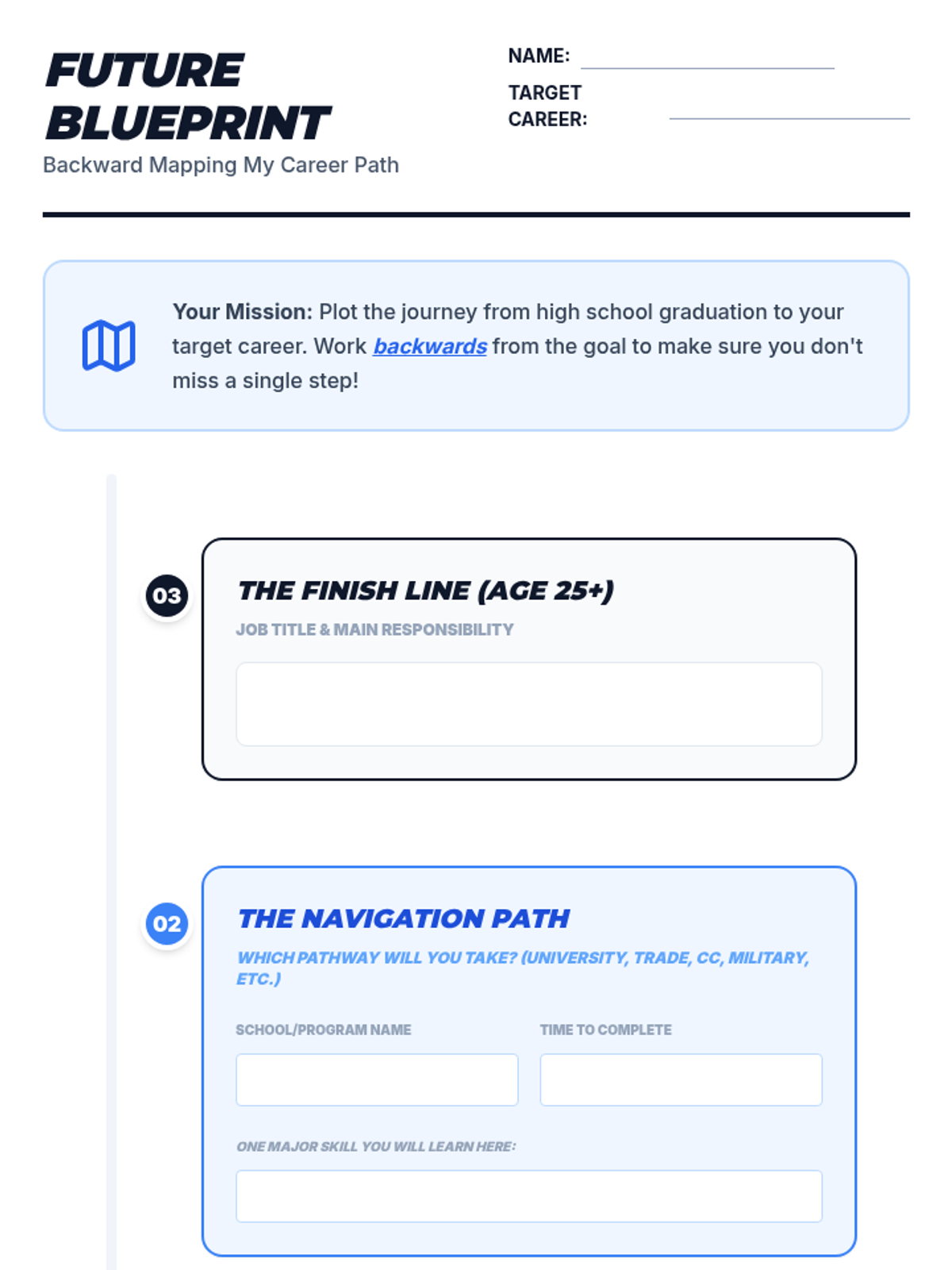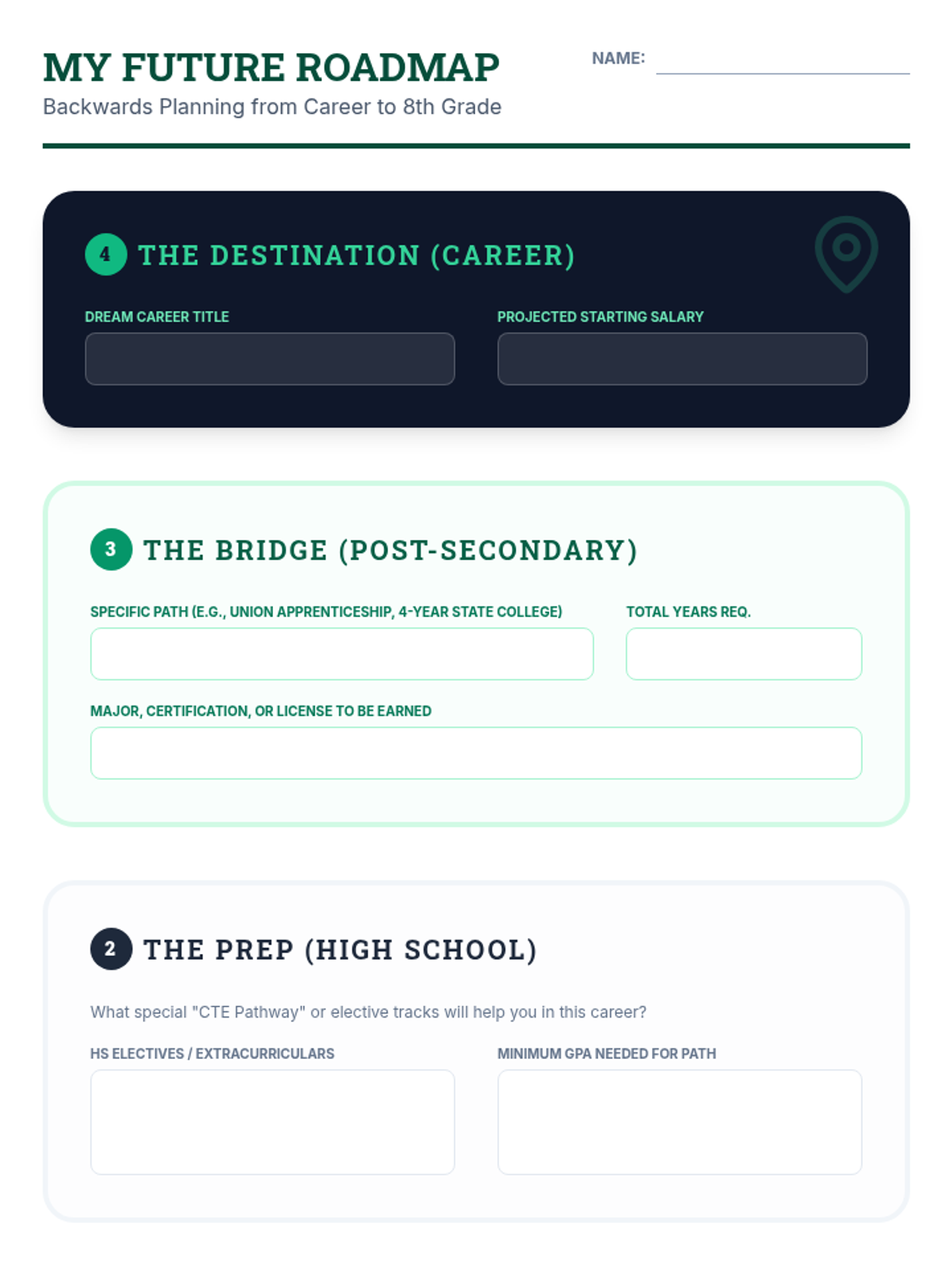 Students select a target career and create a backward-mapped timeline from their dream job to high school graduation.