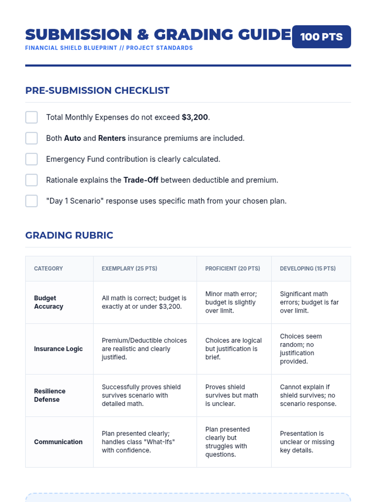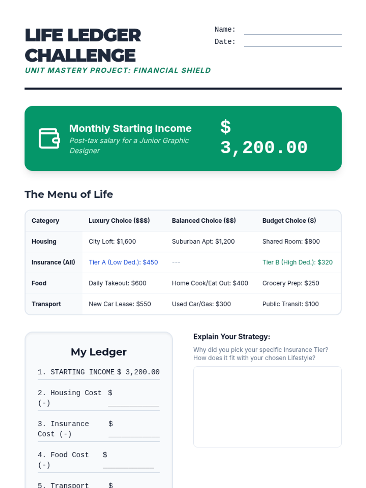 A final project where students build a complete monthly budget based on a specific persona. They must fit auto, health, and renters insurance into their financial plan while maintaining a positive balance.
