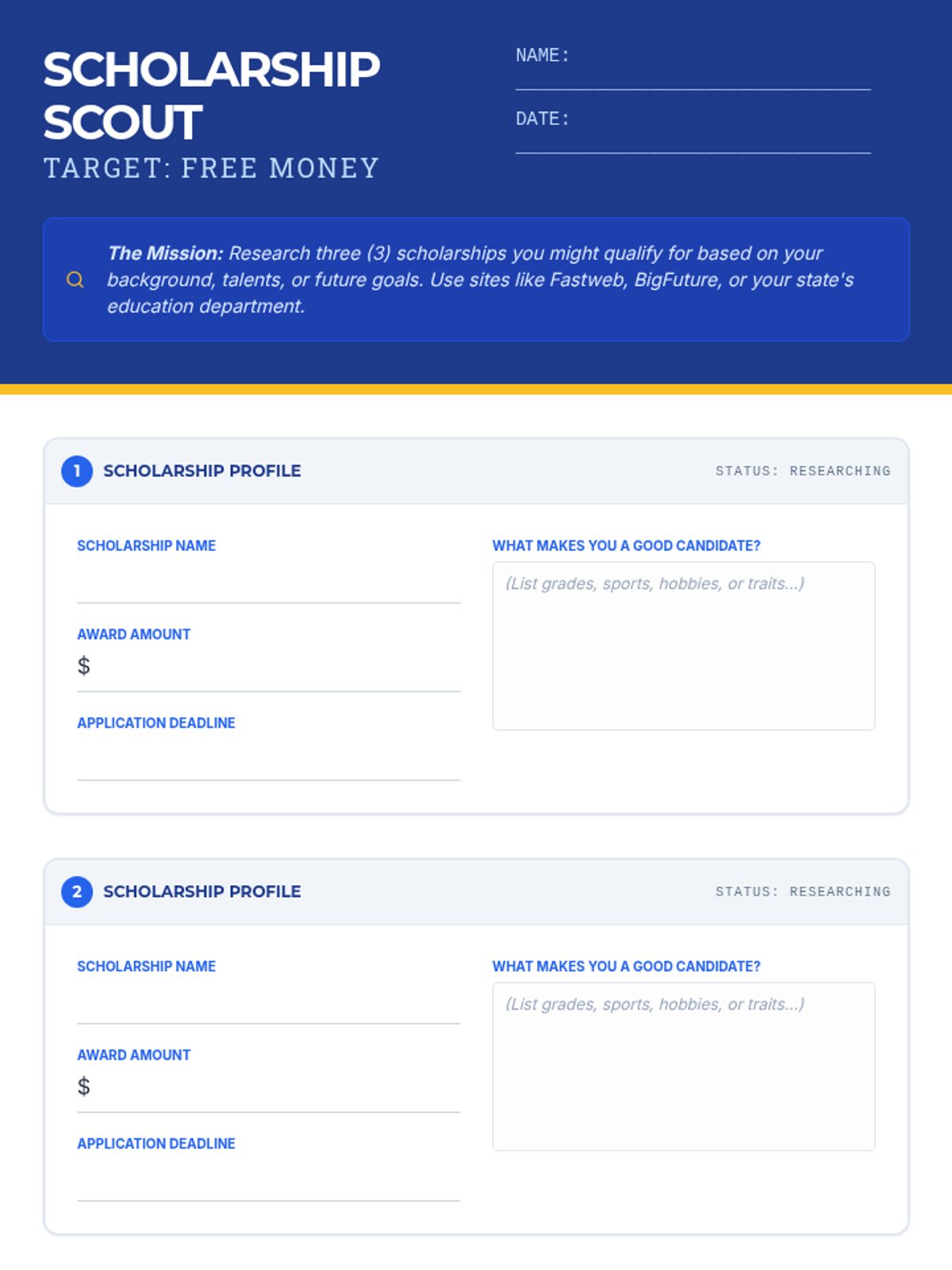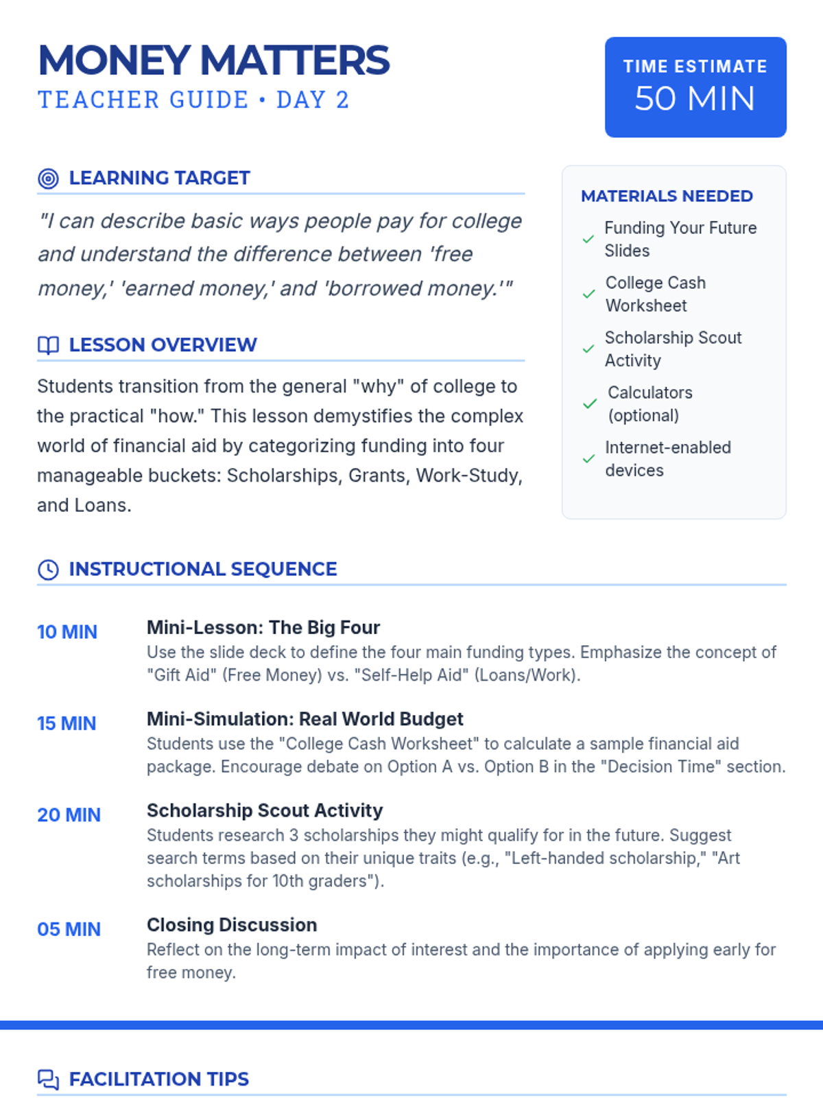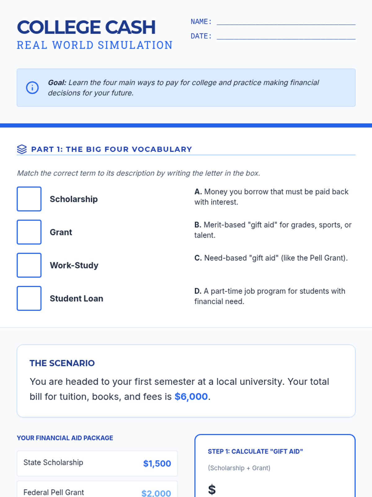 A lesson covering the four main ways to pay for college: scholarships, grants, work-study, and loans, featuring a budget simulation and a scholarship research activity.