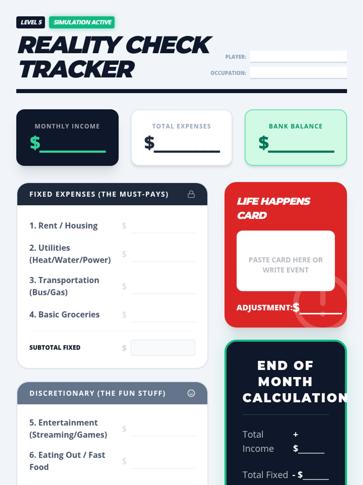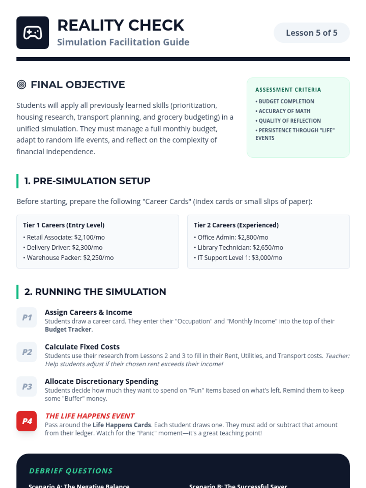 A culminating simulation where students manage a monthly budget based on a mock salary and navigate unexpected life expenses.