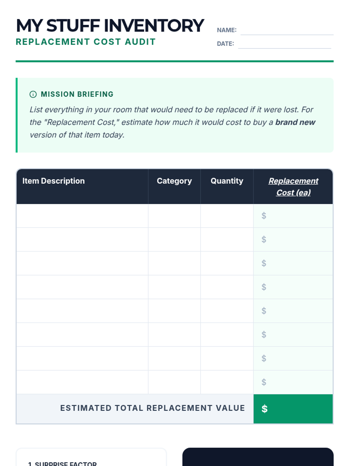 Students inventory the value of the items in their own bedrooms to understand the necessity of renters insurance for protecting personal belongings.
