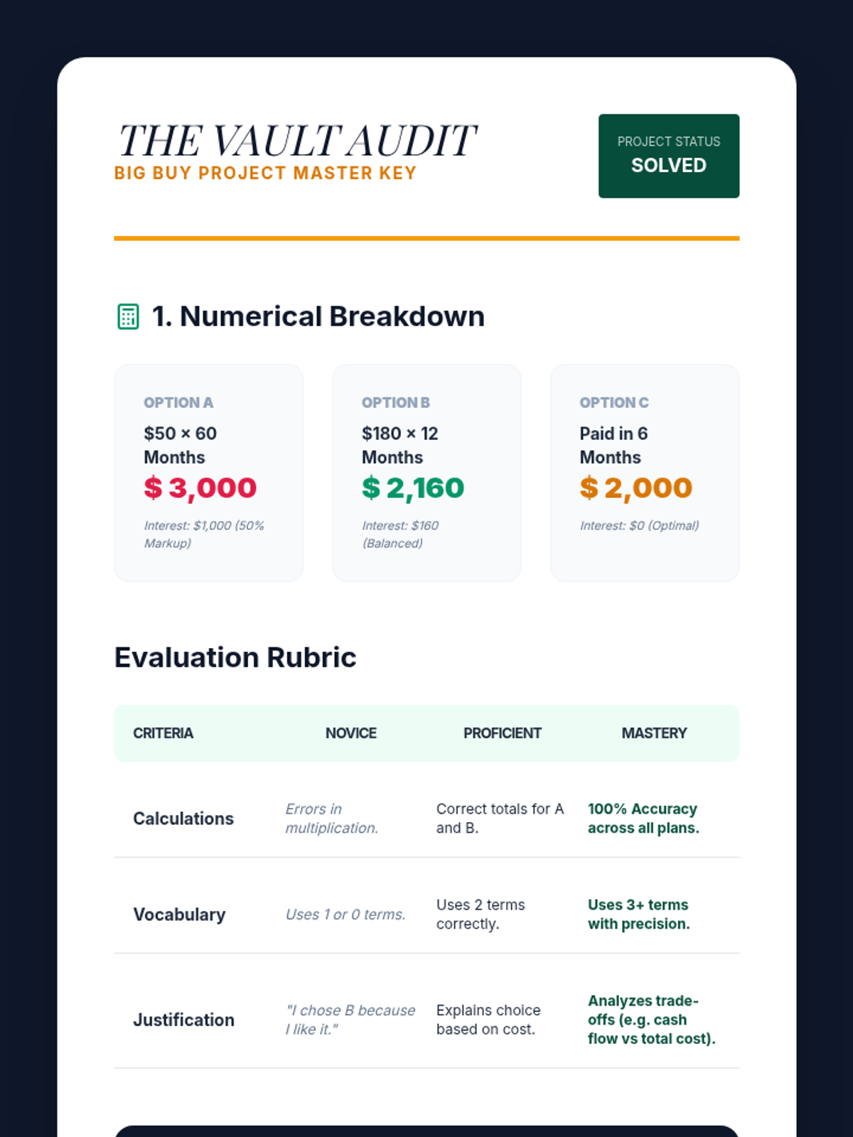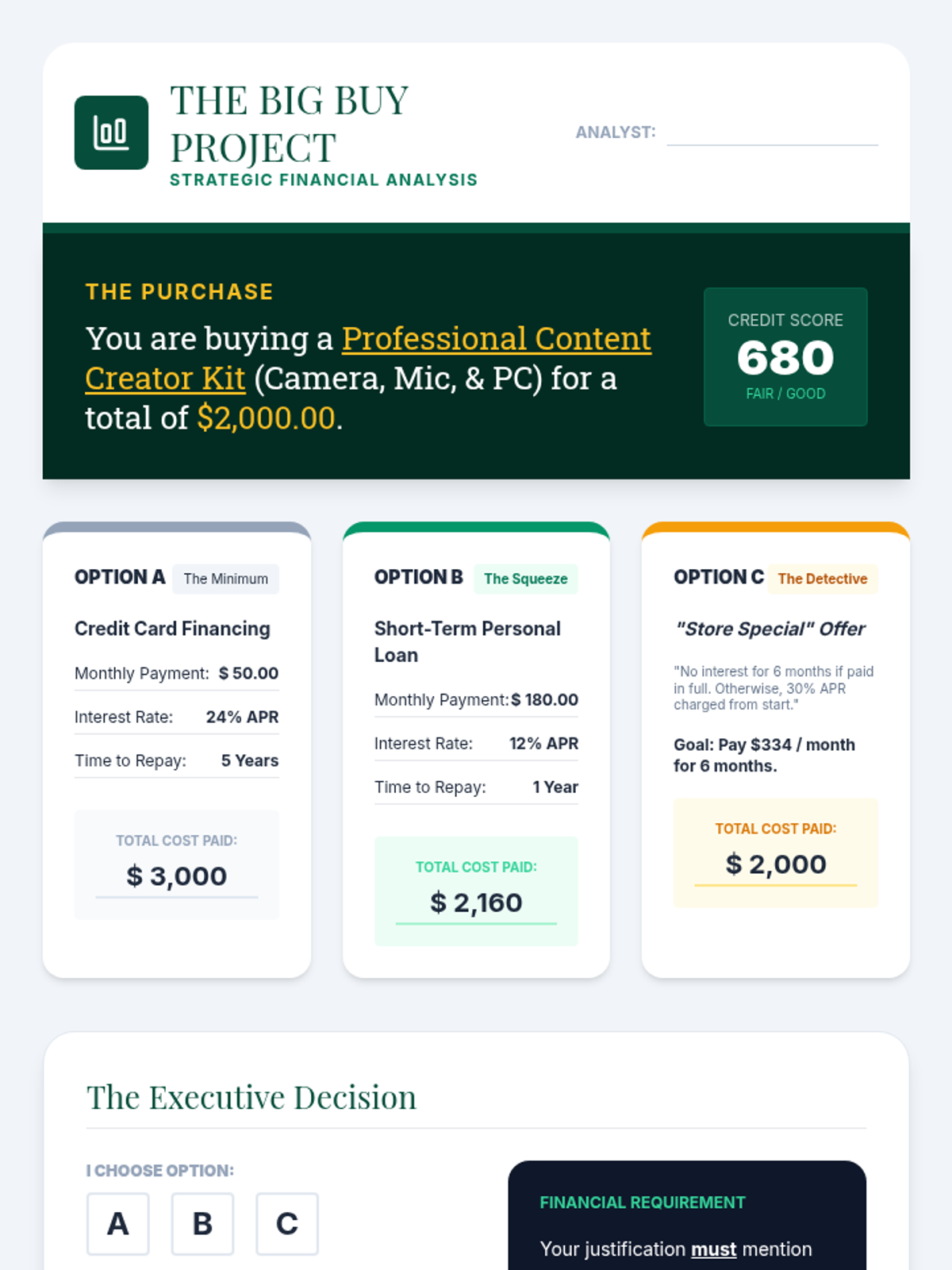 A culminating performance task where students evaluate financing options for a major purchase and analyze 'fine print' in financial offers.