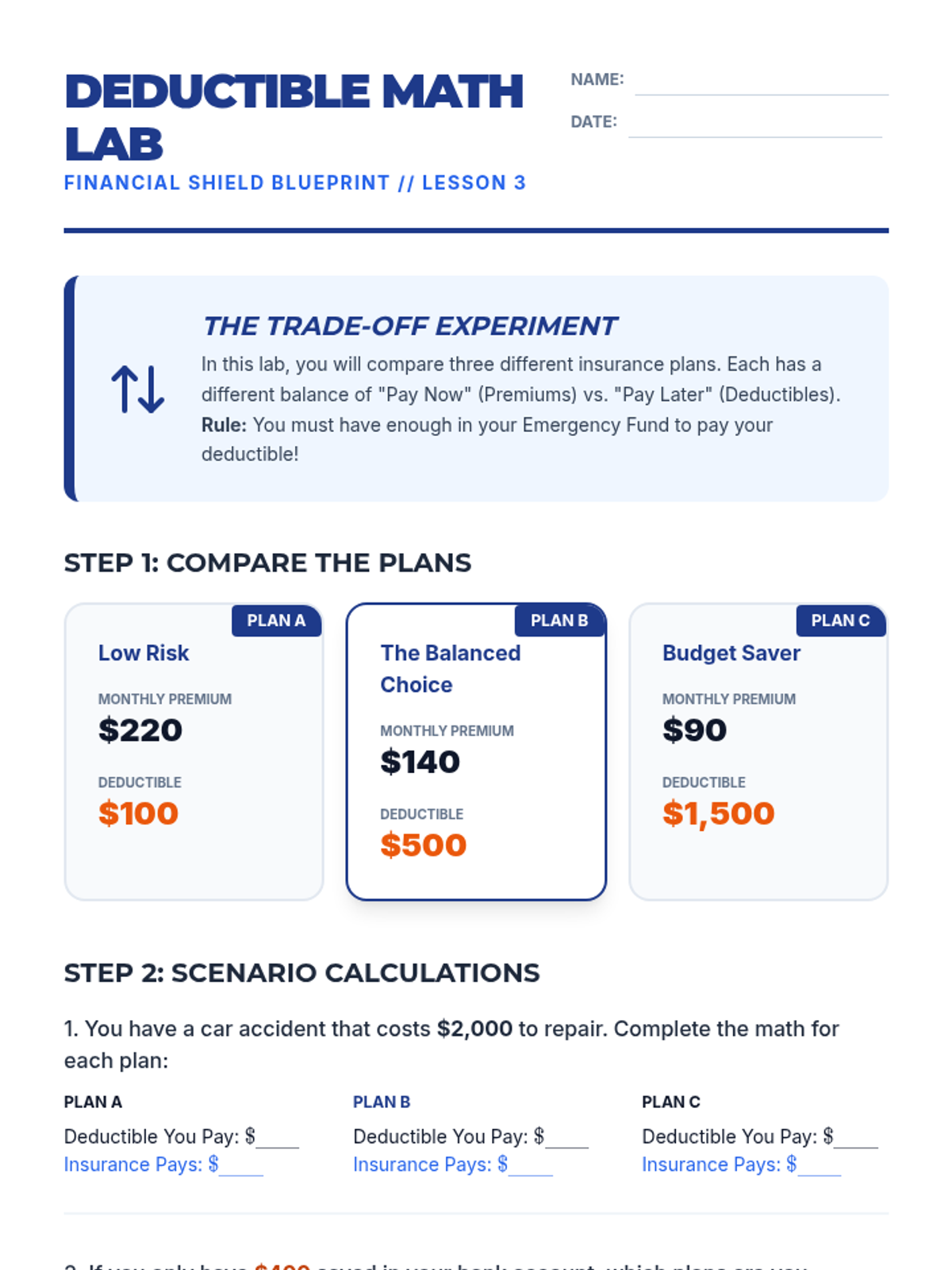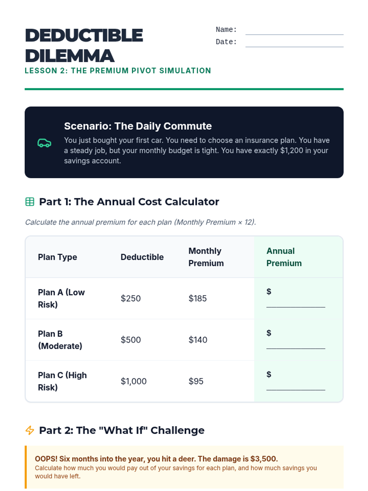 Students explore the mathematical relationship between insurance deductibles and emergency funds, simulating financial risks.