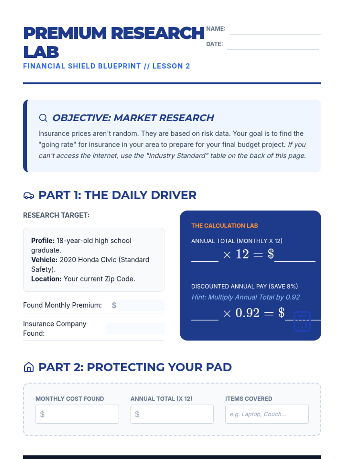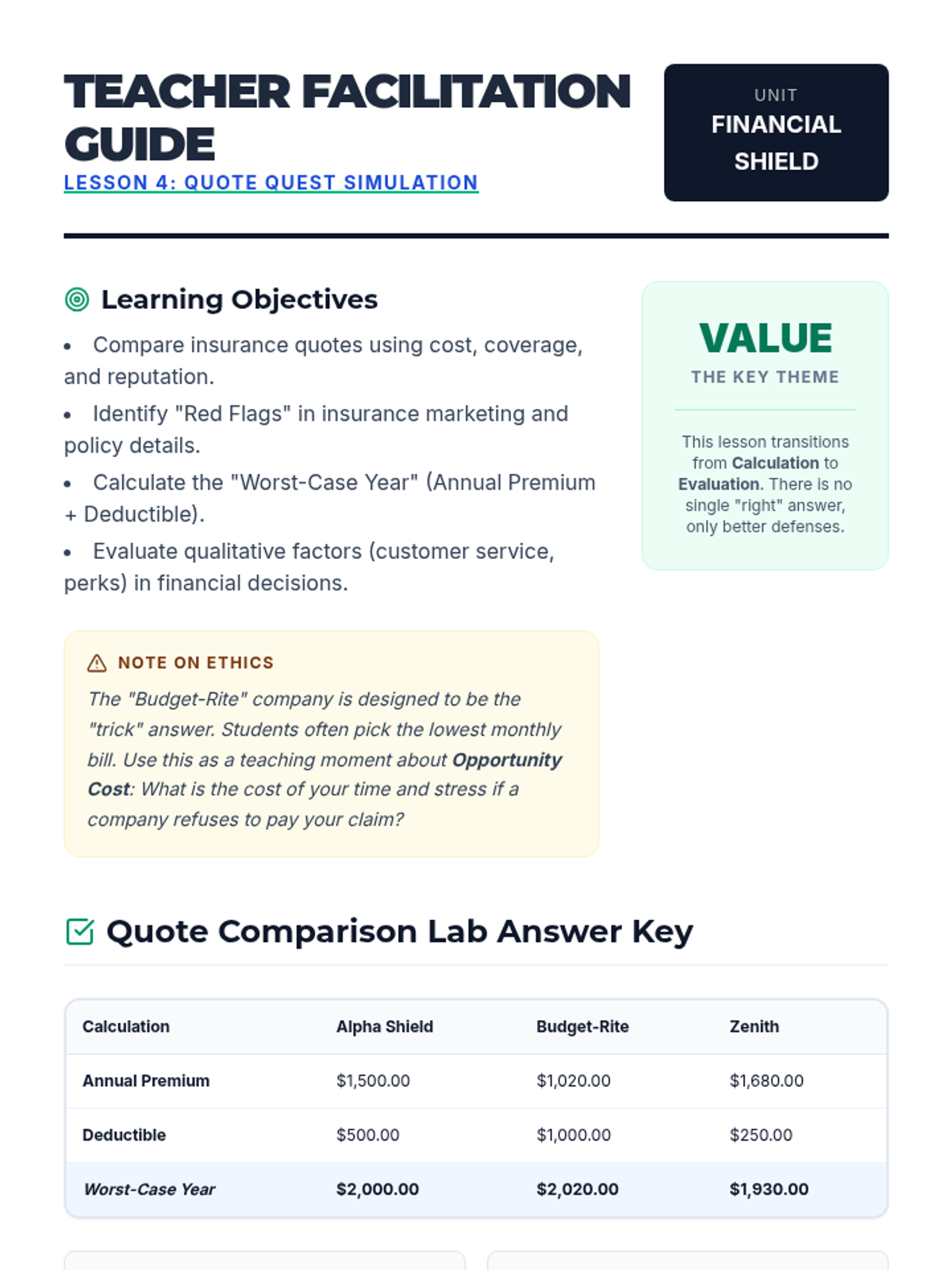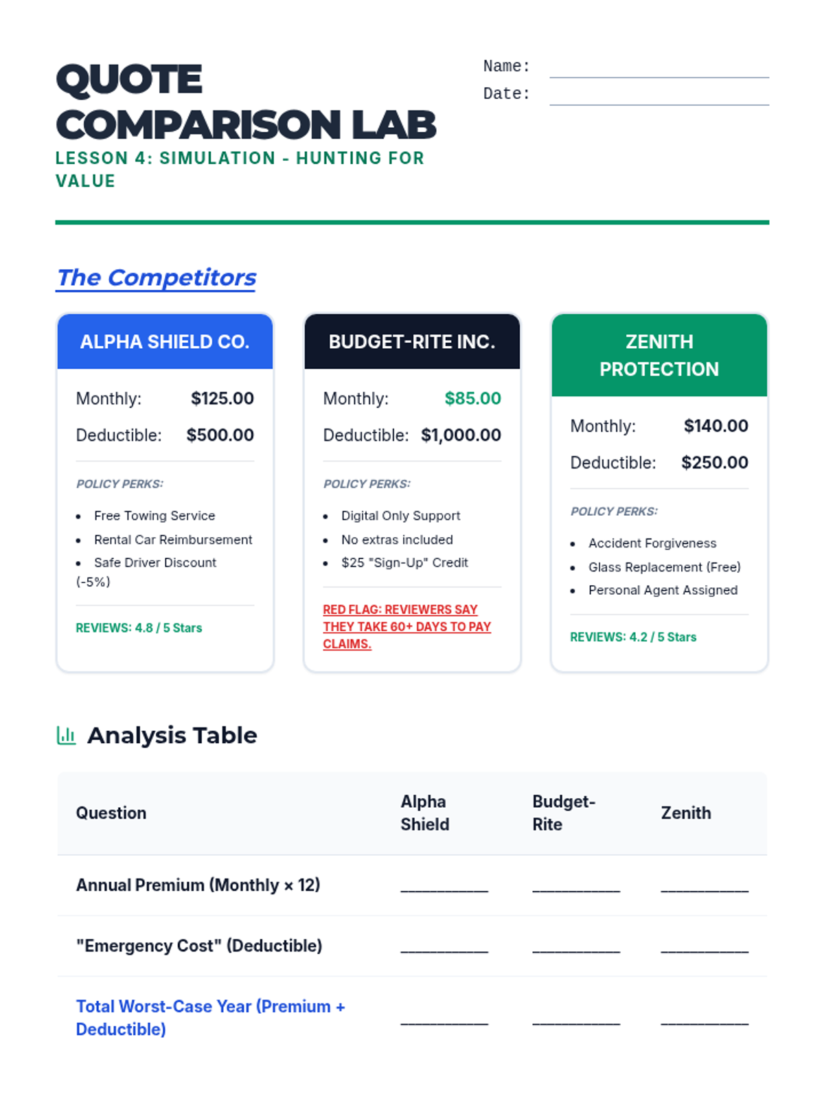 Students simulate comparison shopping by evaluating fictional insurance quotes. They learn to look beyond the monthly price to find actual value and appropriate coverage.