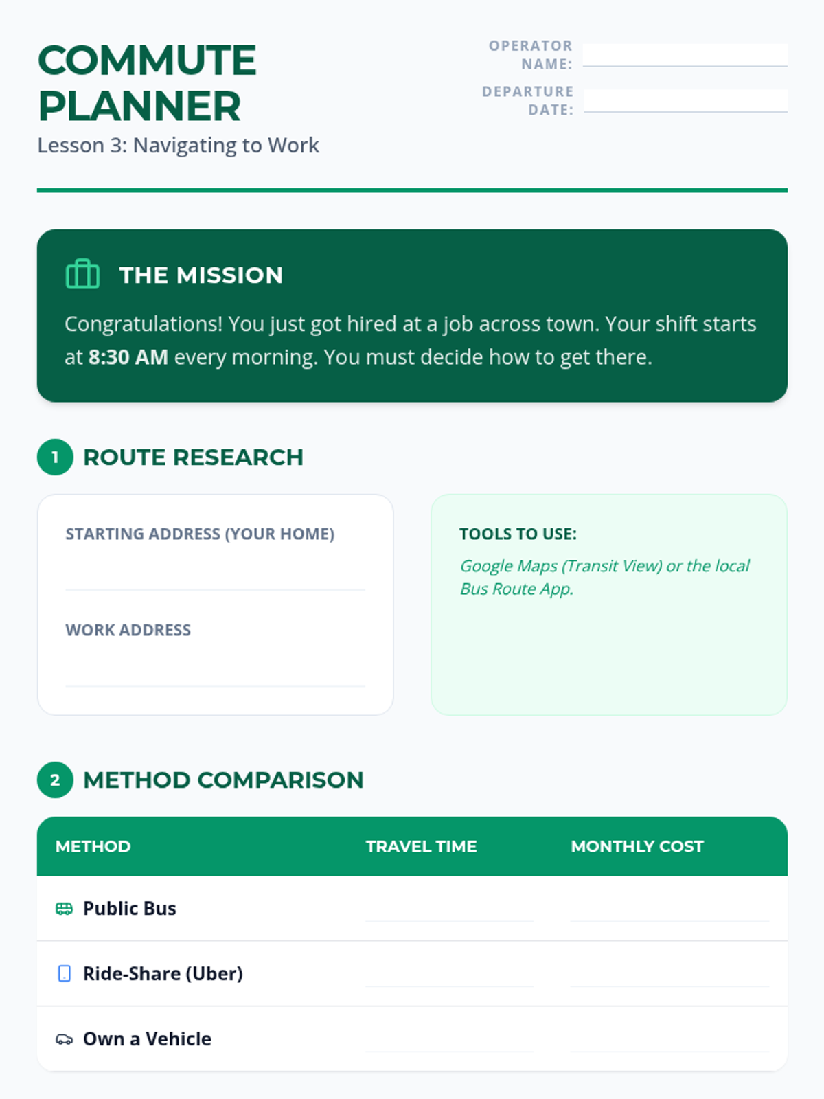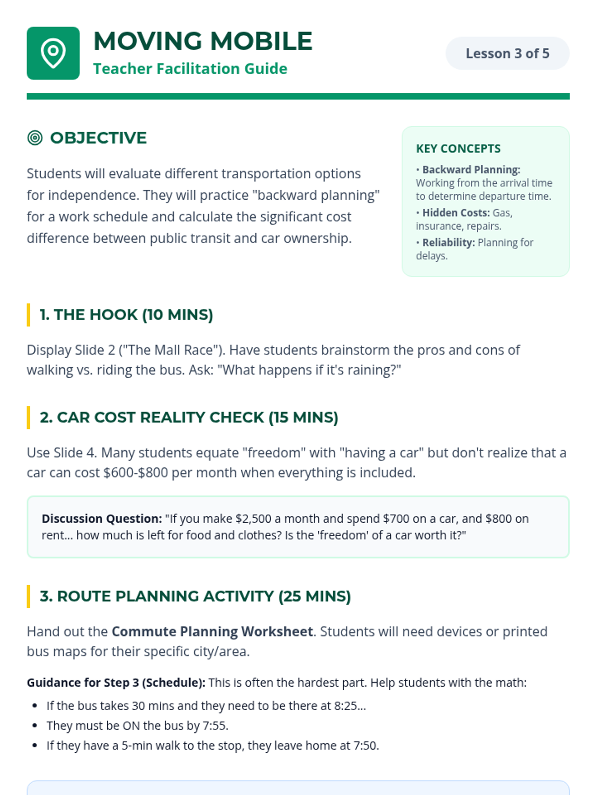 Students analyze various transportation methods, plan routes, and compare the costs of public transit versus vehicle ownership.