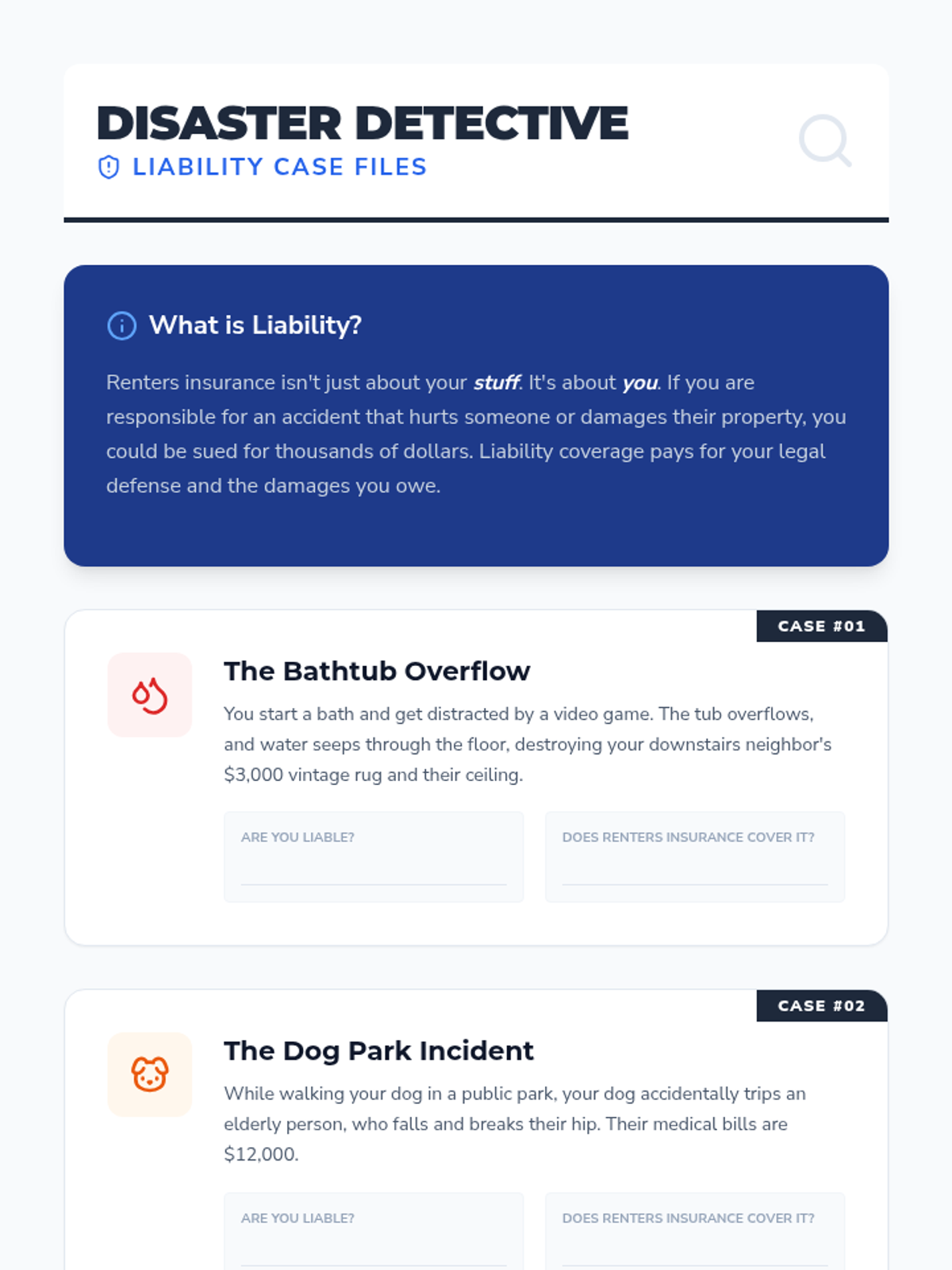 Students analyze scenarios involving personal liability, understanding that renters insurance protects more than just their physical stuff.