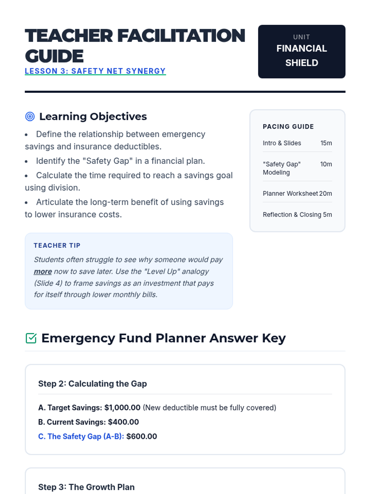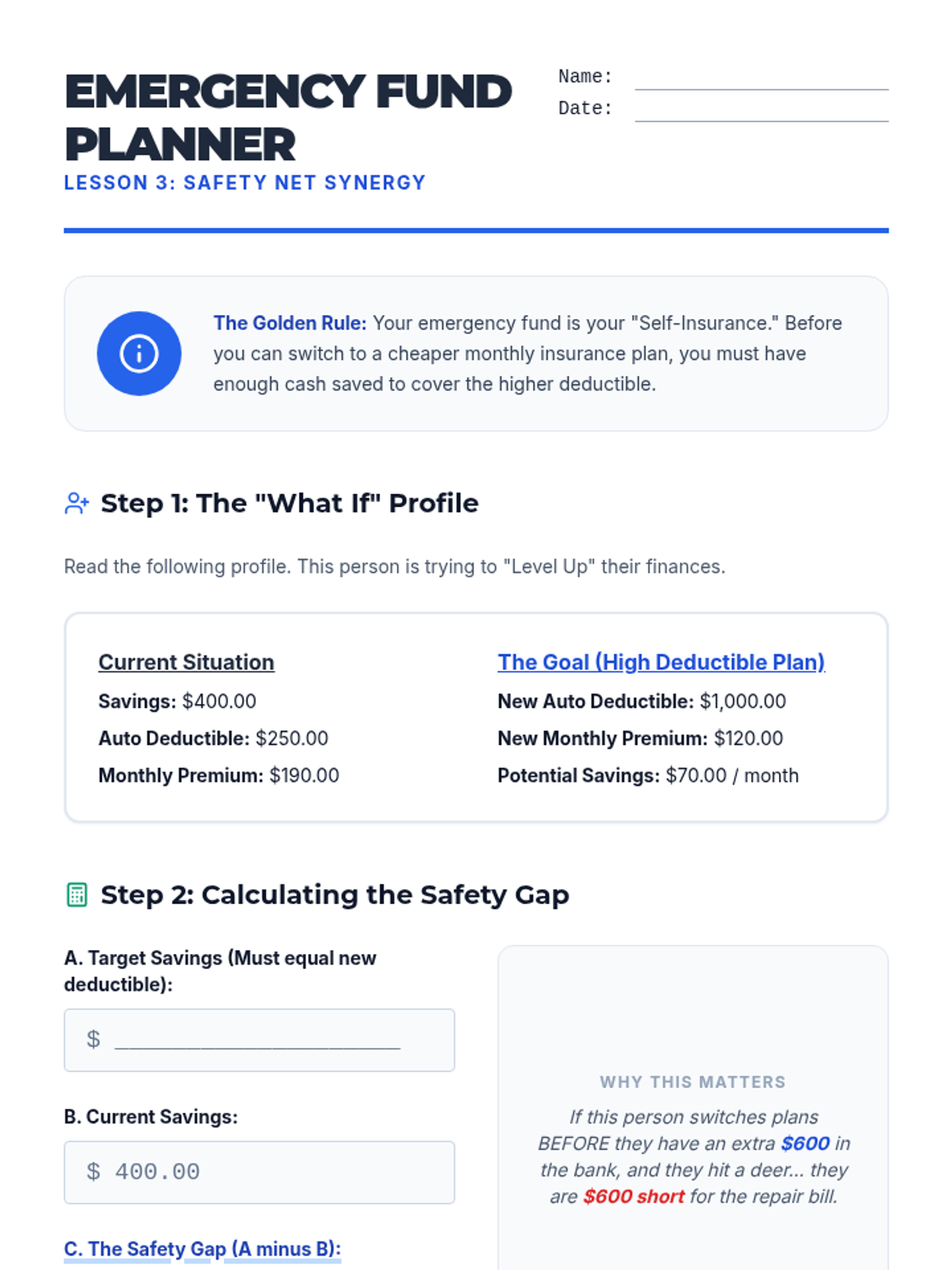 Students connect the concept of an emergency fund to insurance deductibles. They learn how a robust savings account allows for more flexible insurance choices.