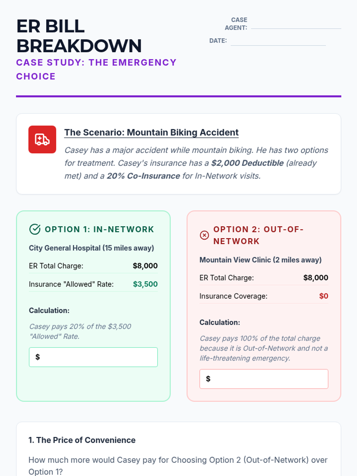 Students investigate the difference between In-Network and Out-of-Network providers. They analyze a scenario involving an emergency room visit to understand how choice of hospital affects the final bill.