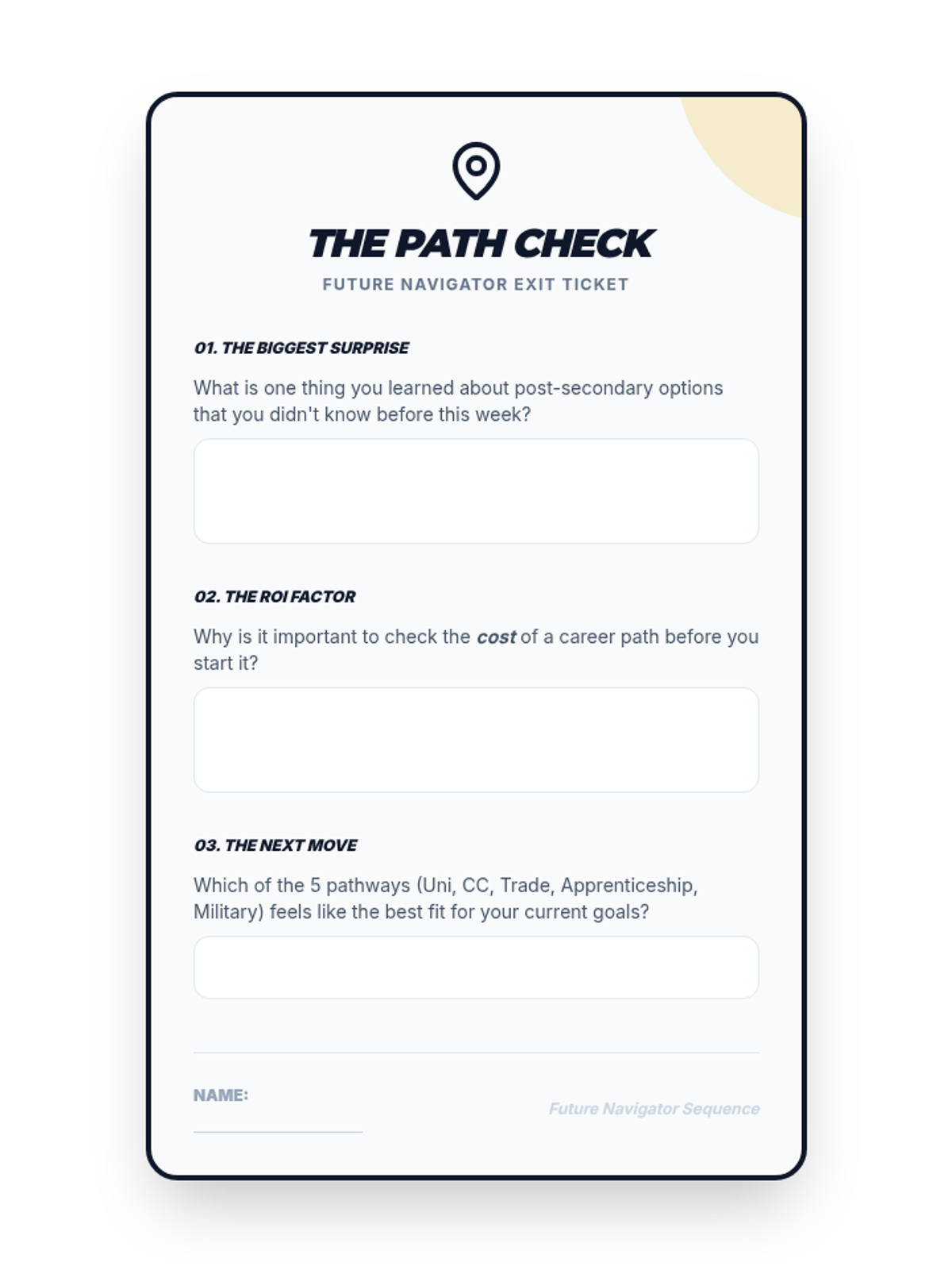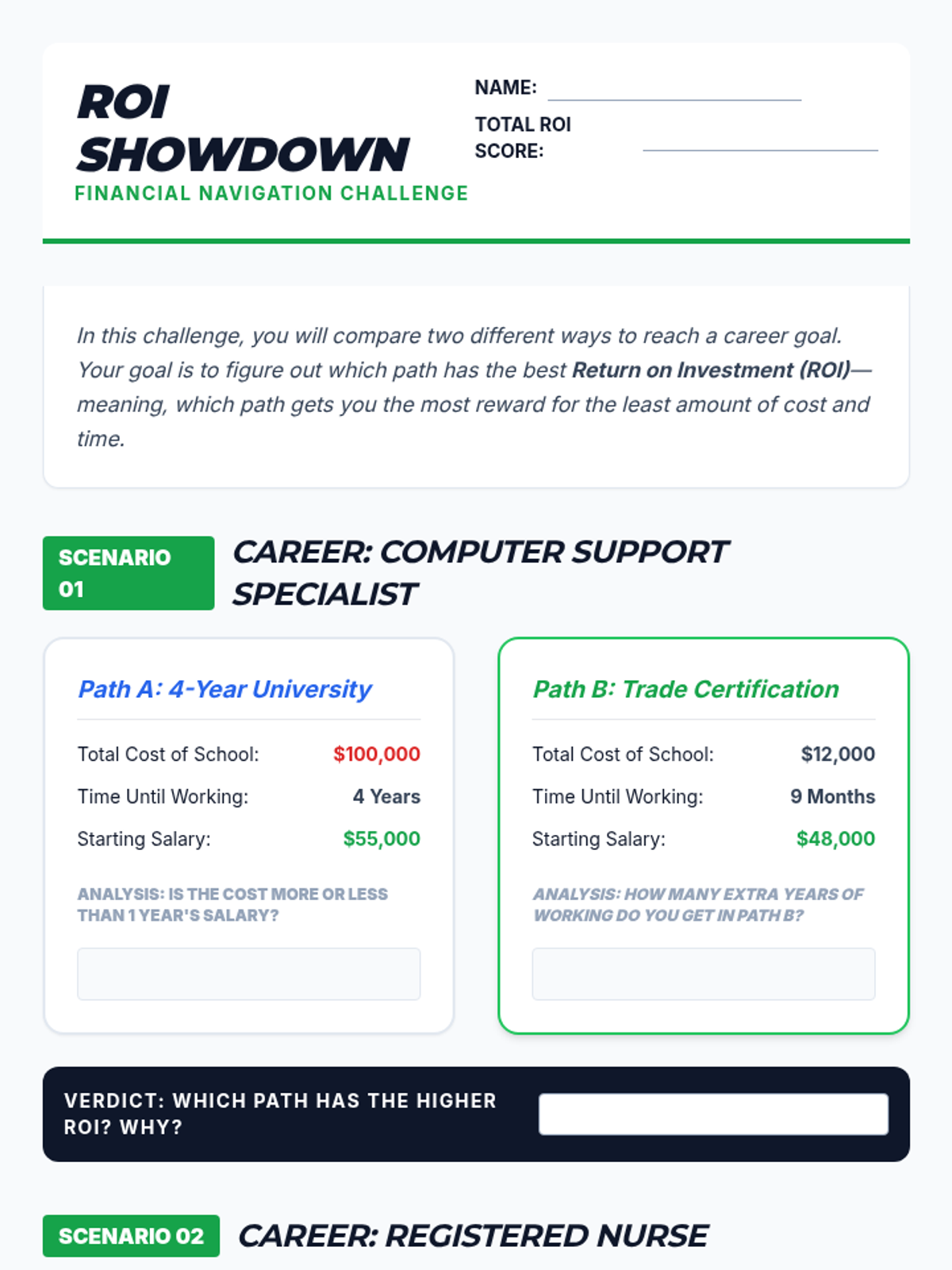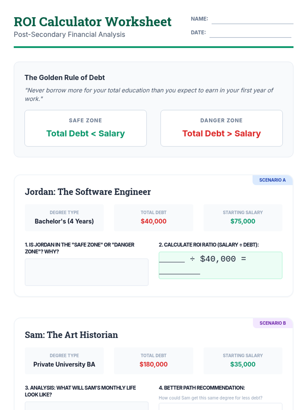 Students calculate the ROI of different education paths by comparing tuition costs and student loan interest against projected starting salaries. This math-focused lesson highlights the financial gravity of college choice.
