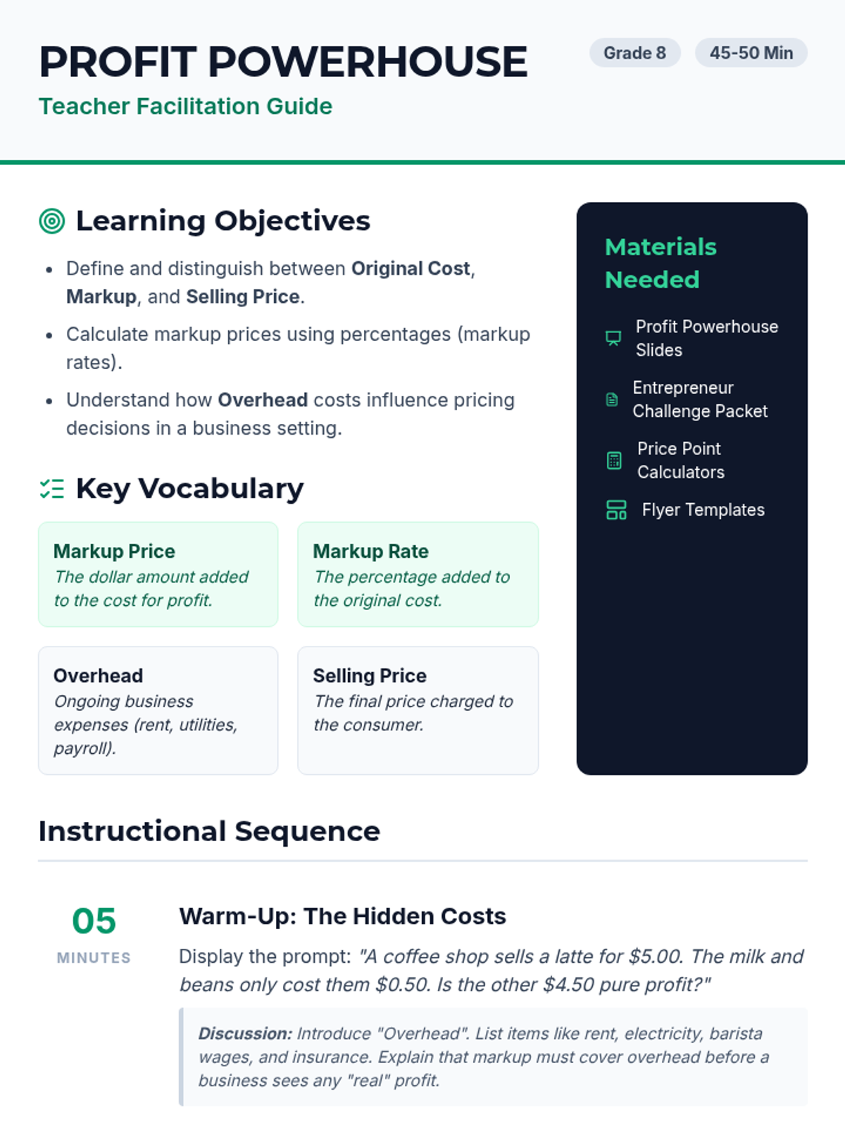 Students learn the fundamental formula for profit (Revenue - Cost) through a video, discussion, and an interactive paper-based simulation running a lemonade stand influenced by random 'Fate Cards'.